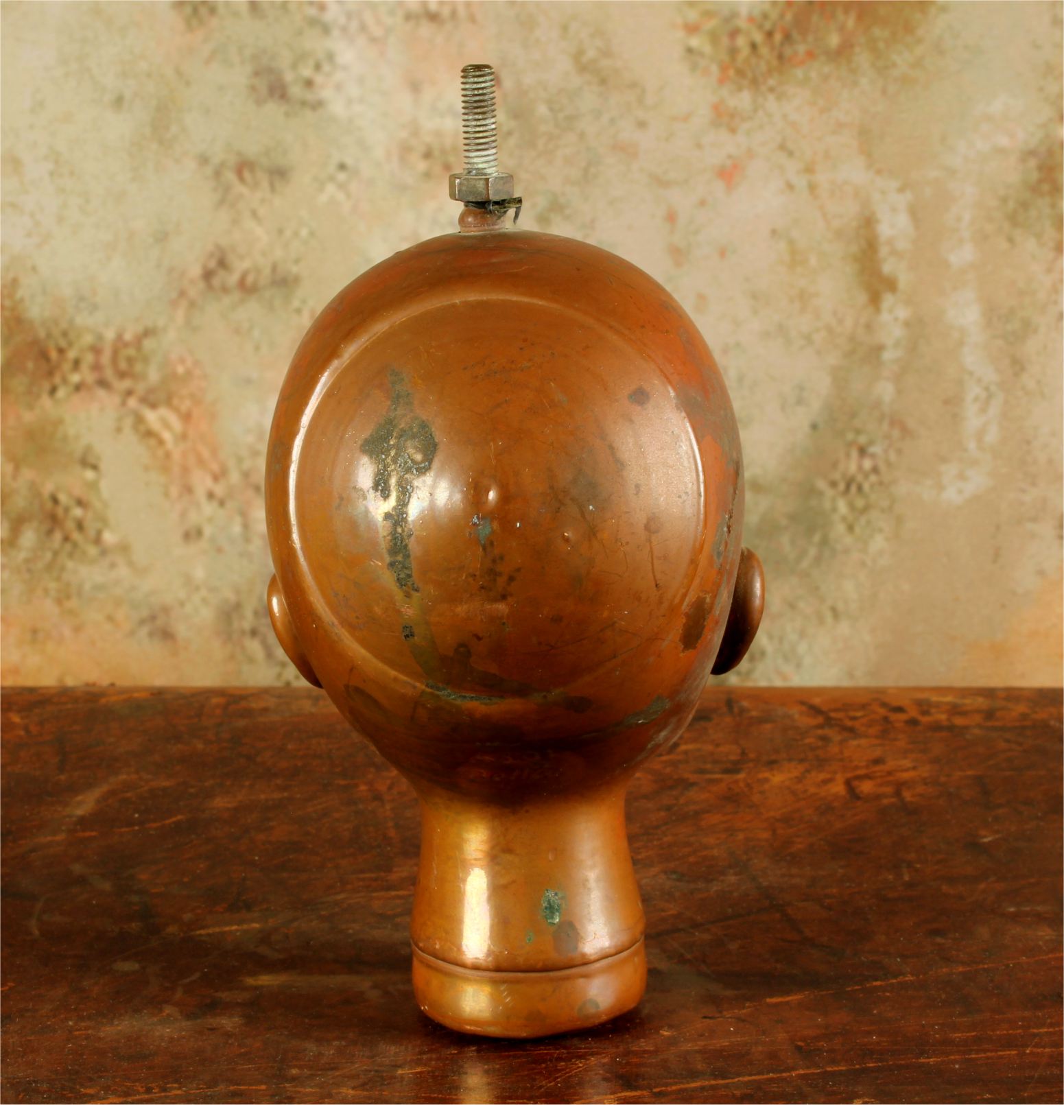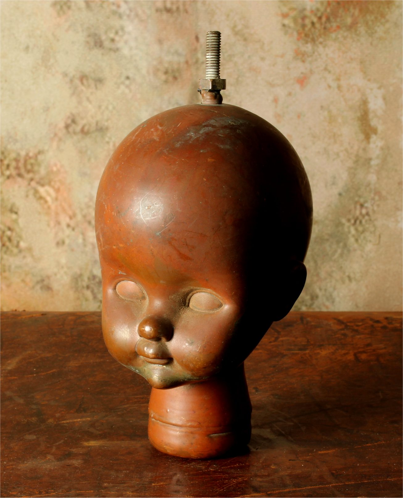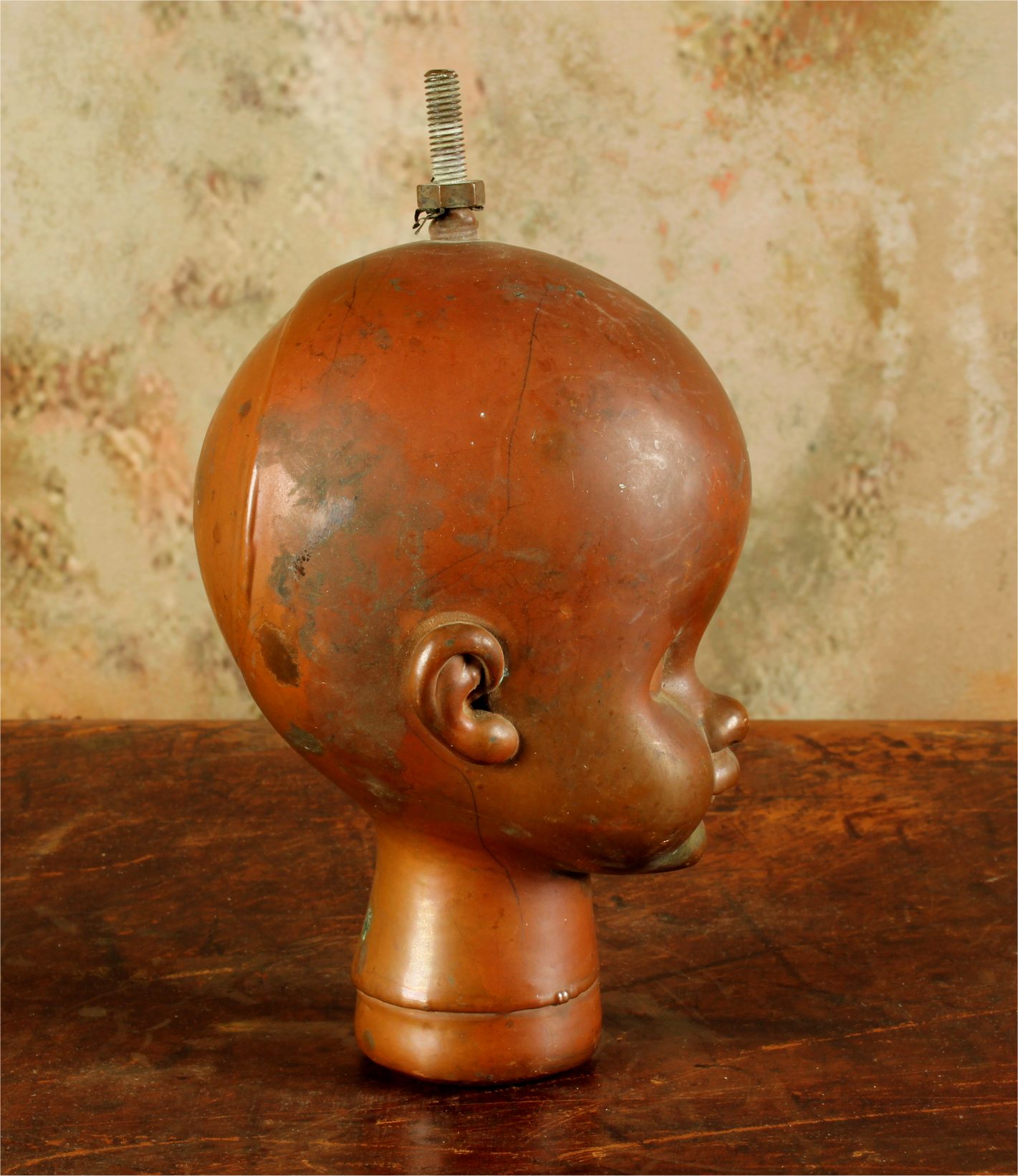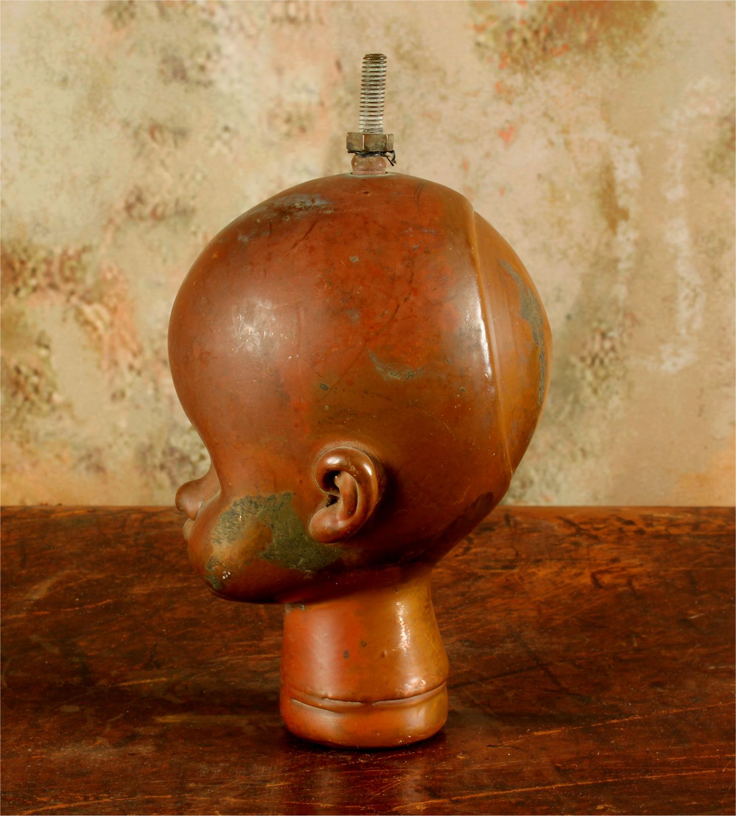 This unusual doll head mould which dates from the mid 20th century is made of heavy copper and came from Bella Doll factory in Perpignan, France.