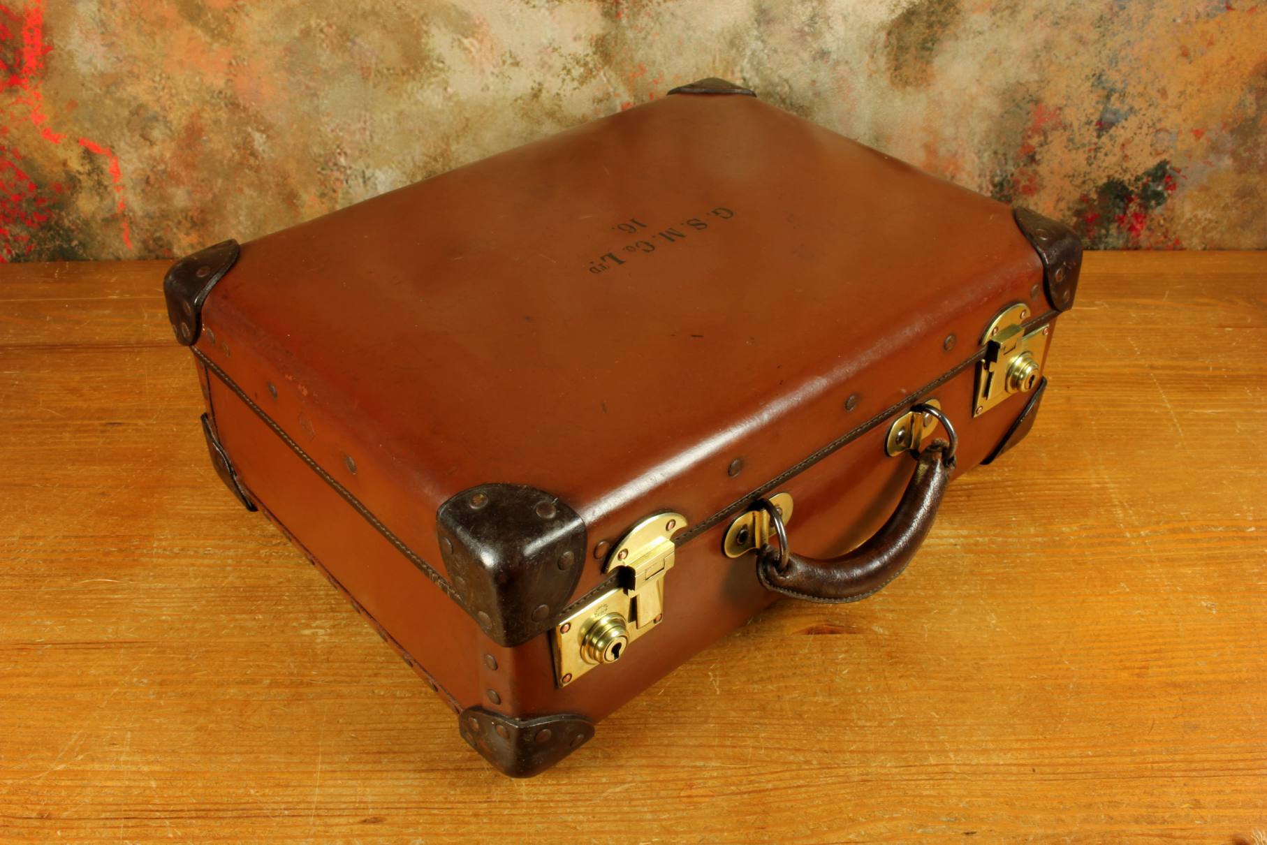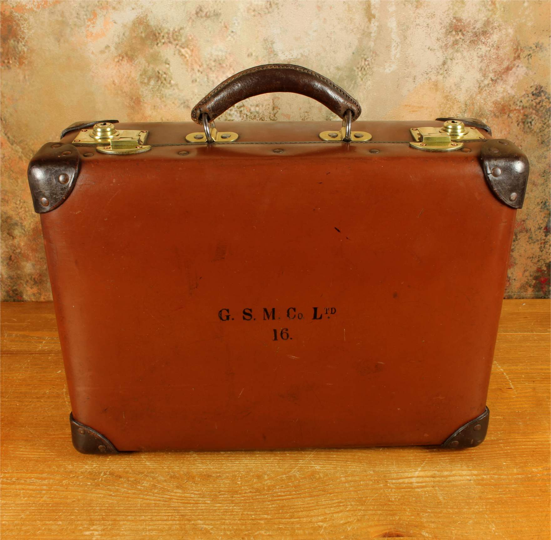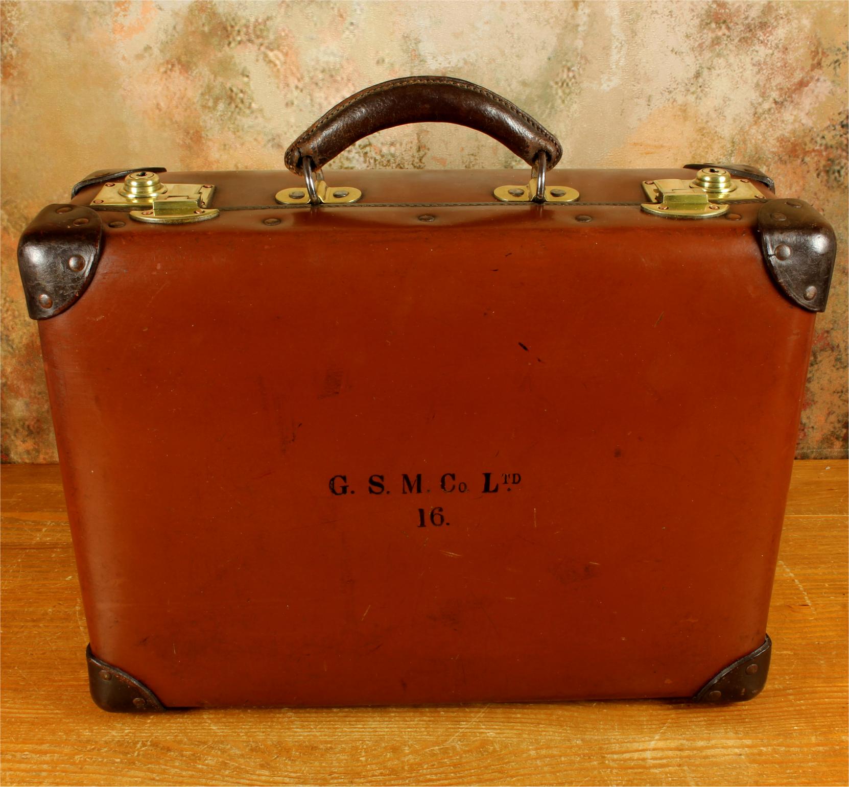 The inside of the case is in beautiful condition and fitted with a tan lining with a folio compartment. The outside is embossed with G.S.M. Co Ltd. 16.