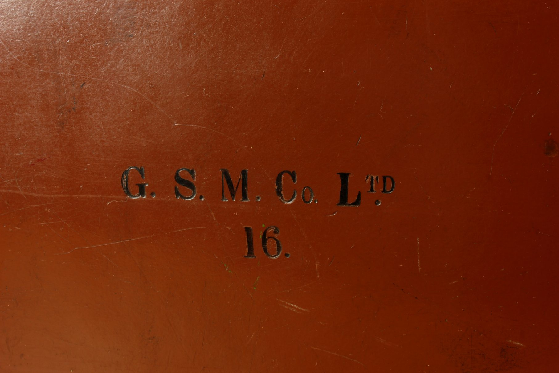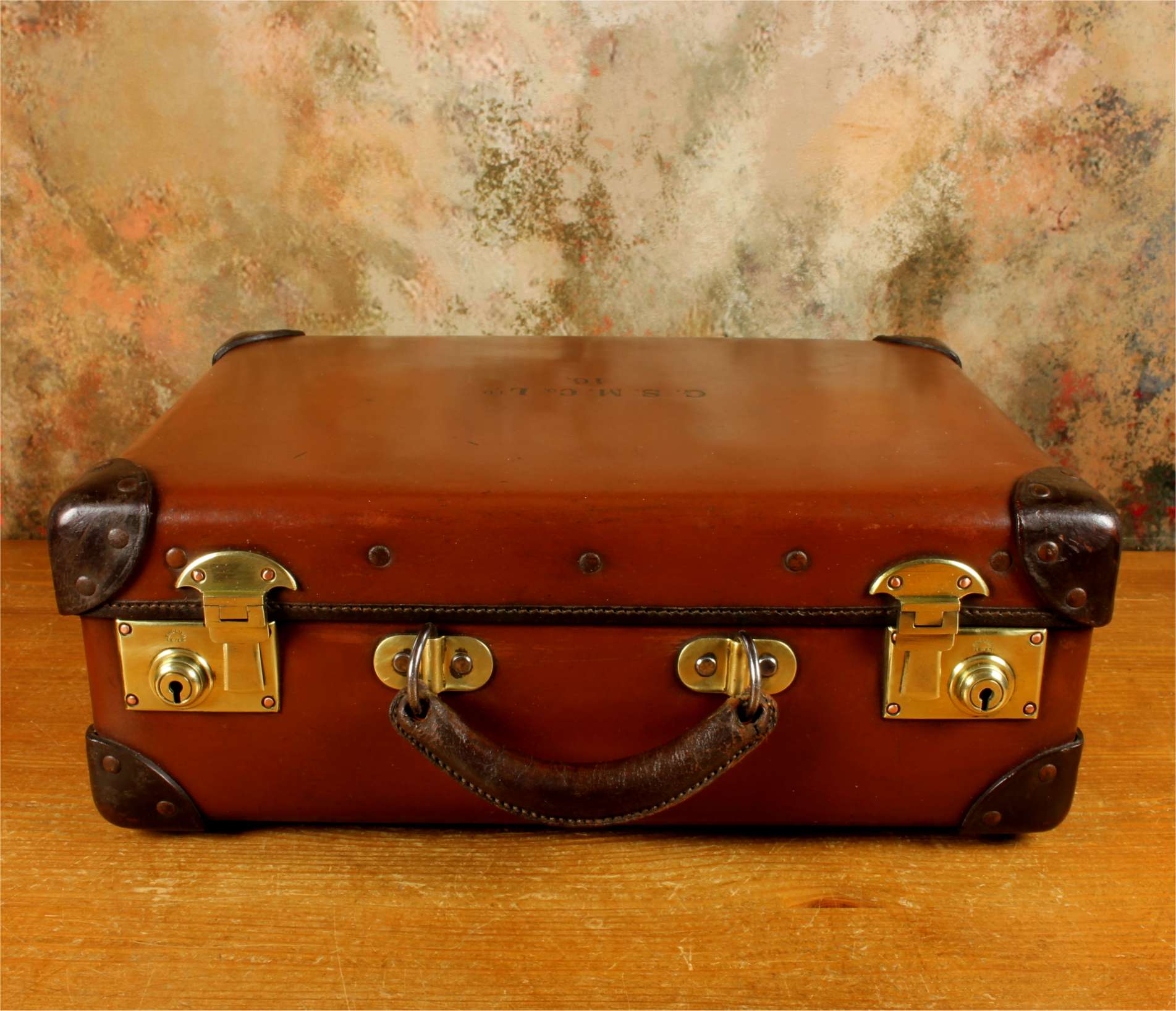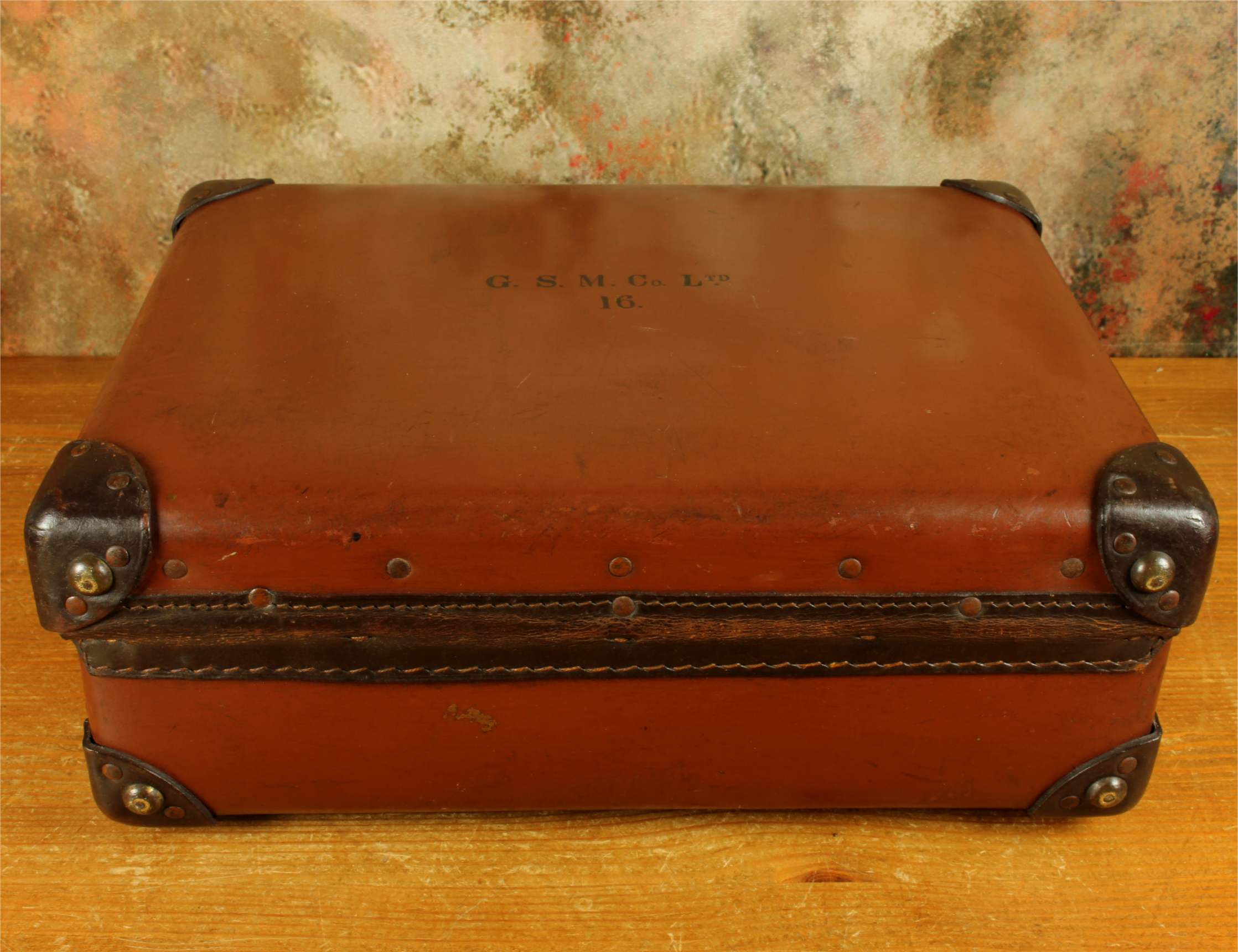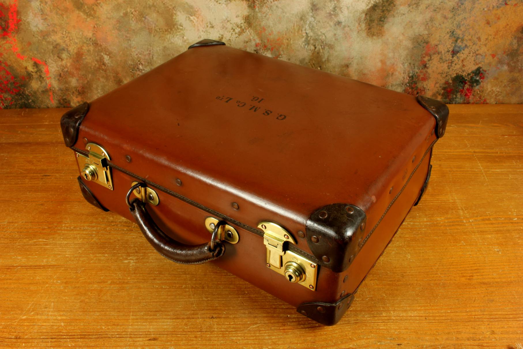 The inside of the case is in beautiful condition and fitted with a tan lining with a folio compartment. The outside is embossed with G.S.M. Co Ltd. 16.