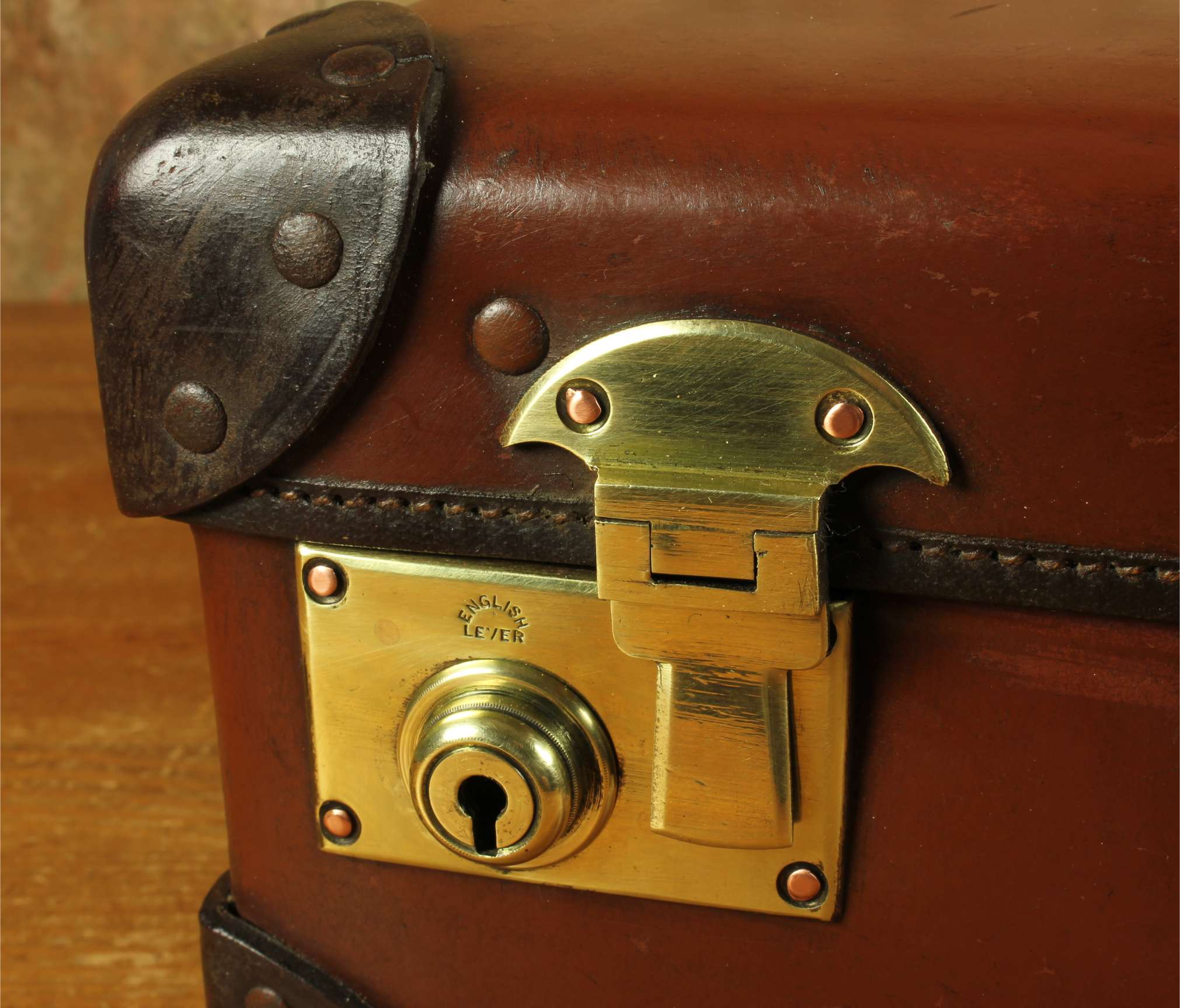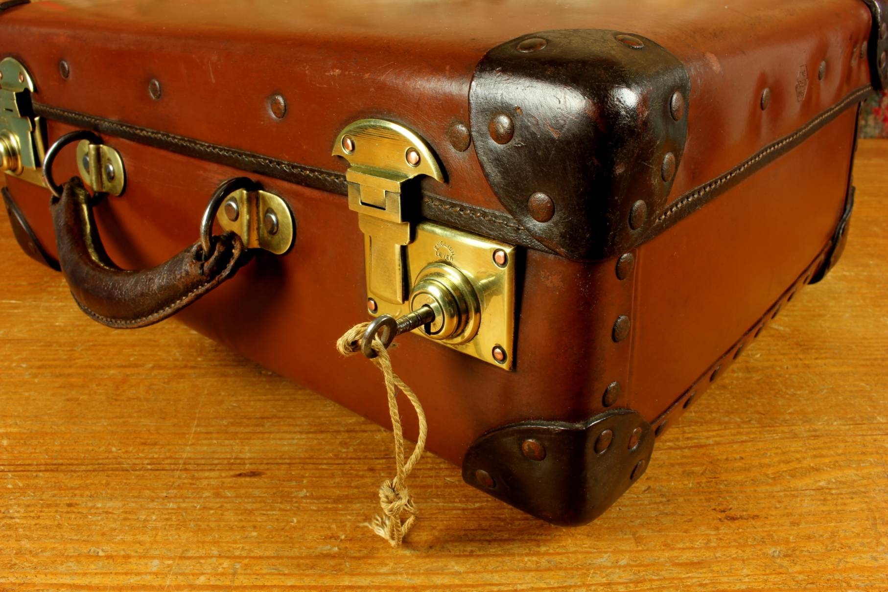 This vintage / antique attache case is strong, durable, lightweight and fire retardant being made from vulcanised fibre, has studded corner strengtheners, a stitched leather metal reinforced handle with sturdy brass fittings, two brass locks/clasps which are marked English Lever and we have the key.