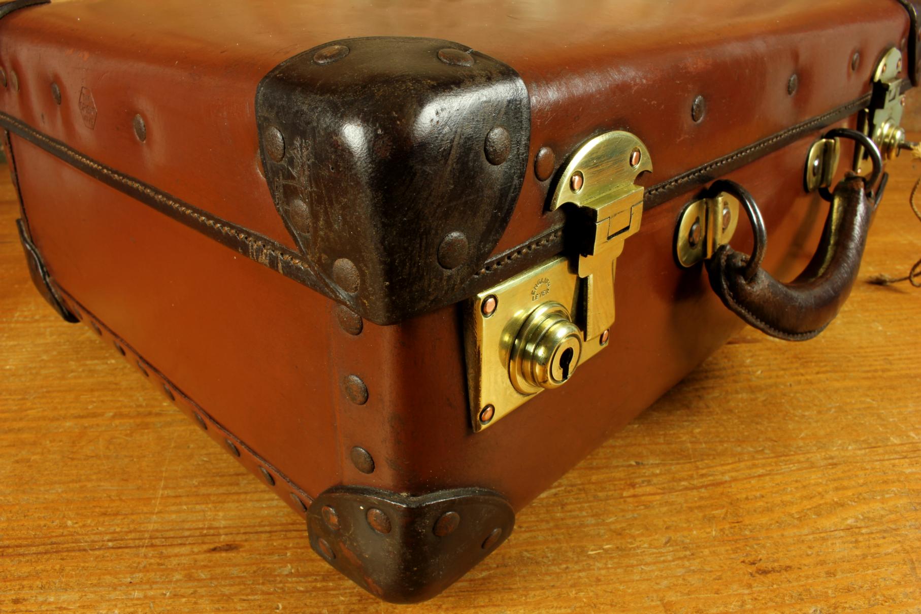 Condition: Excellent used vintage condition with signs of use in keeping with age. The case is very sound and usable with good stitching, strong handle and corners.Some marks, general wear and some cracking to the leather handle. Lock clasps work and we do have the key. Please see pictures.