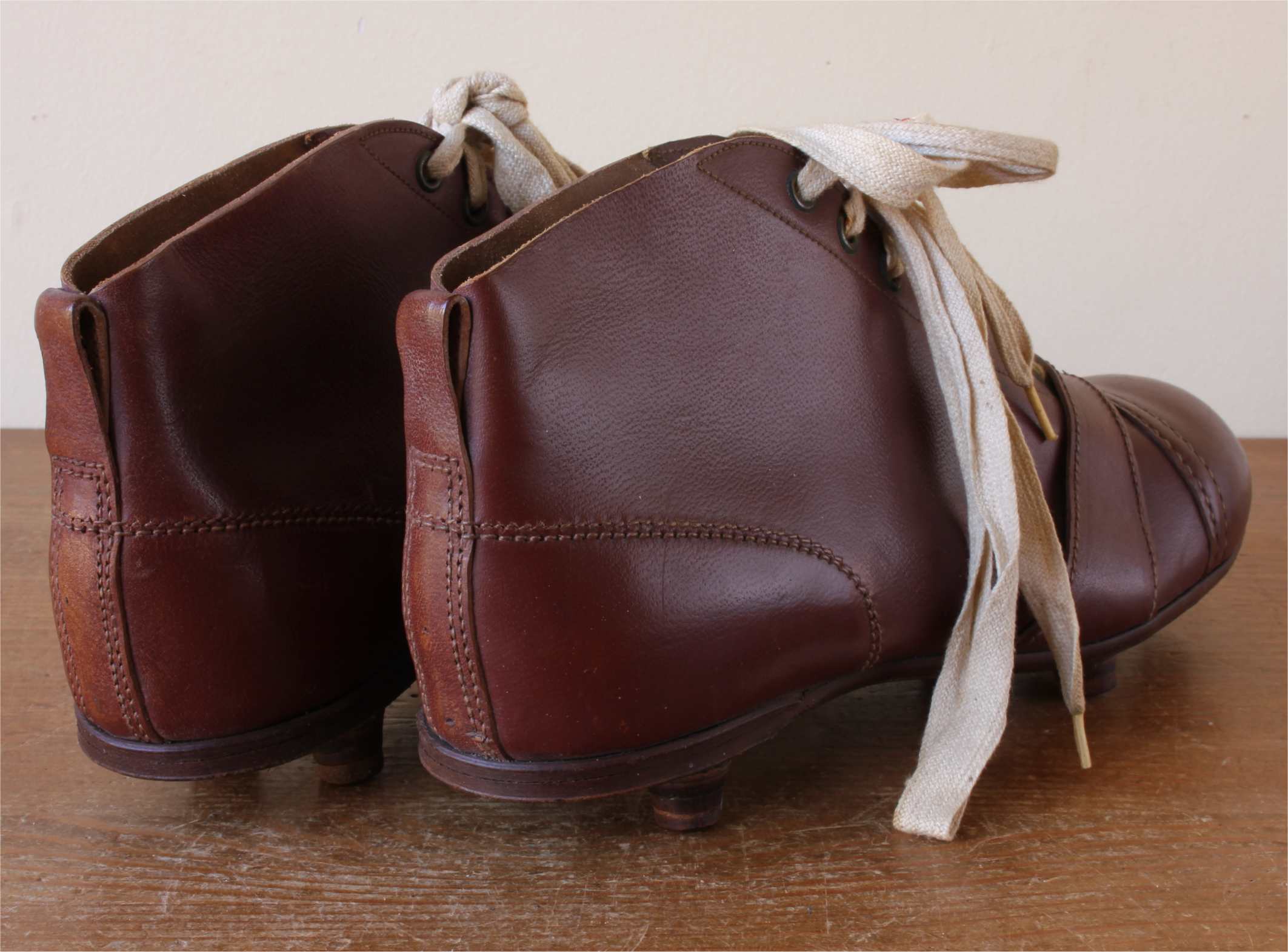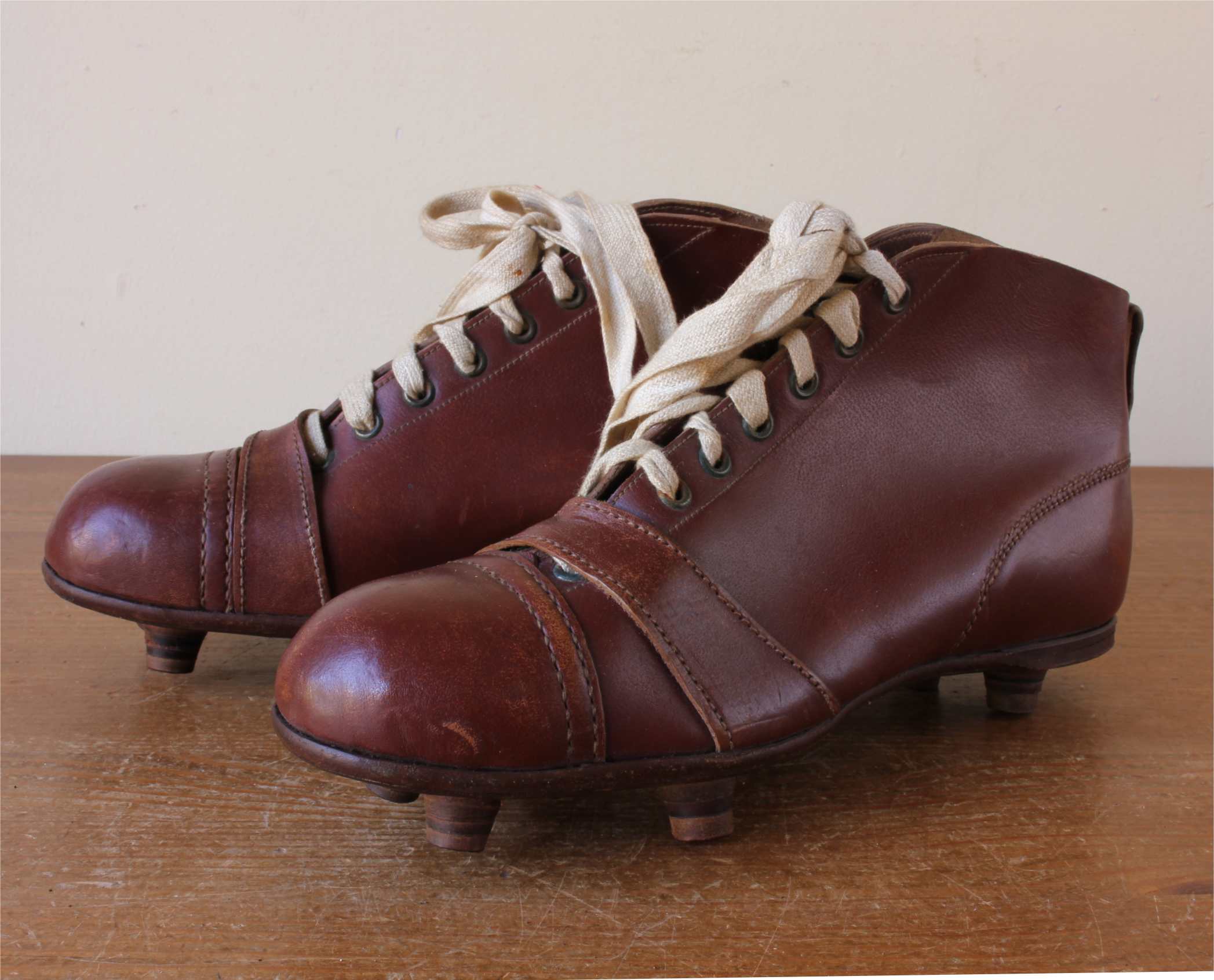 This handsome pair of vintage football boots which date from c1950 are made of brown leather with leather soles, nailed on studs and the soles are stamped with the size 8.