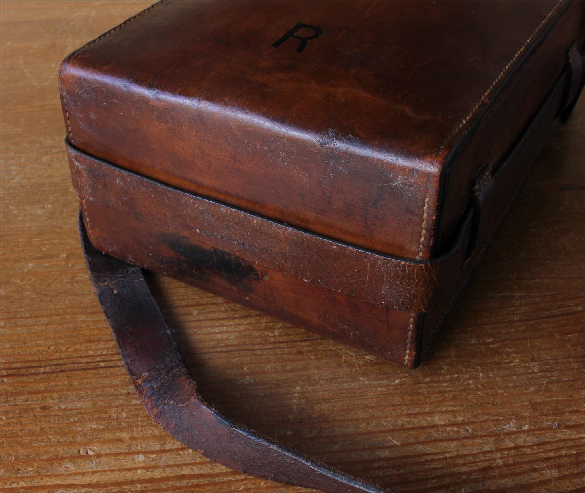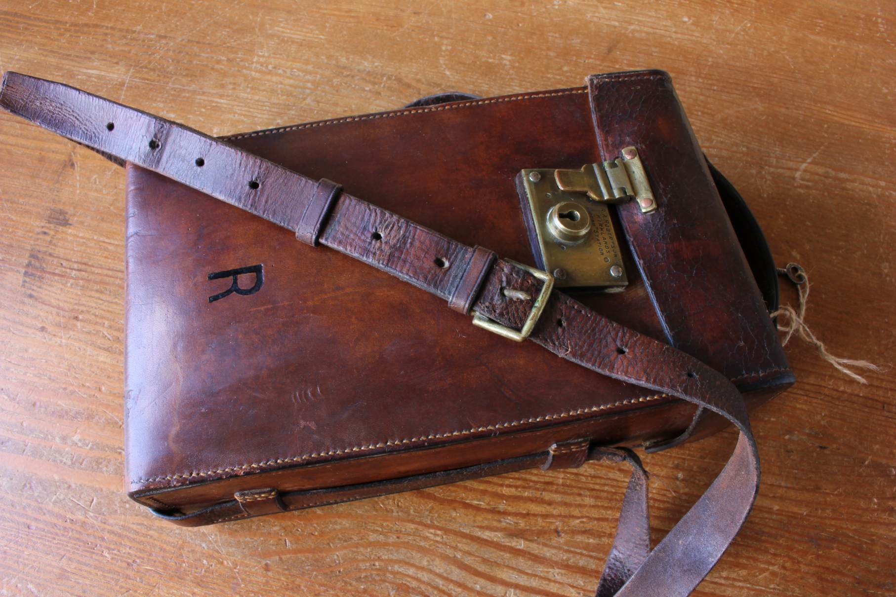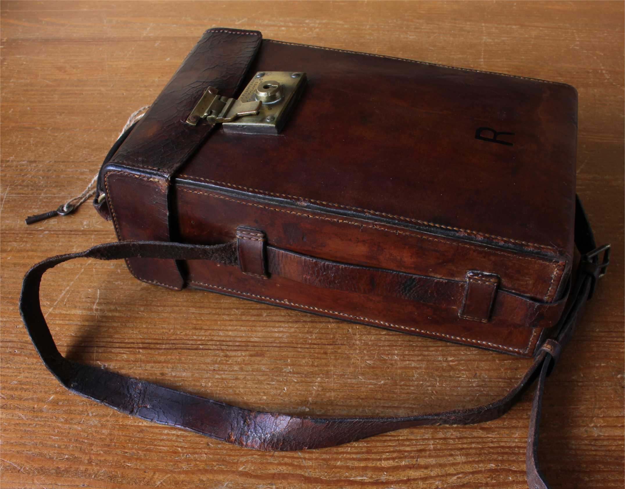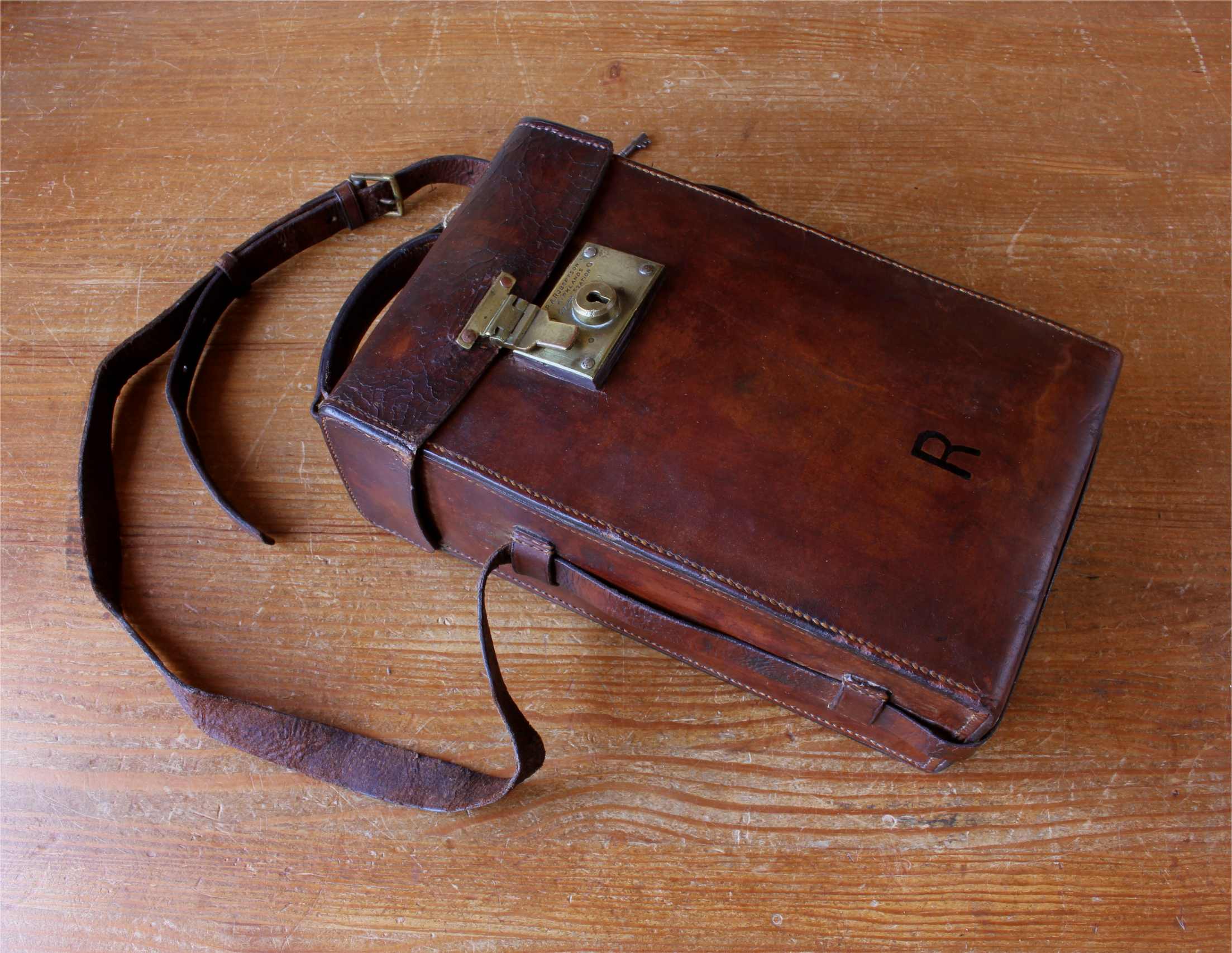 This handsome case is made of thick dark tan leather which is monogrammed with an R to the front, has a long shoulder strap, top carrying handle and a brass lock which can be opened and locked using the key.