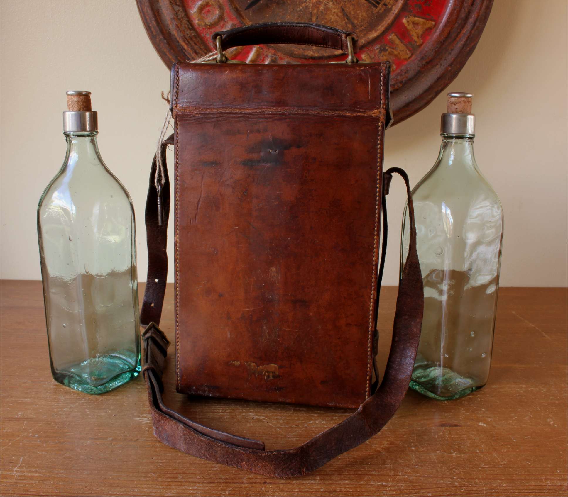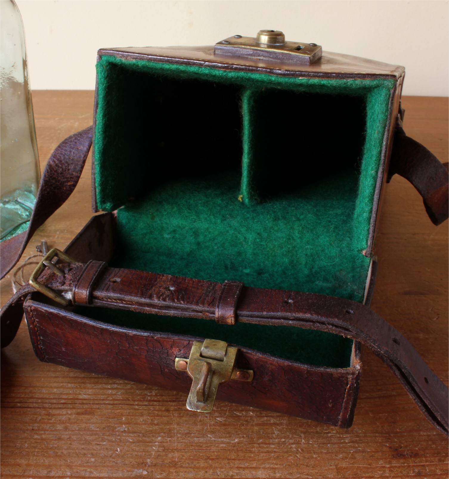 This case comes complete with it's two large glass whisky bottles which have white metal collars and corks ends. These bottles are made of beautiful old green glass which show their bubbles and swirls from manufacture, are square in shape and are marked to the bottoms with Walkers, Kilmarnock Whisky and with their batch numbers. These fit snugly and safely inside the leather case which has an inner partition to keep the bottles separate.
