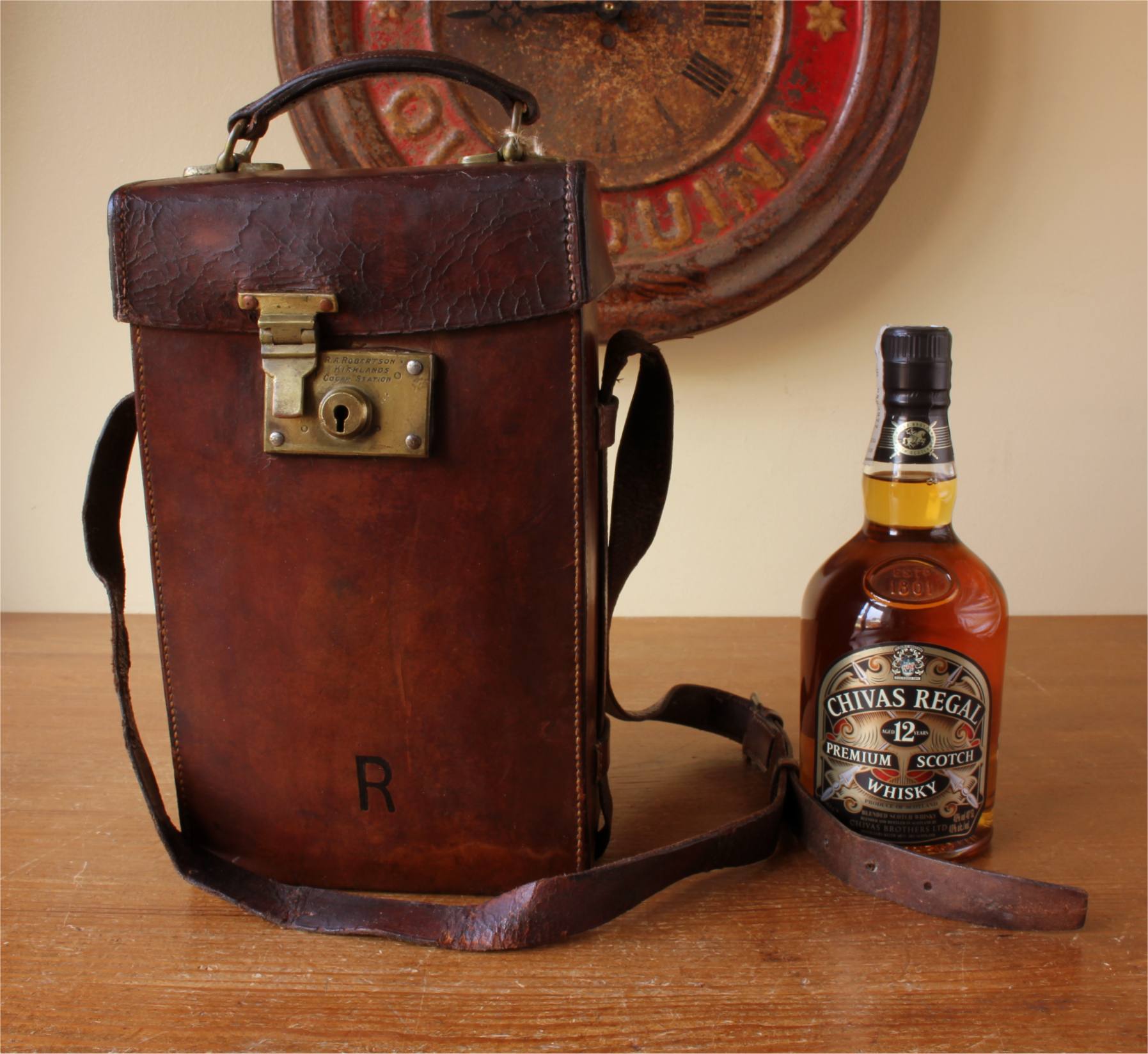 Marks: Engraved to brass lock with: RA Robertson Kirklands Gogar Station. Marked to bottoms of the two Whisky bottles with Walkers, Kilmarnock Whisky and their batch numbers or 1800 and 1915.