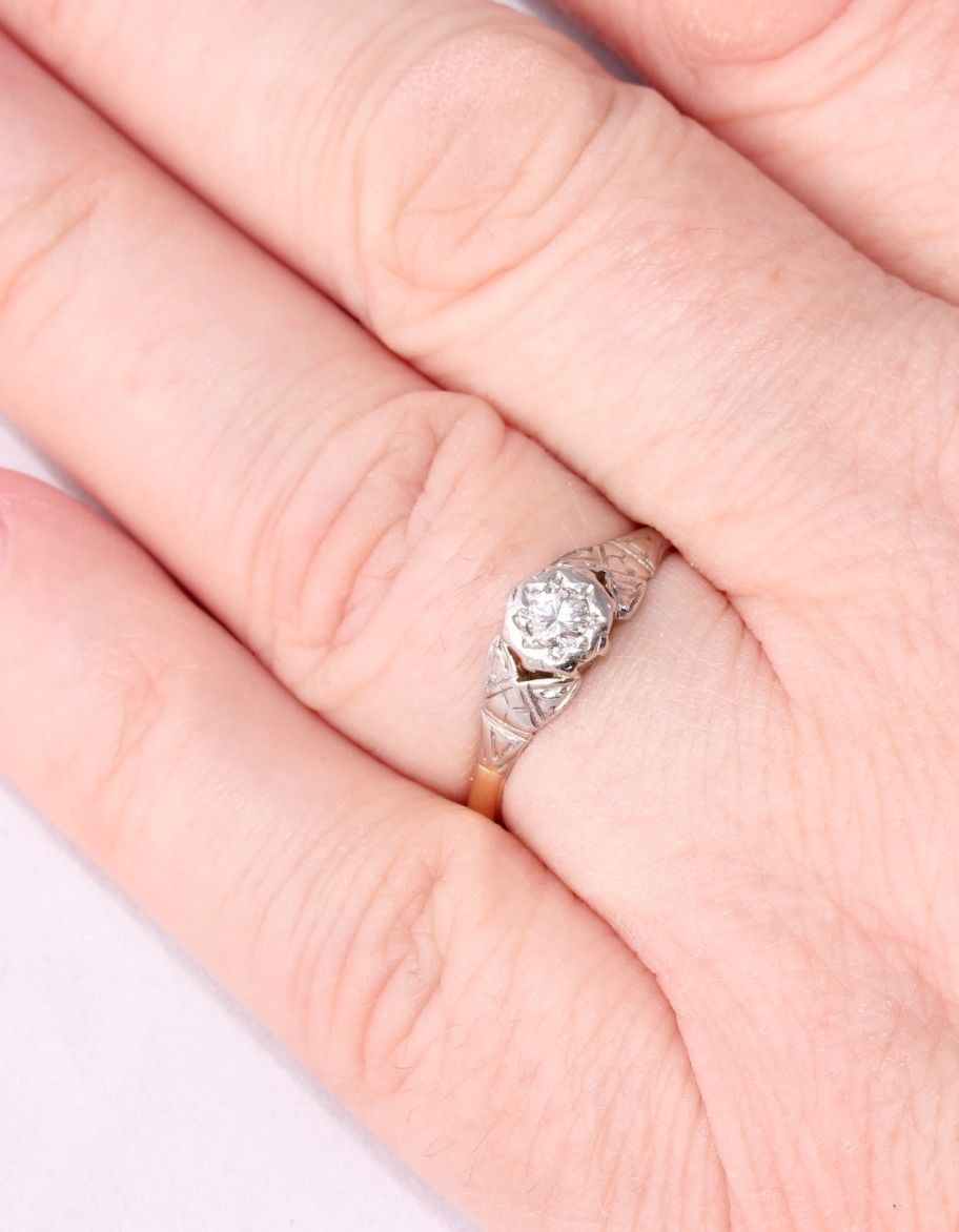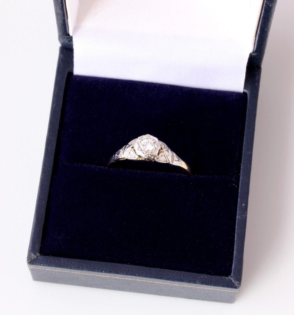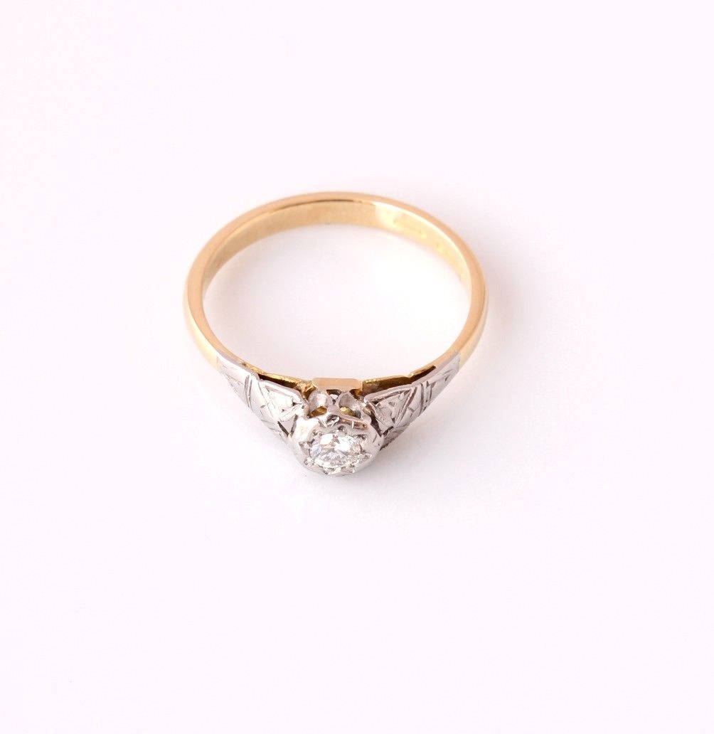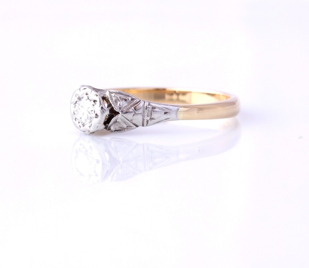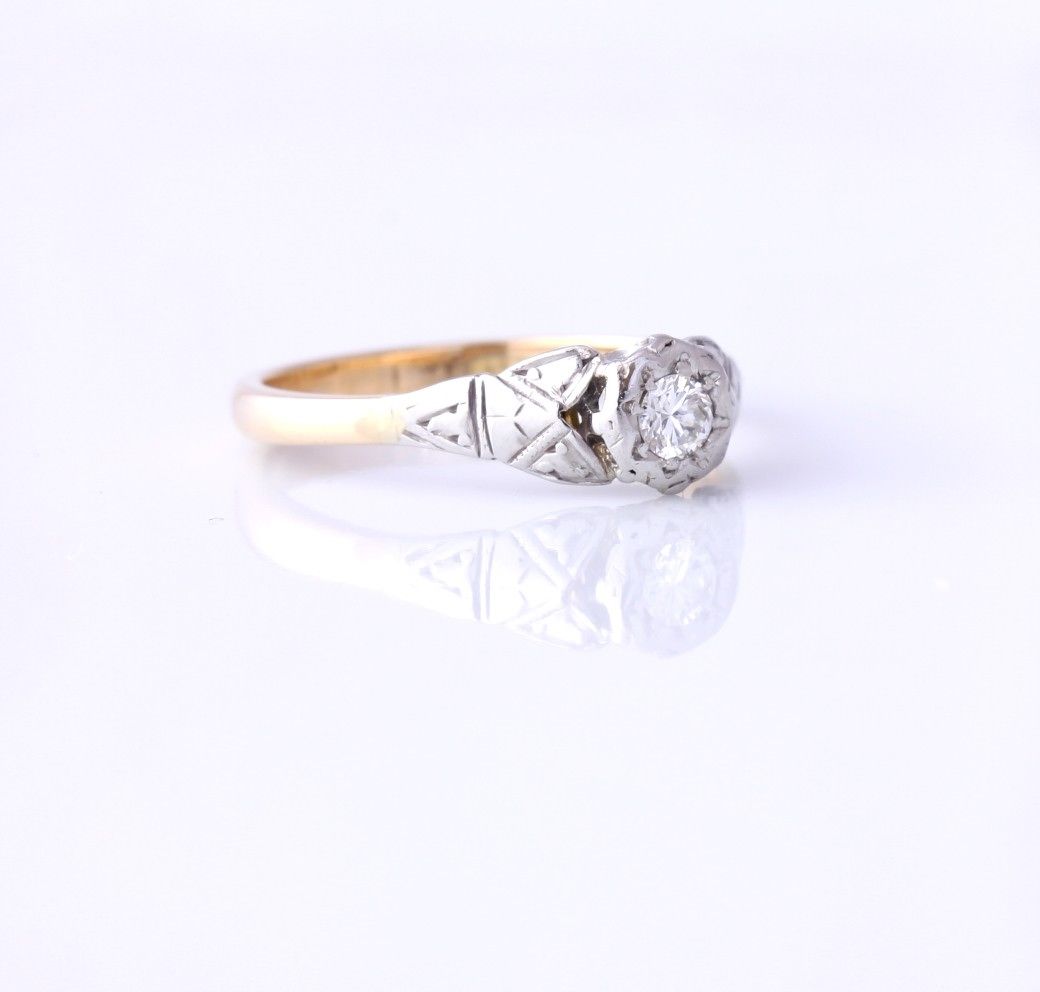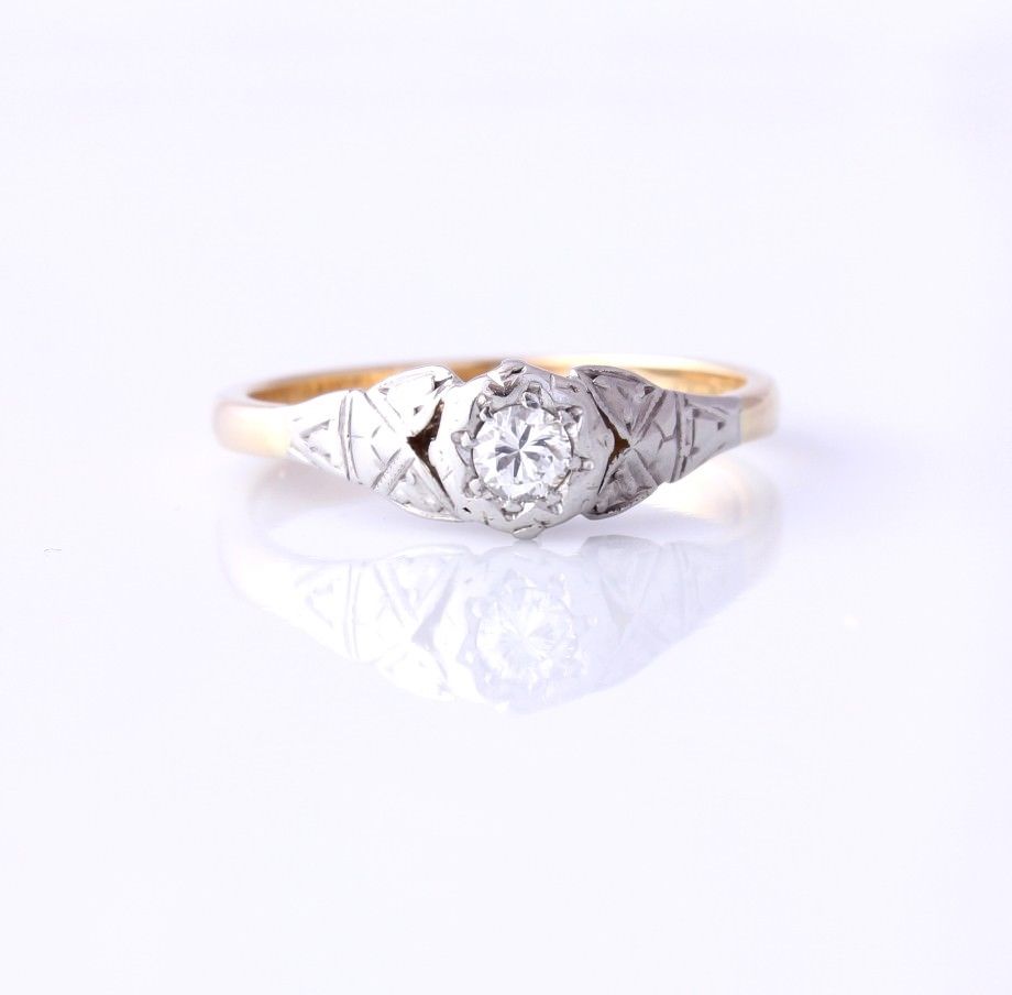 This beautiful Art Deco style ring is crafted in 18ct yellow gold and is set with a brilliant-cut natural diamond of 0.10 cts in a Platinum illusion setting. The diamond is sparkly, bright and this would make a really wonderful Engagement ring.