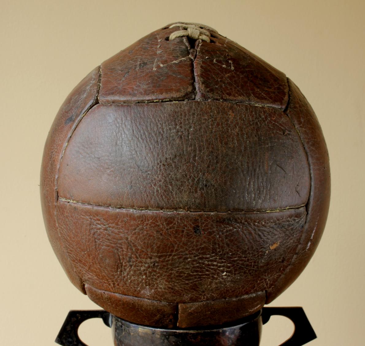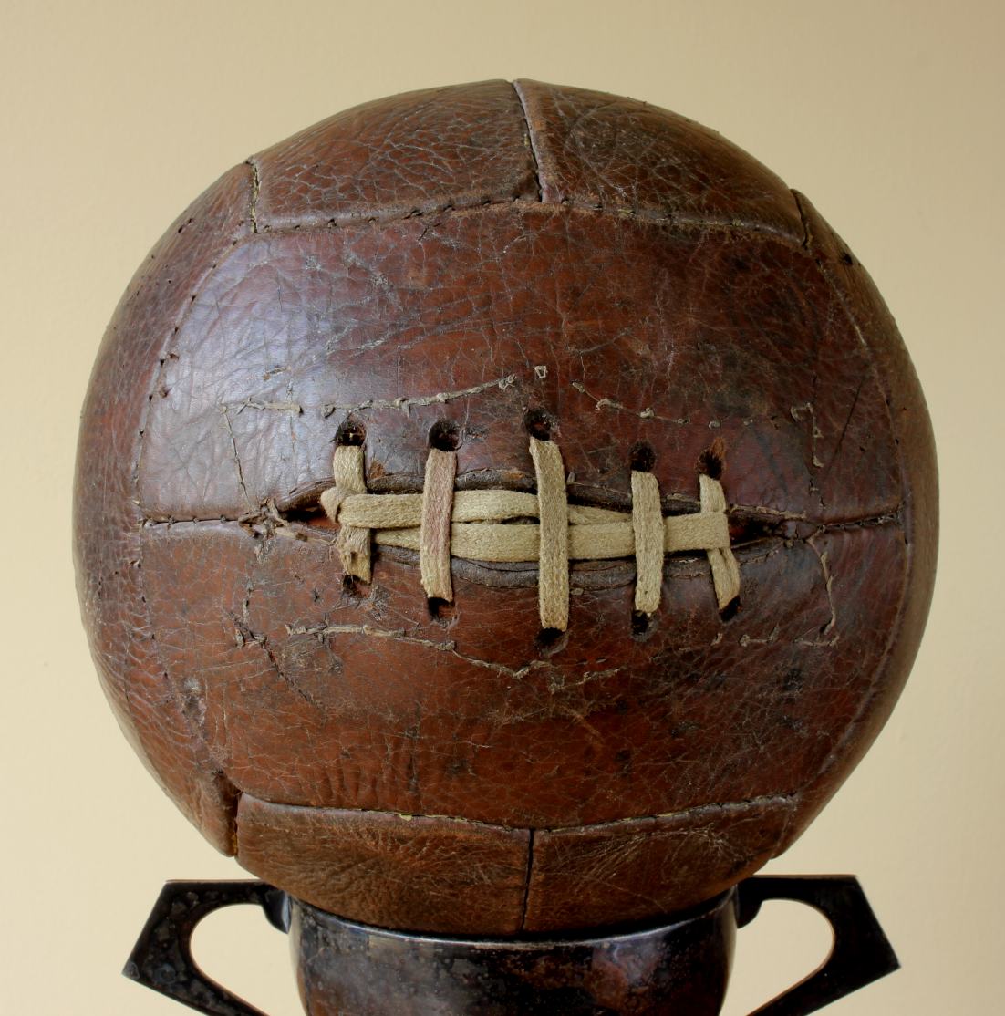 This antique brown leather football is a 12 panel ball with 5 pairs of lace holes and is fitted with an inflatable bladder which is holding air. The ball which dates from c1930 has lots of age related wear and a great patina.