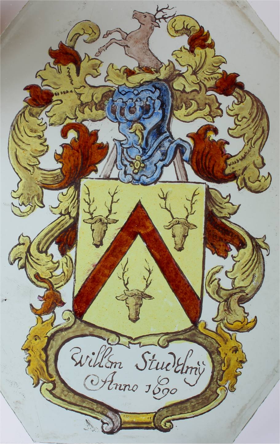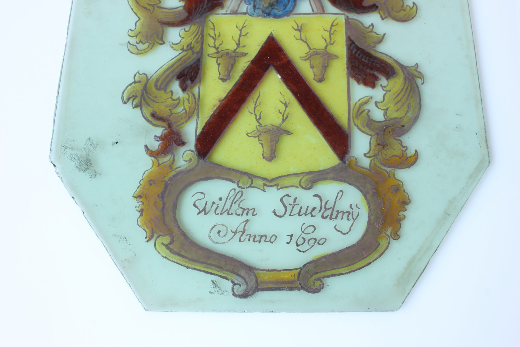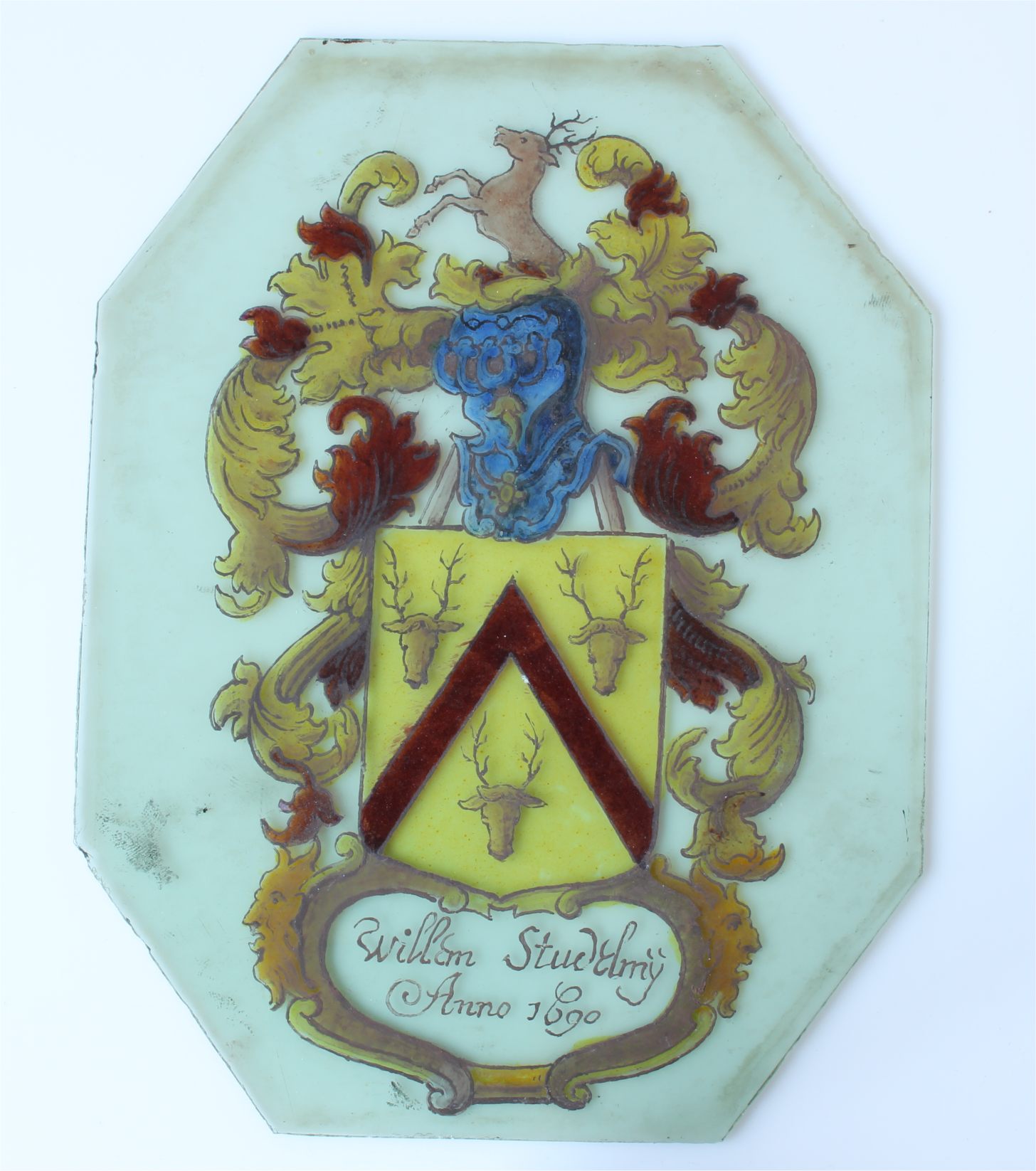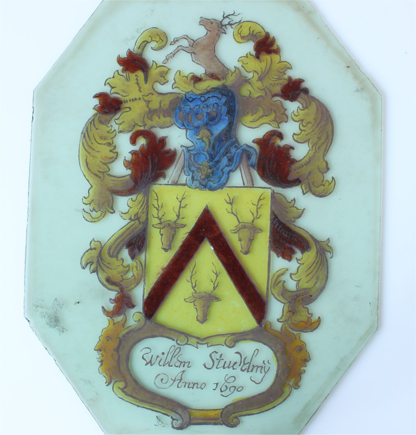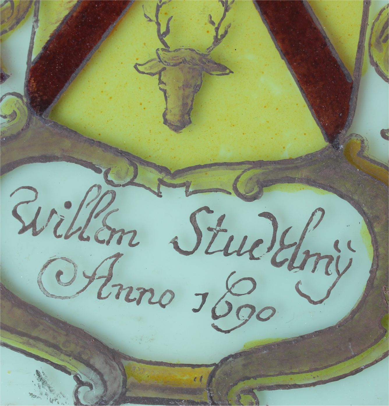 This excellent quality antique stained glass window panel which dates from 1690 features the Coat of Arms for Willem Studelmy and has beautiful hand painted deer, faces and floral decoration. This crest also has the name Willem Studelmy and Anno 1690 shown as part of the crest.