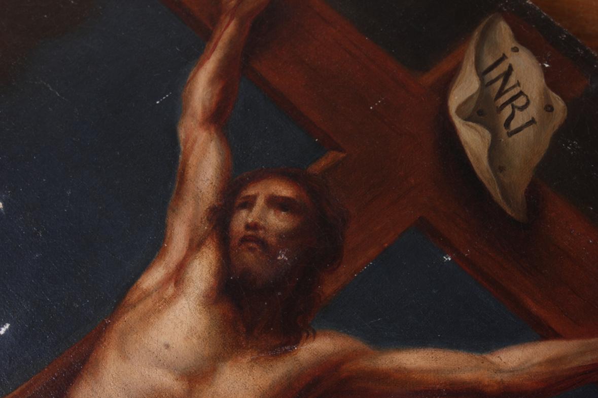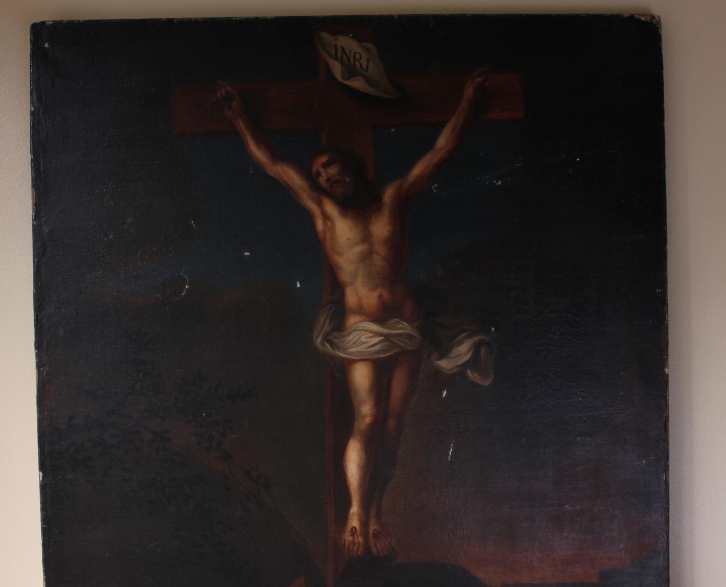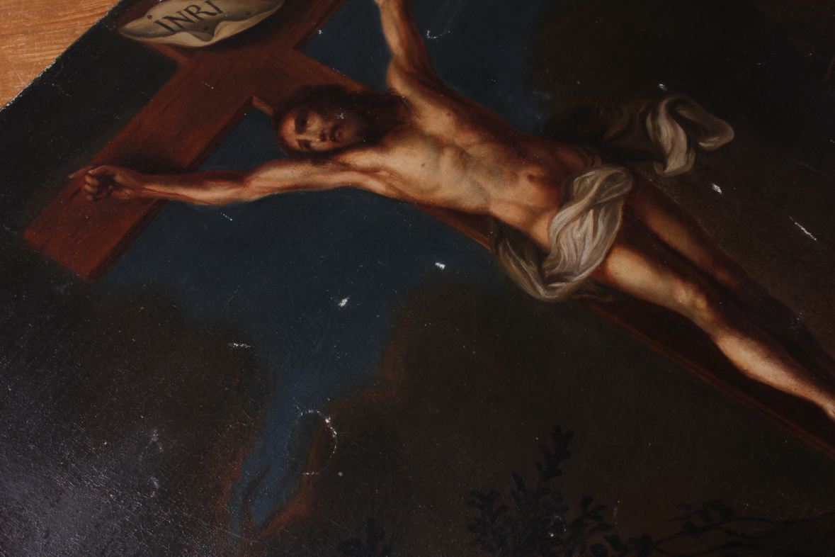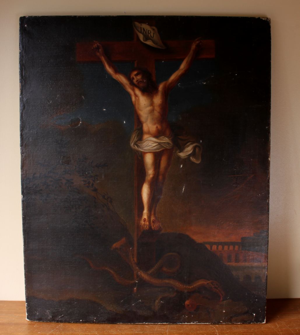 This large French oil painting of the crucifixion of Christ dates from the late 18th / early 19th century and has been skilfully painted using oils on canvas.