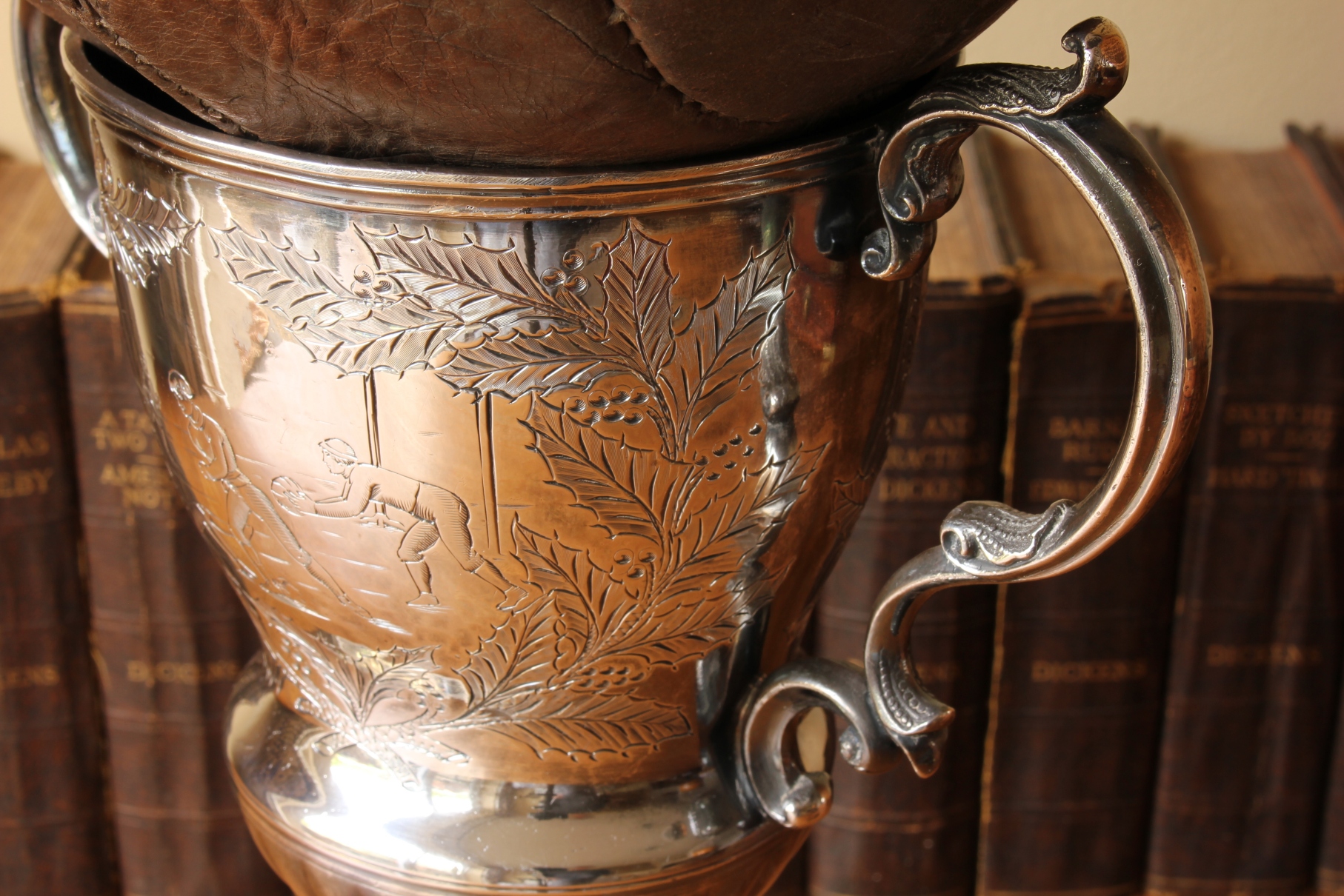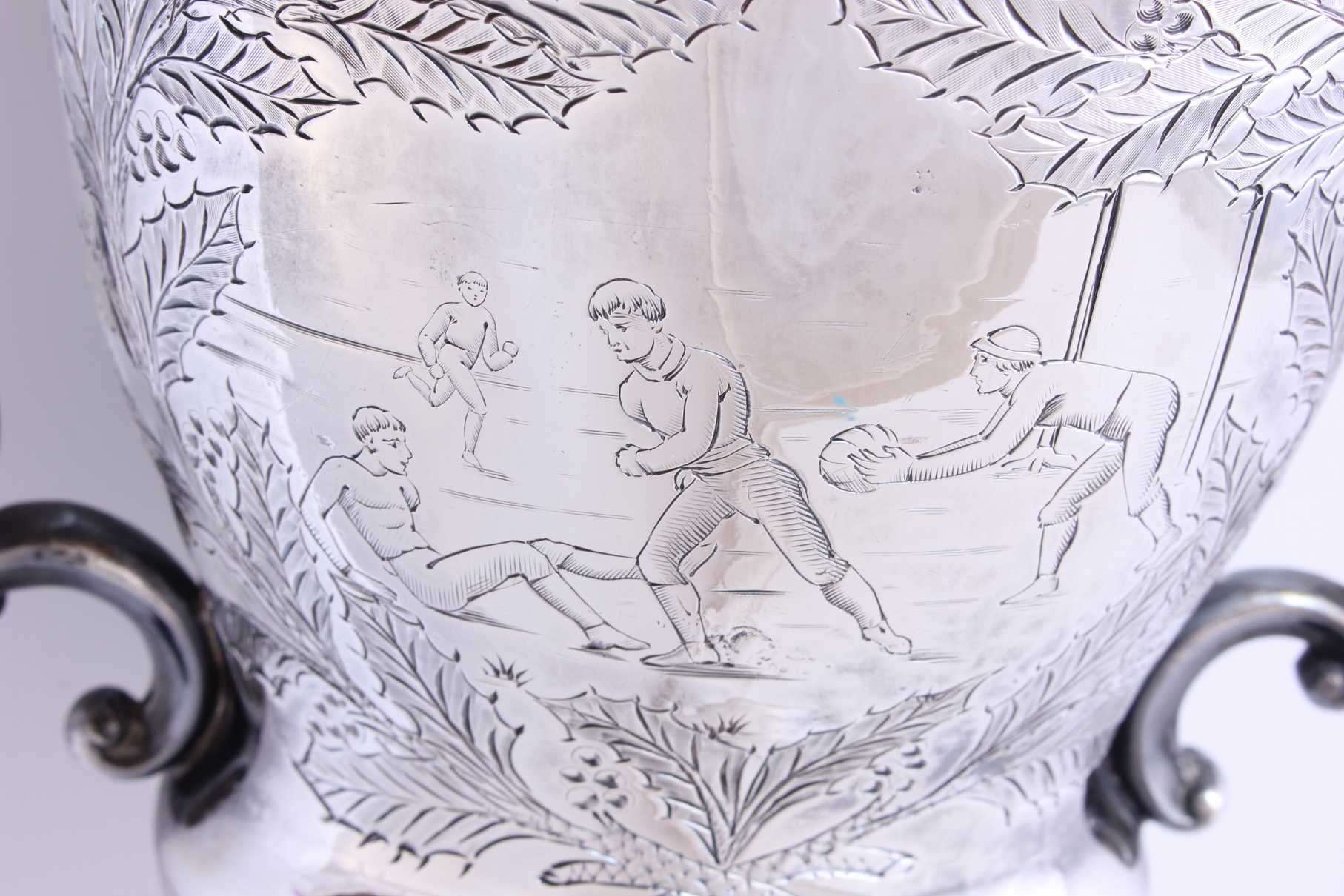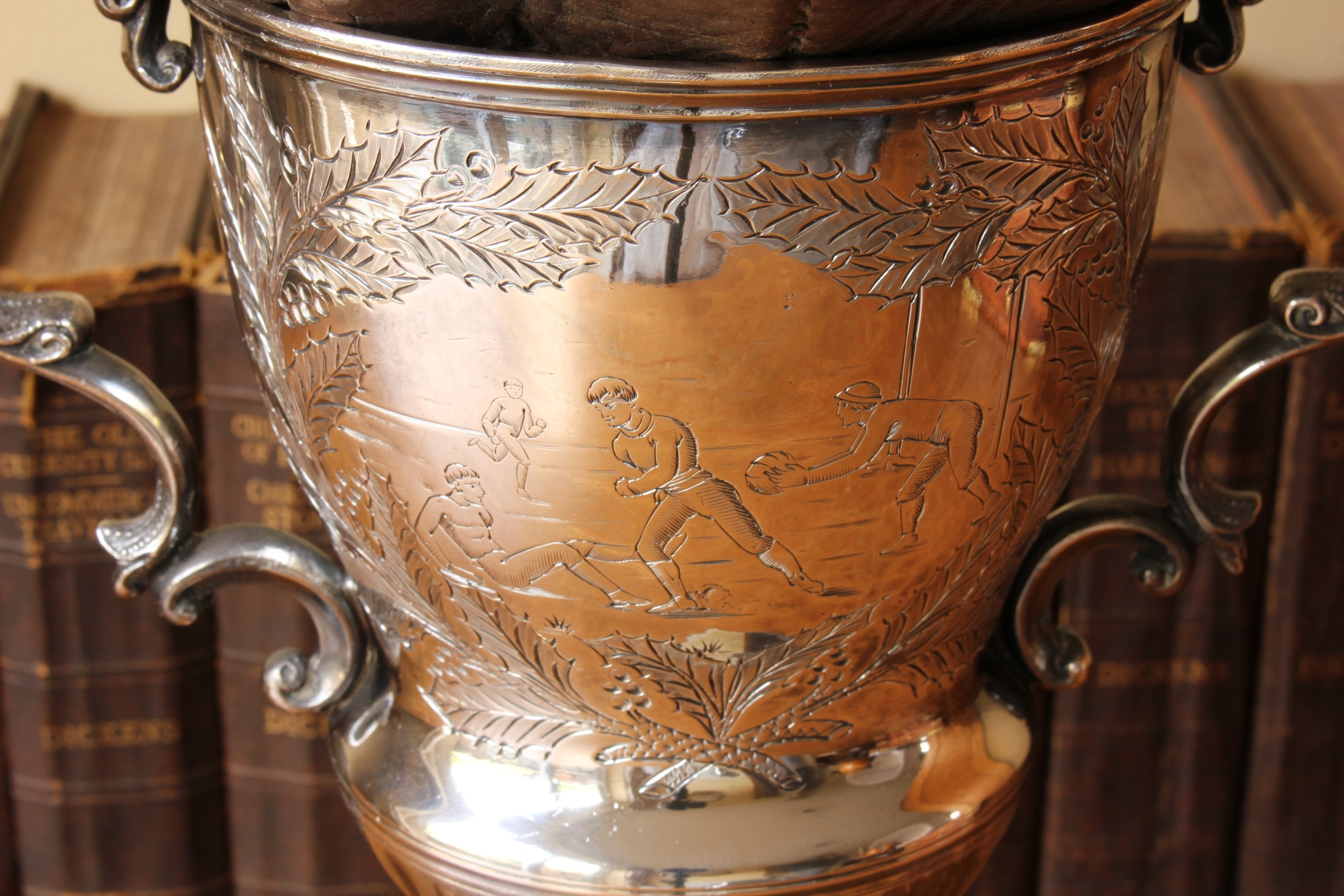 This large, heavy and impressive football trophy cup which dates from 1886 has a fine original engraving to the front of an early football game which really depicts the way the game was played in the Victorian times. The trophy also has leaf decoration around the top, base and two handles with the date 1886 engraved to the back.