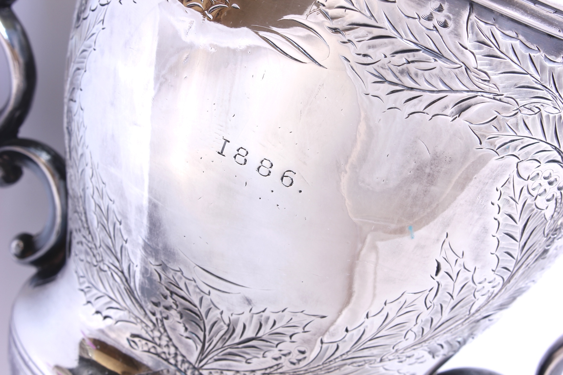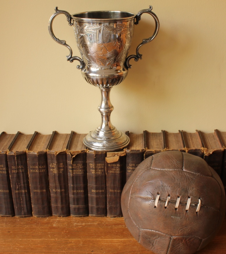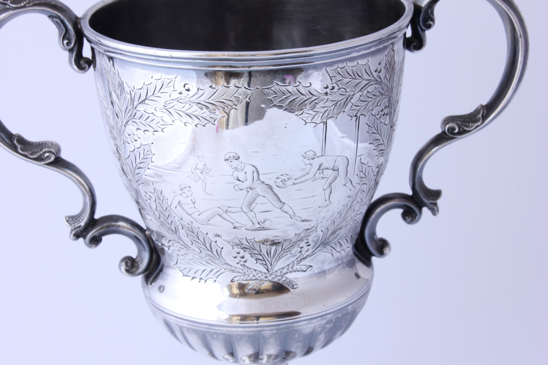 This large, heavy and impressive football trophy cup which dates from 1886 has a fine original engraving to the front of an early football game which really depicts the way the game was played in the Victorian times. The trophy also has leaf decoration around the top, base and two handles with the date 1886 engraved to the back.