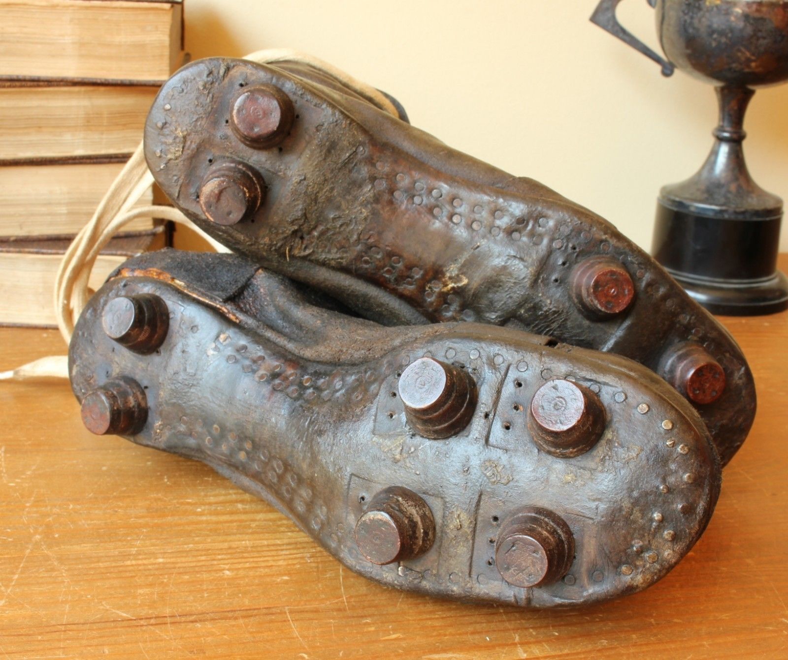 This pair of antique football boots which date from c1920 are made of dark brown leather with leather nailed on soles and studs.