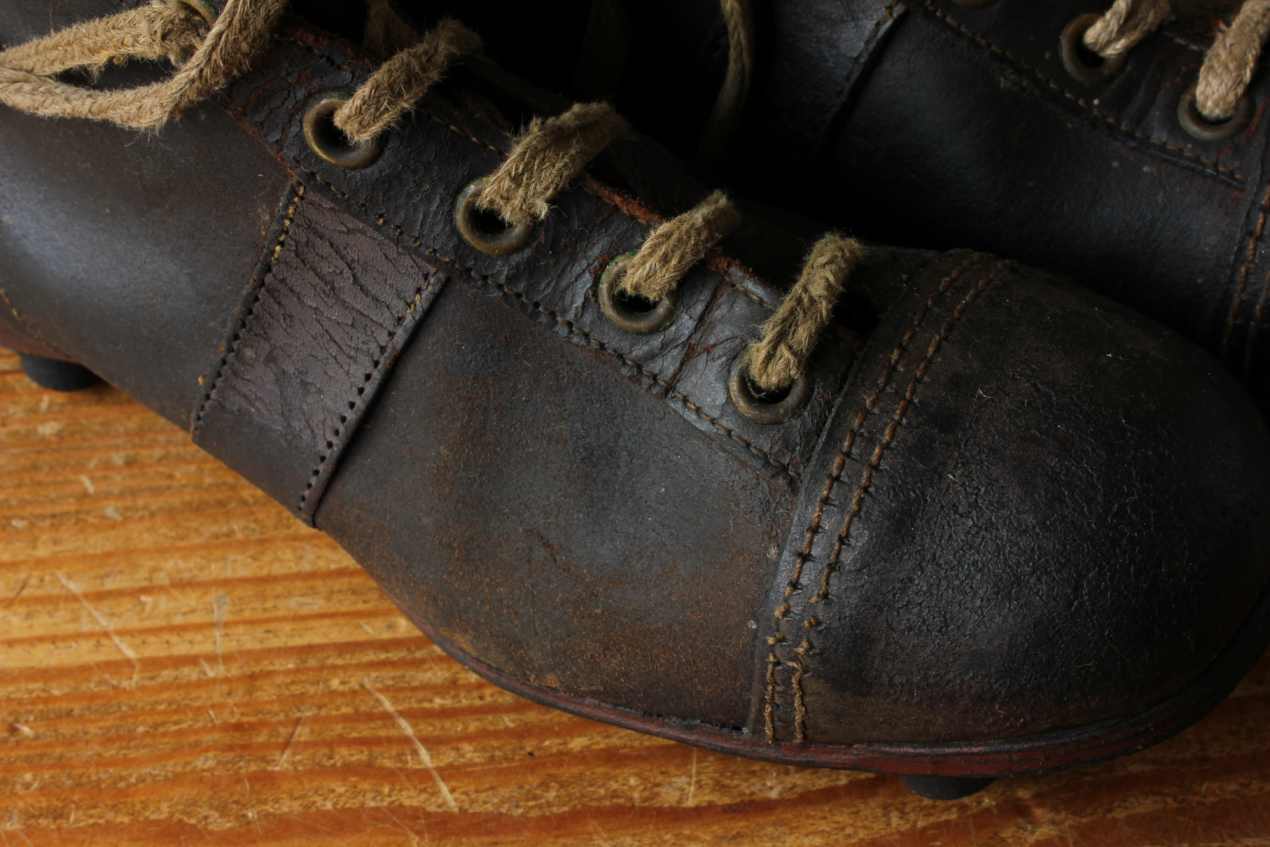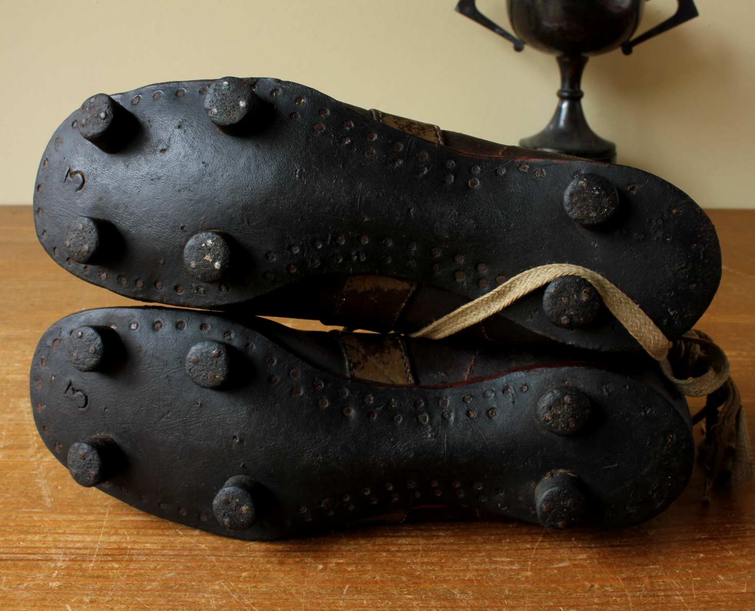 This very nice pair of small size antique football boots which are made of brown leather with leather soles and nailed on studs date from c1930 and are in a youth size 3.