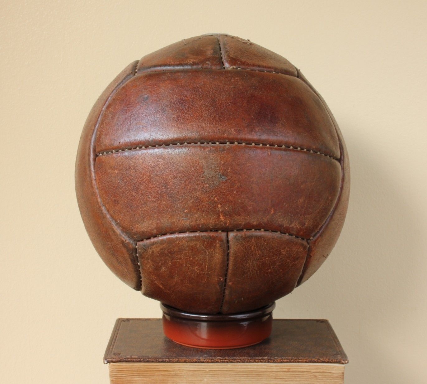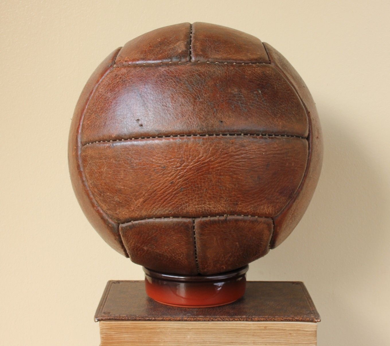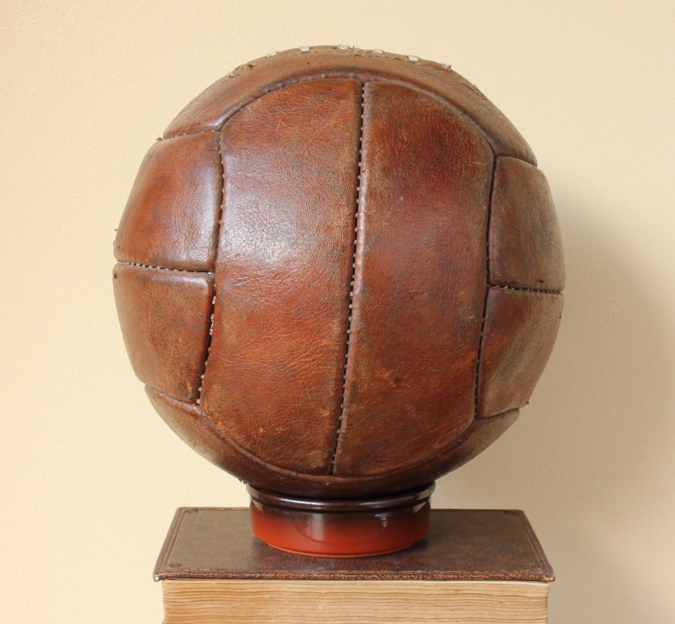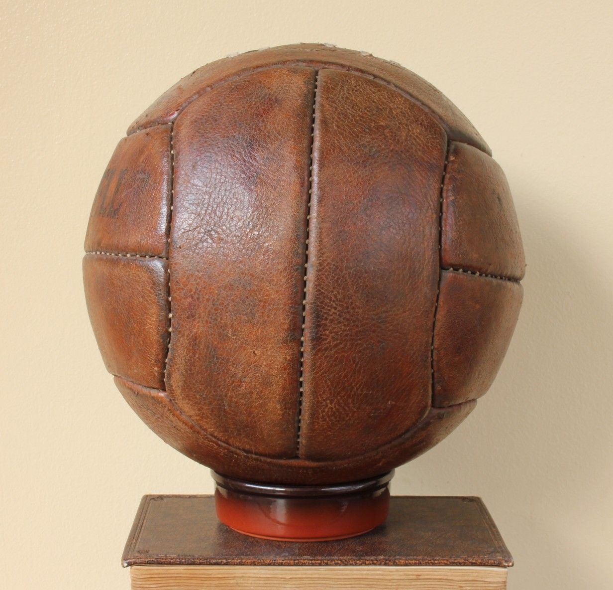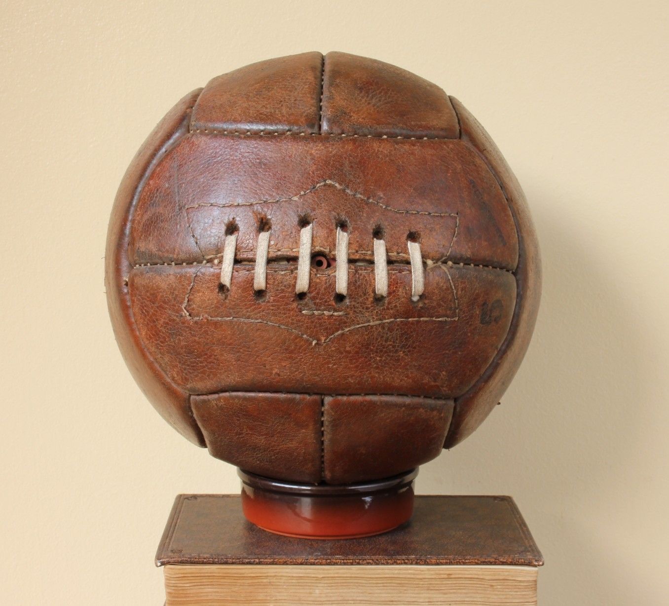 This original vintage size 5 football that dates from the 1950's is made of heavy genuine leather and marked Playwell, Guaranteed hand sewn and the size 5.