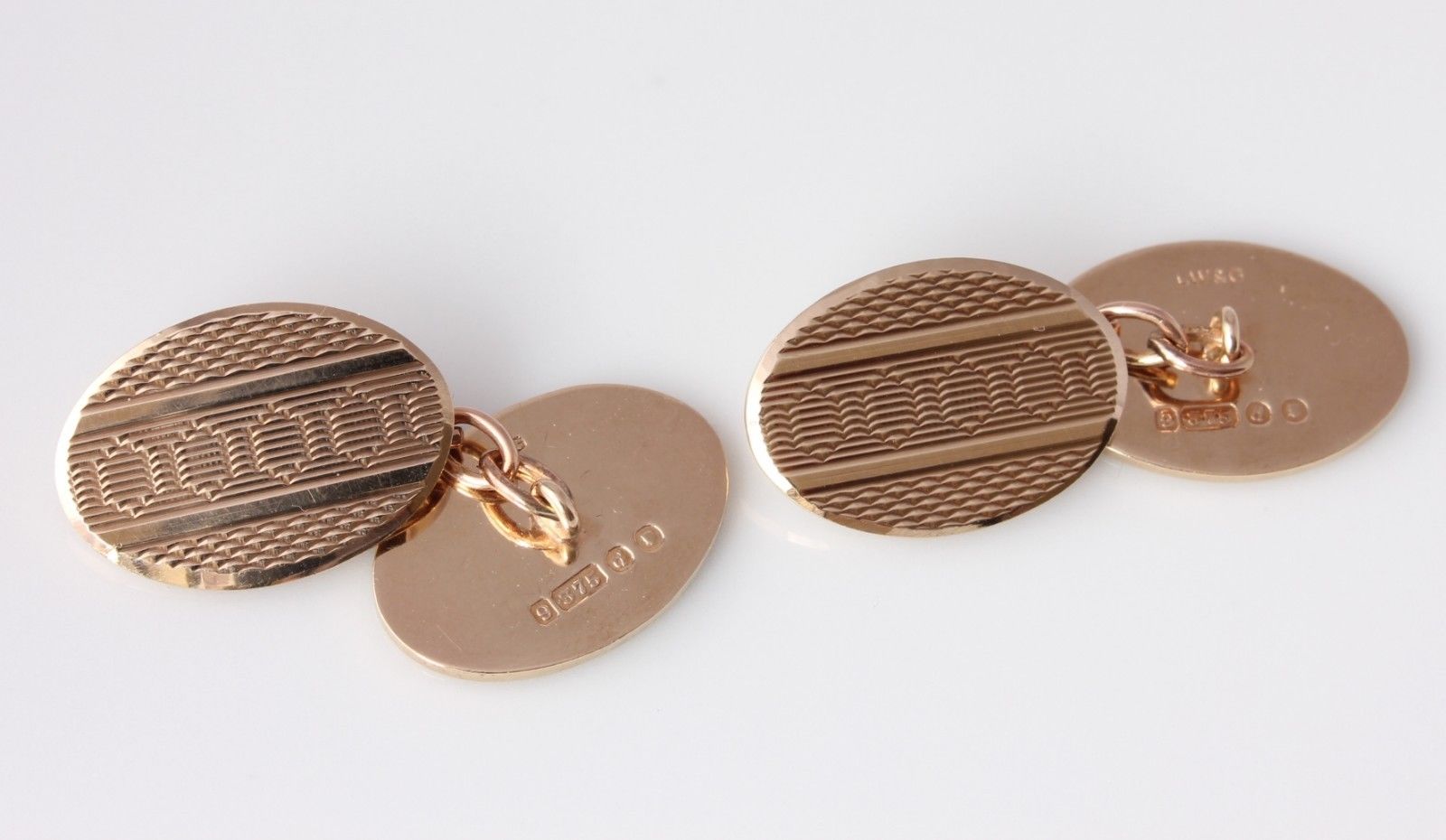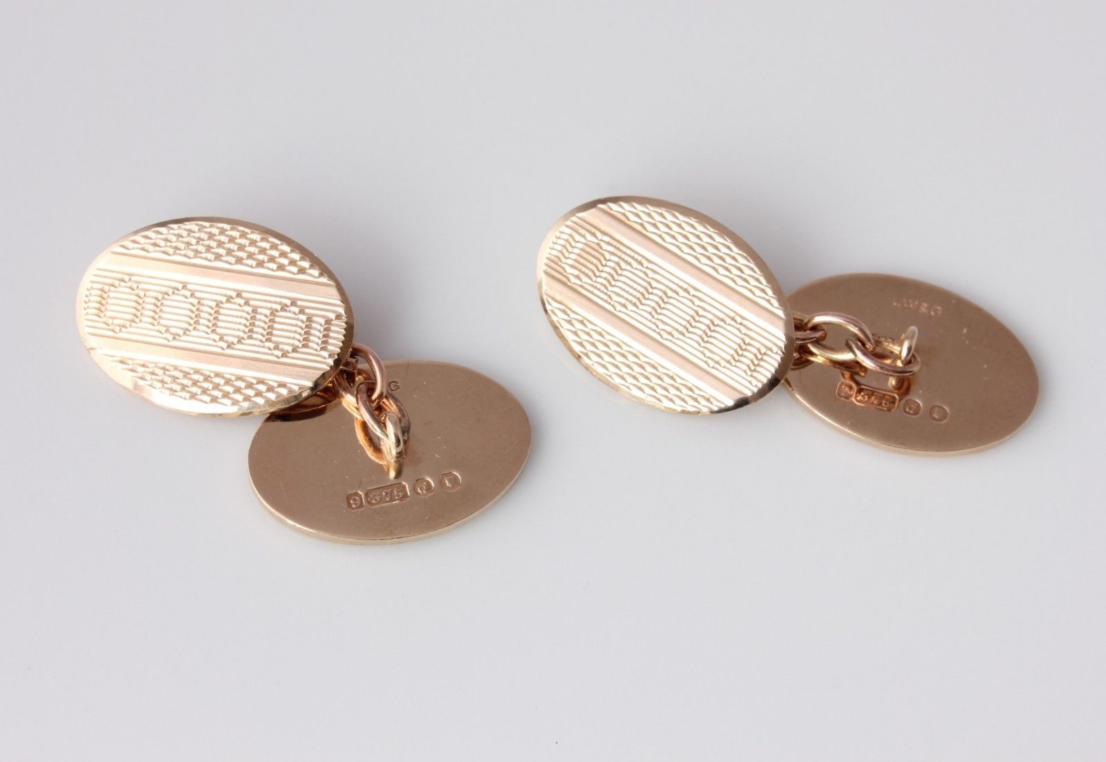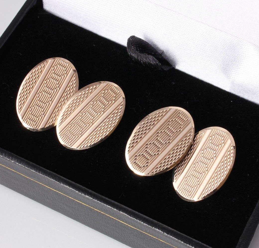 These handsome pair of vintage cufflinks are crafted in solid gold and have stylish oval-shape engine turned panels with connecting curb-link chain. They are fully hallmarked for 9ct gold, dating from 1959 and are excellent quality being a nice heavy weight.