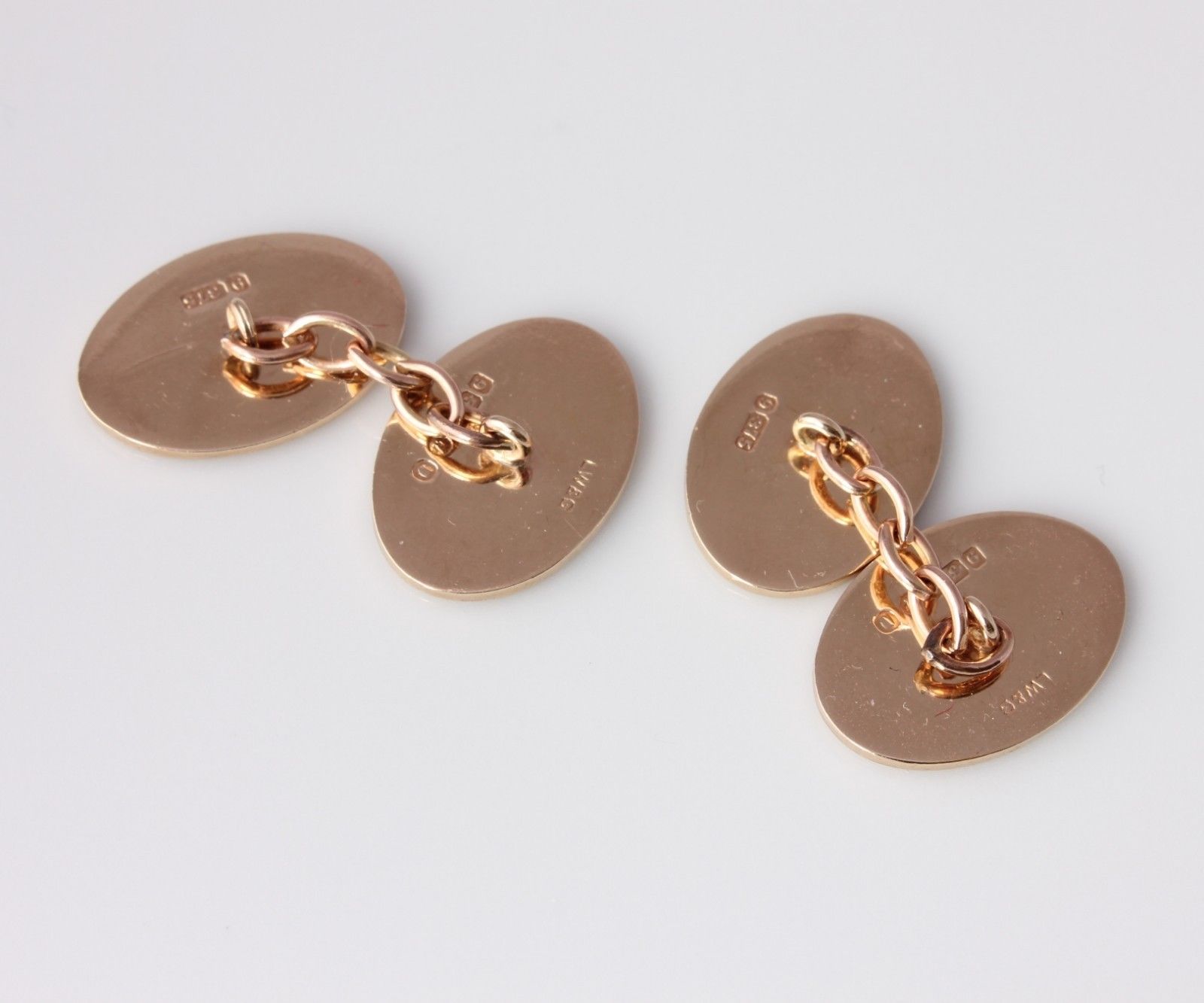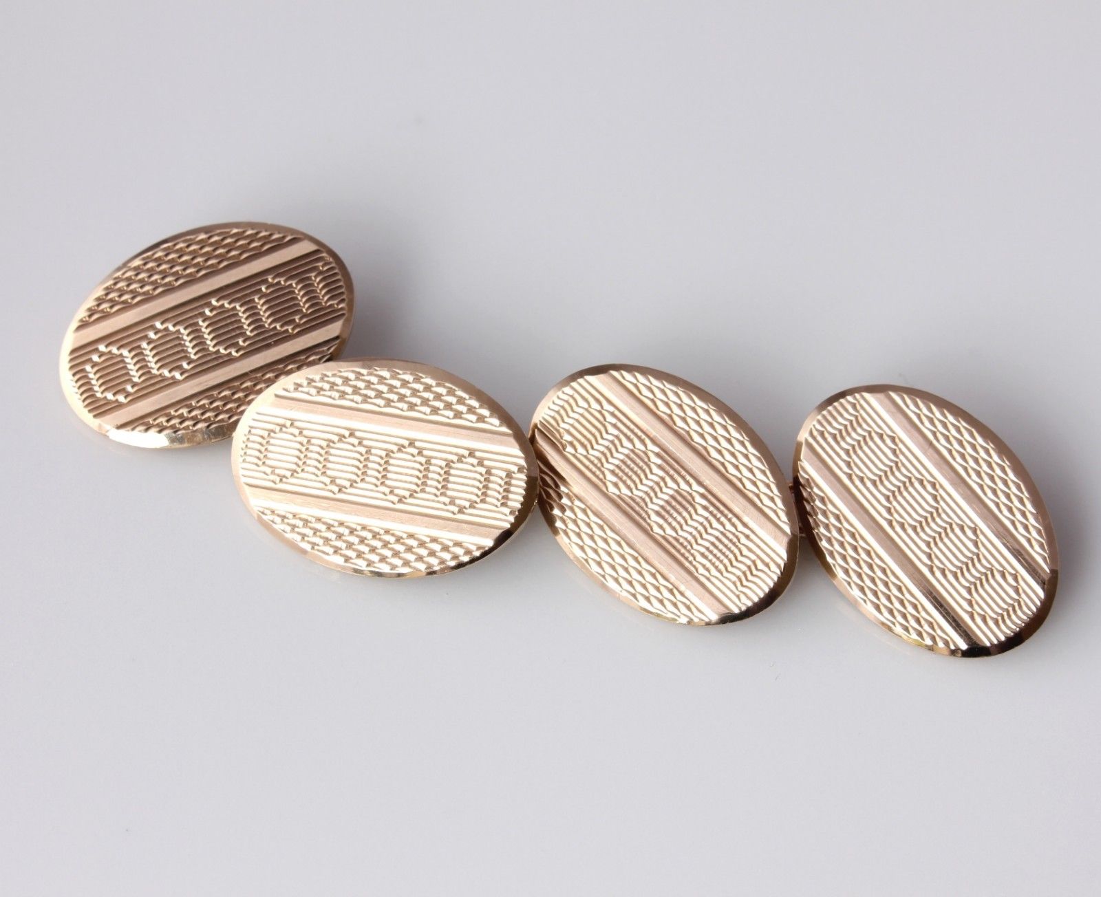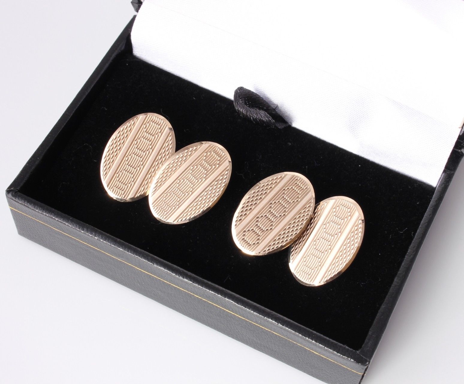 These handsome pair of vintage cufflinks are crafted in solid gold and have stylish oval-shape engine turned panels with connecting curb-link chain. They are fully hallmarked for 9ct gold, dating from 1959 and are excellent quality being a nice heavy weight.