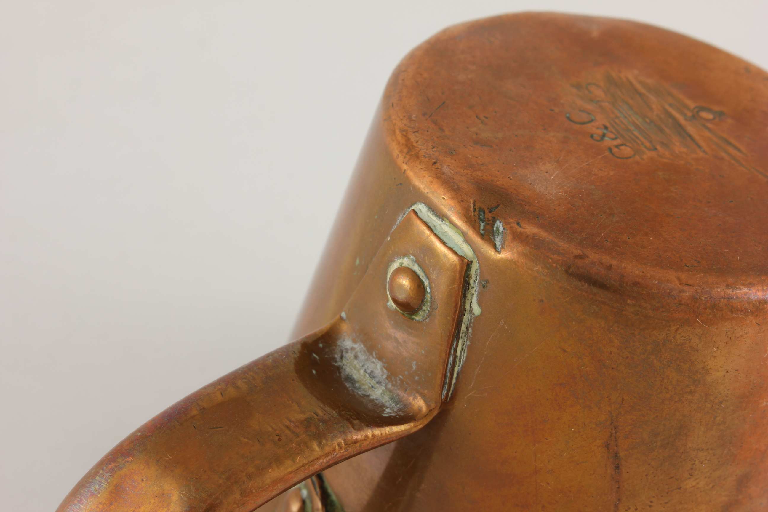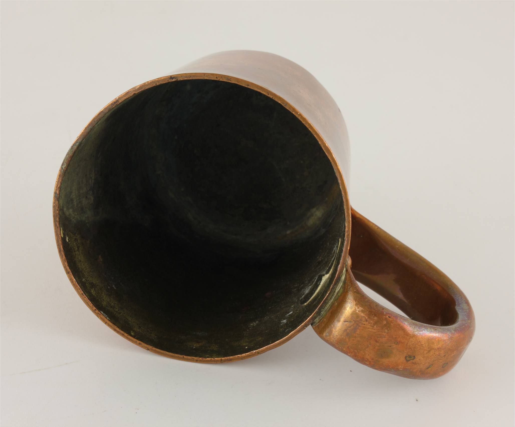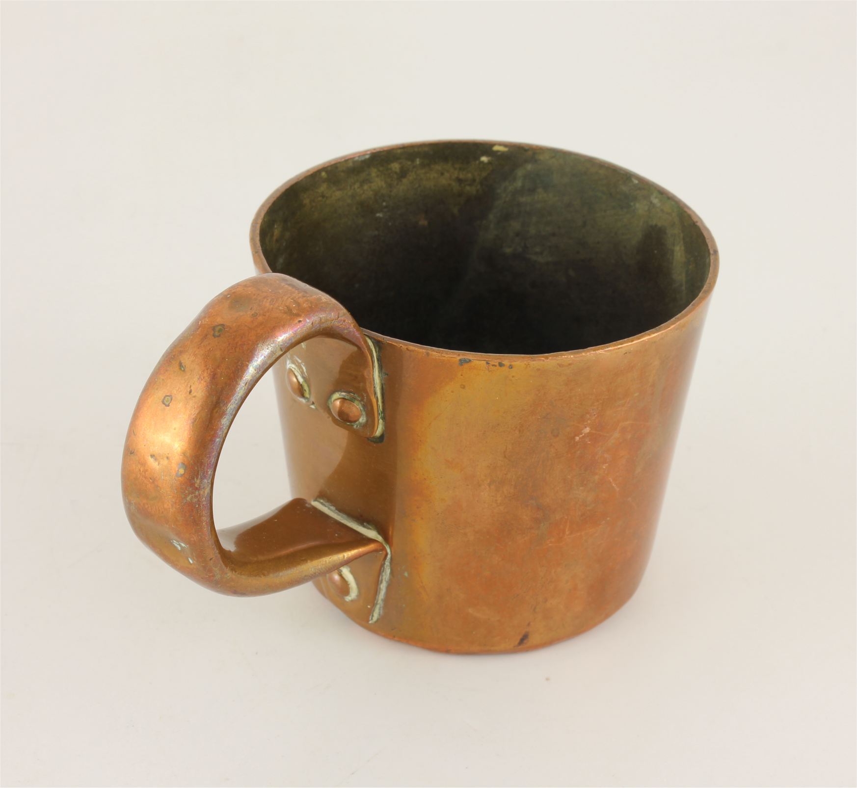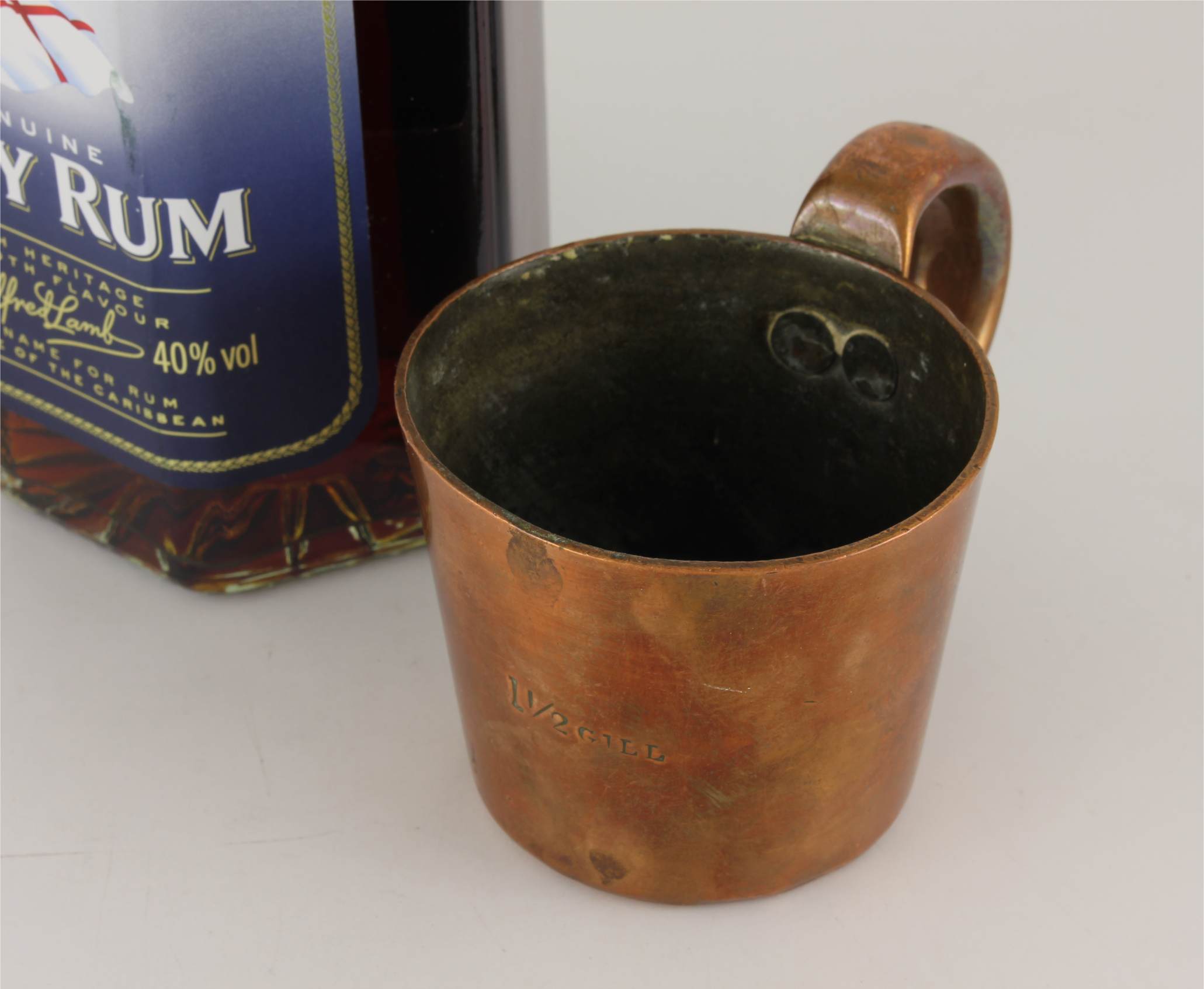 This One and a half gill copper rum measure is in a mug shape with a large side handle that is attached to the body with rivets and is stamped to the front with 1 1/2 GILL.