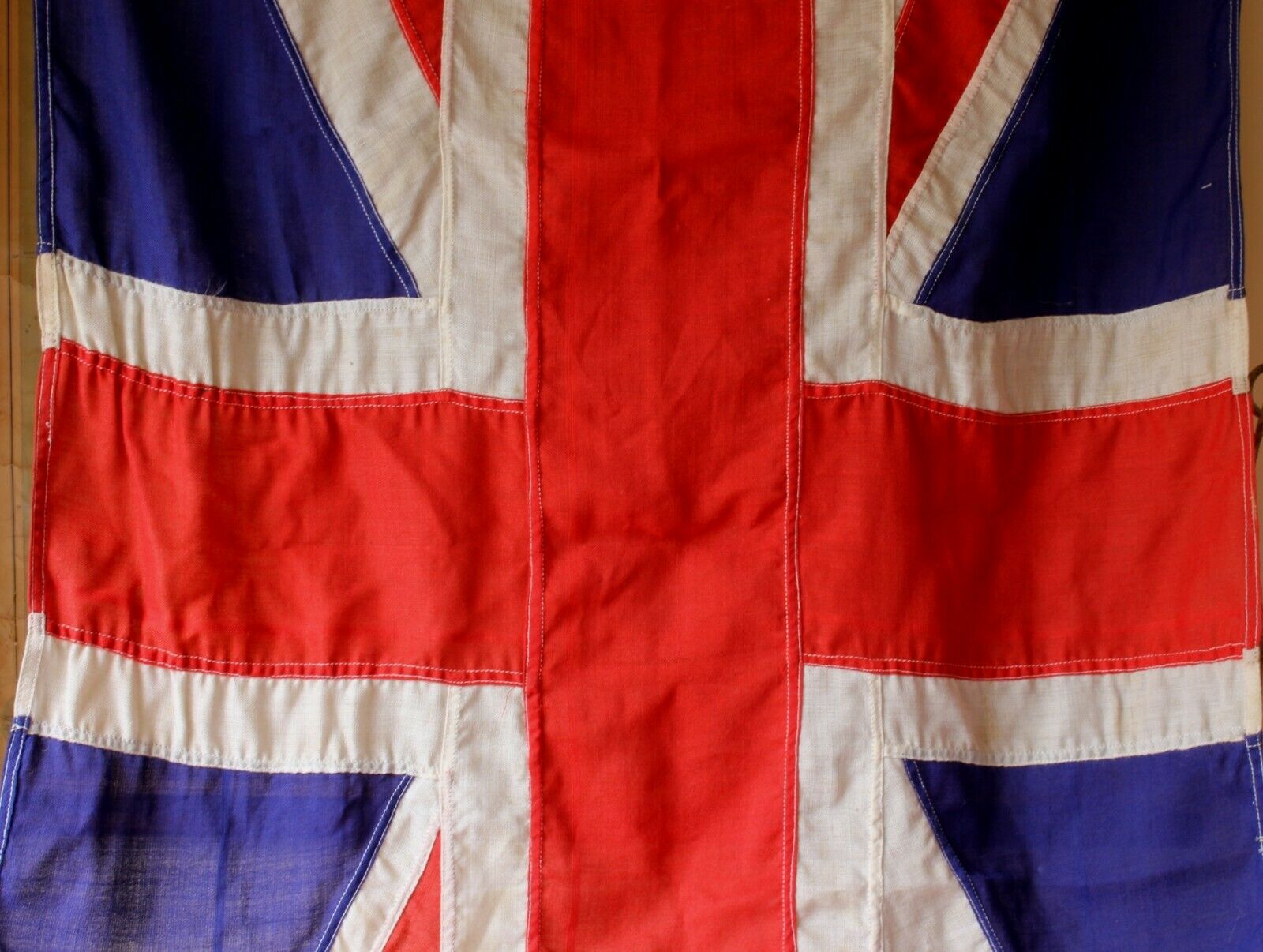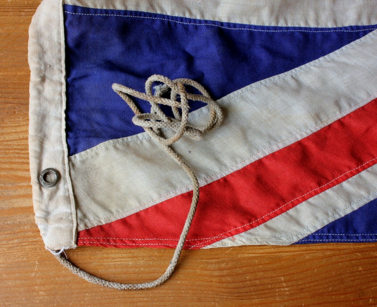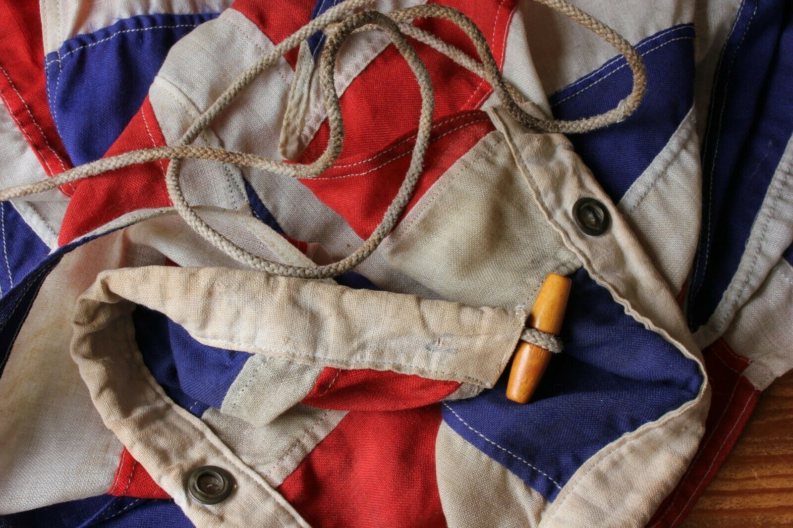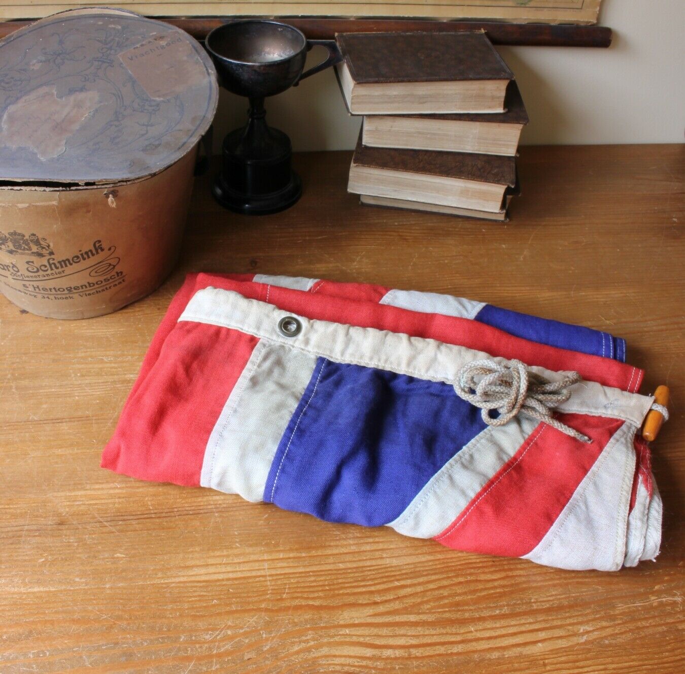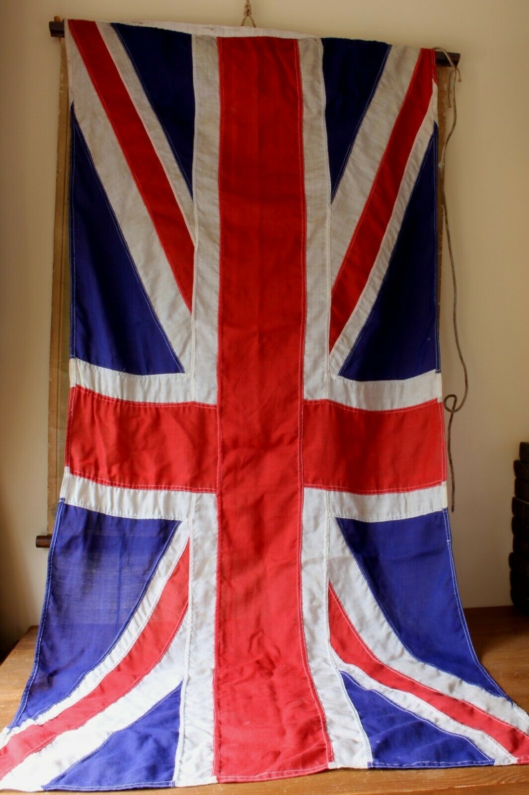 This original vintage period Union Jack Flag which is a good size is a nice quality example with each segment individually sewn and halyard rope. The flag was once used on a ship and has the eyelets attached to the top.