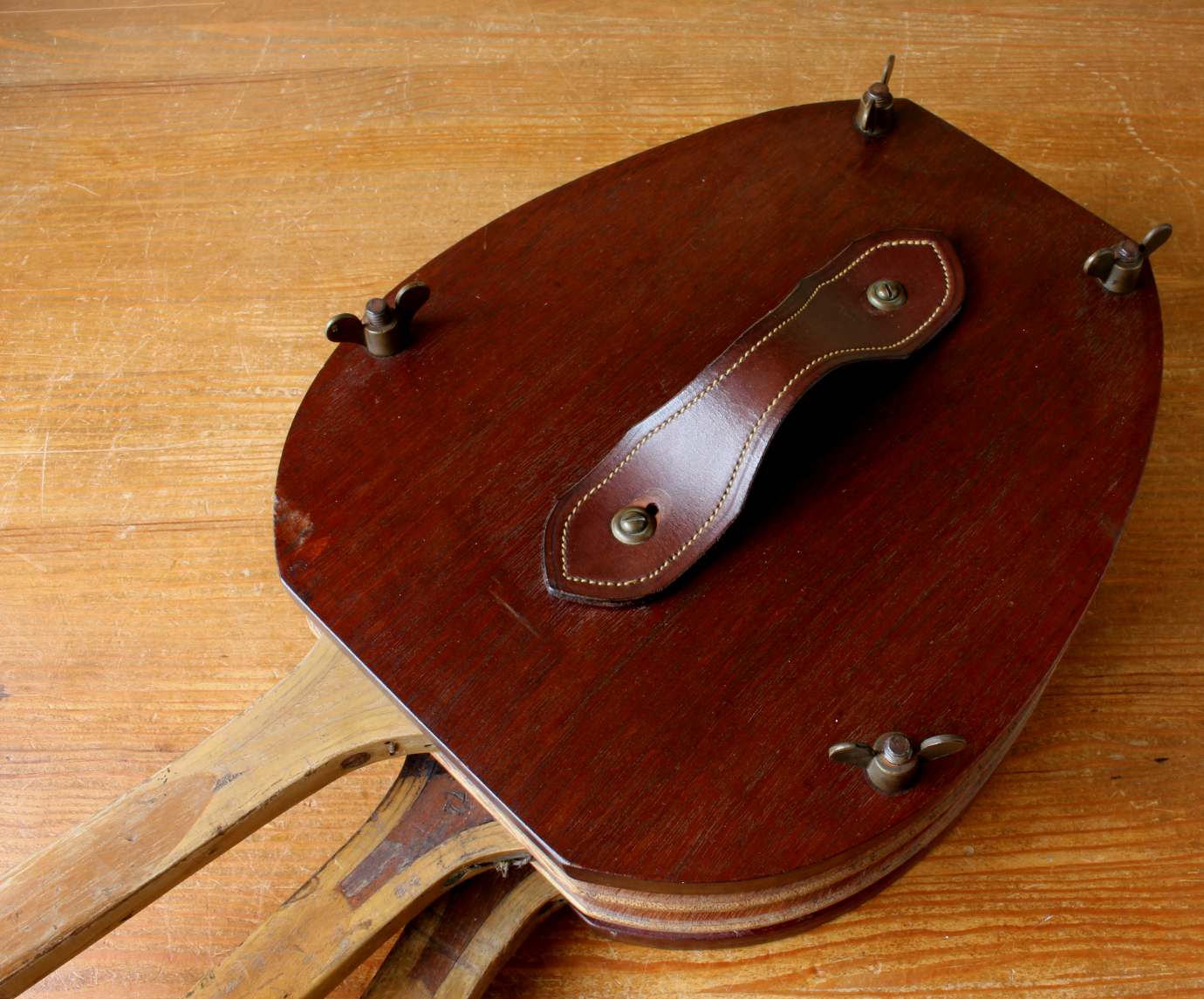 This vintage / antique wooden tennis racket press which has a brown leather carrying handle has brass and metal fittings and comes complete with two original wooden dividers so will take up to 3 tennis rackets.