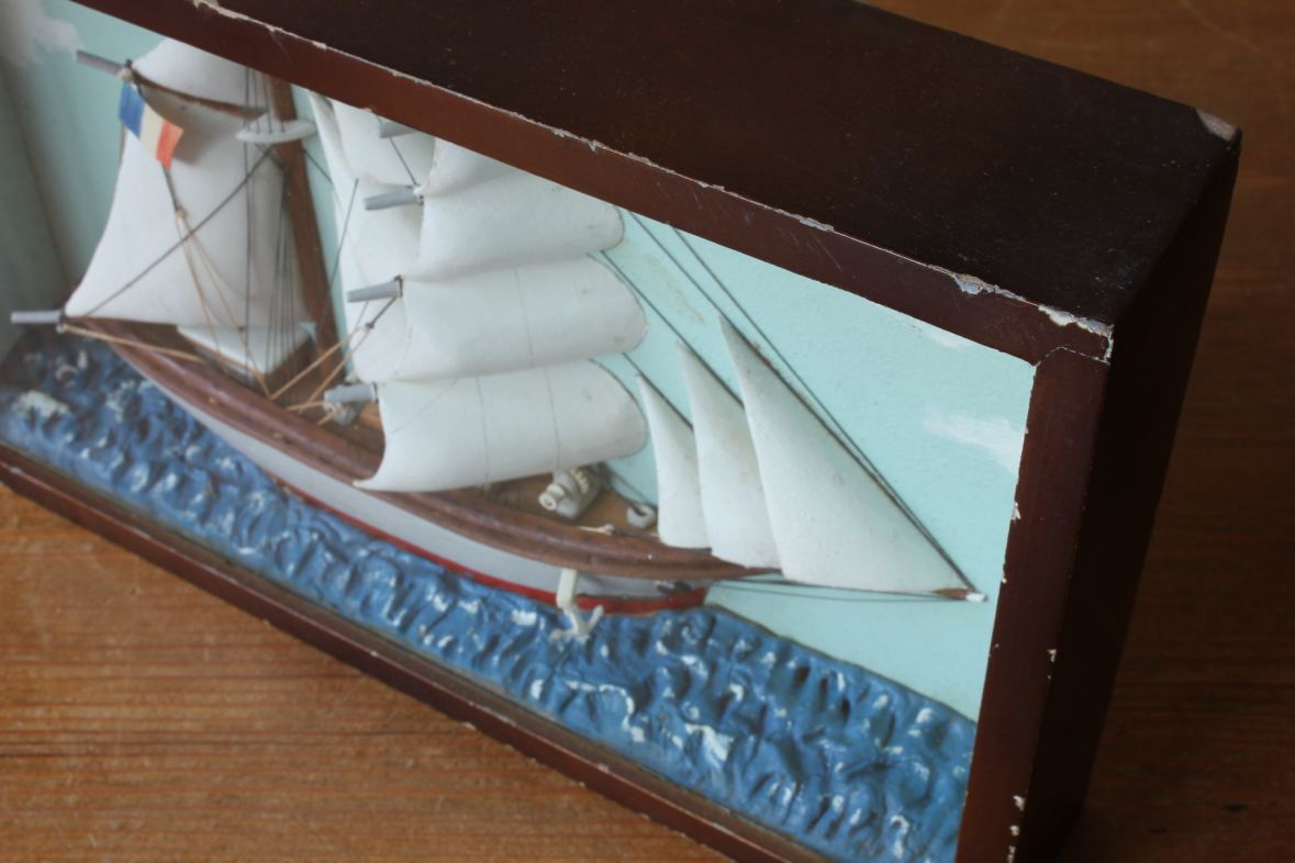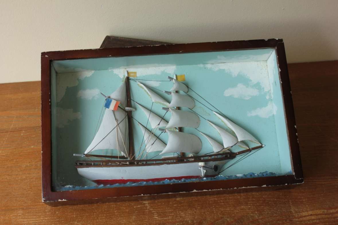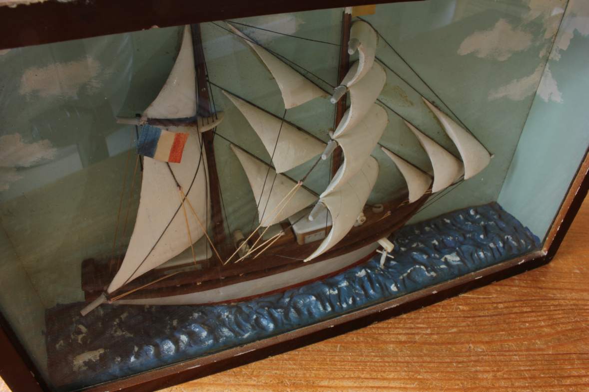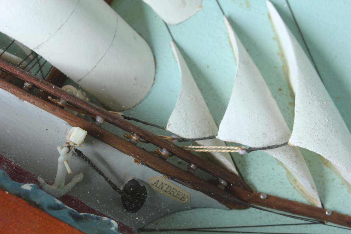 This diorama is of nice quality with the ship having good detail including carved wood sails, rigging, a French flag and bears the name Andree.