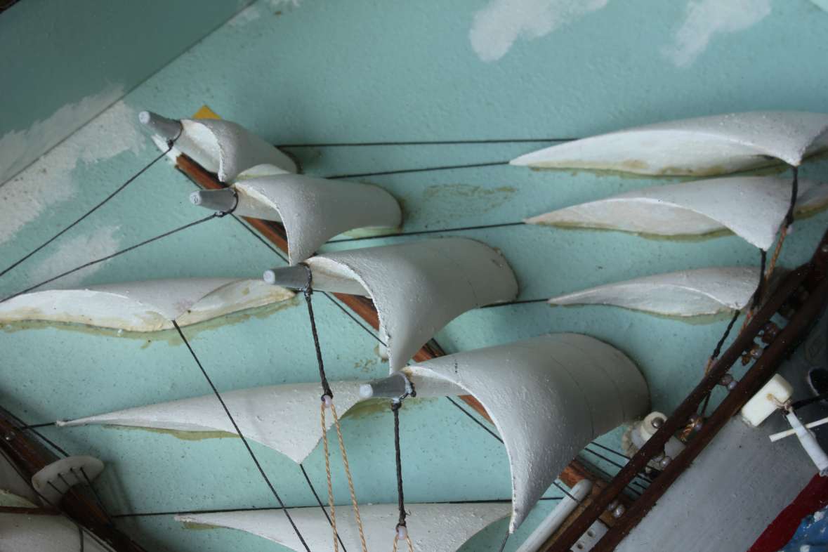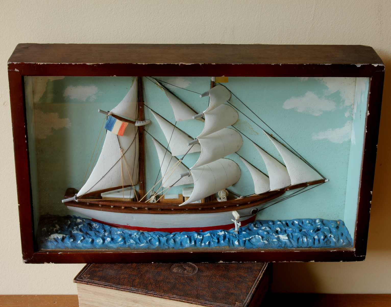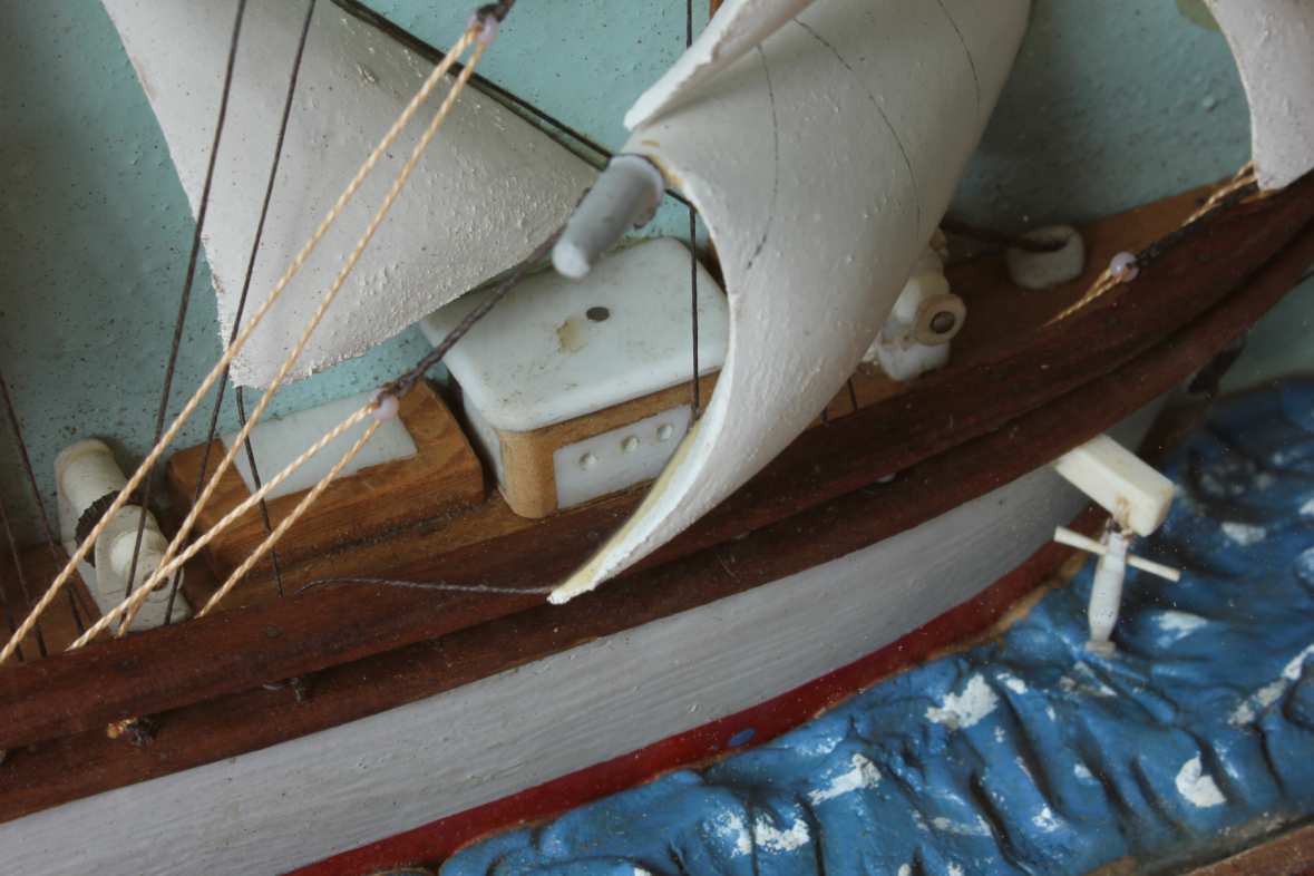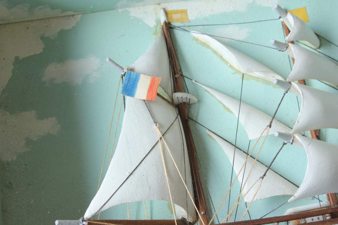 This diorama is of nice quality with the ship having good detail including carved wood sails, rigging, a French flag and bears the name Andree.