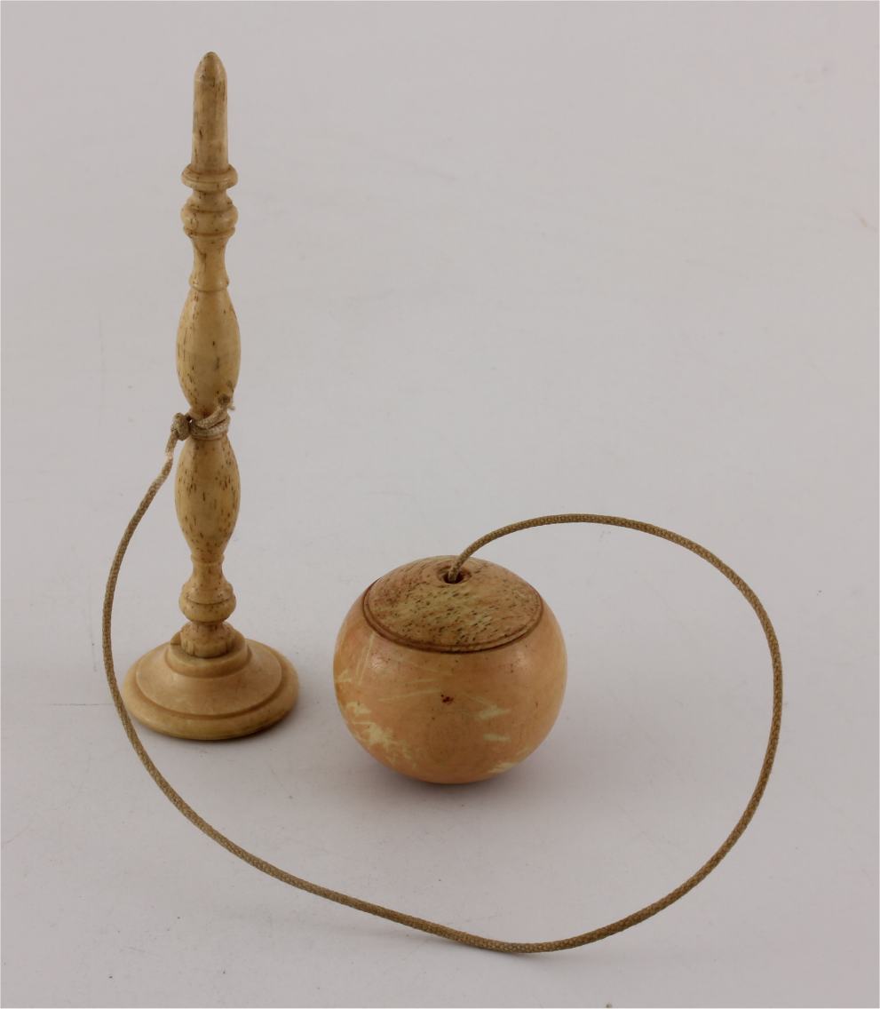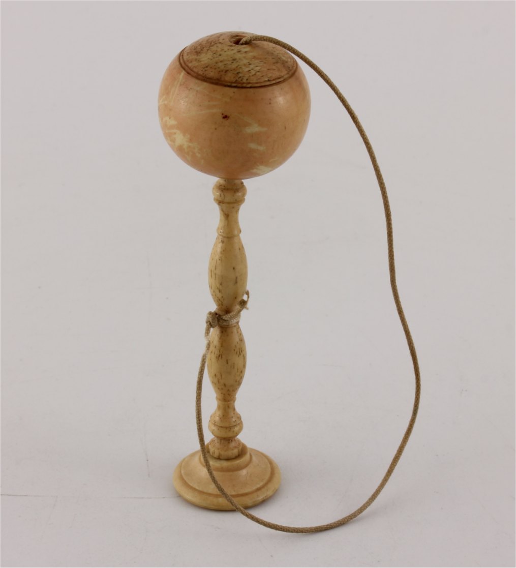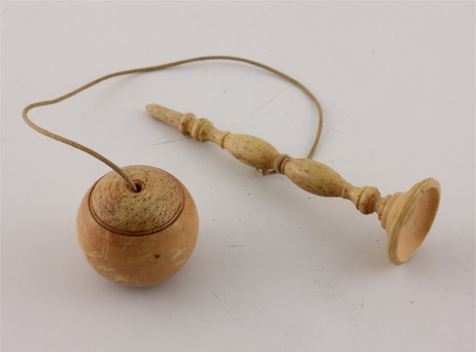This antique cup and ball game has a carved bone handle with a spike to one end and a shallow cup to the other end. The small carved ball is attached to the centre of the handle by a string. The object of the game being to catch the ball on the spike or alternatively on the cup at the other end.
