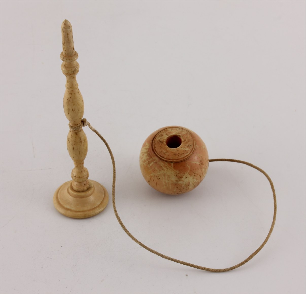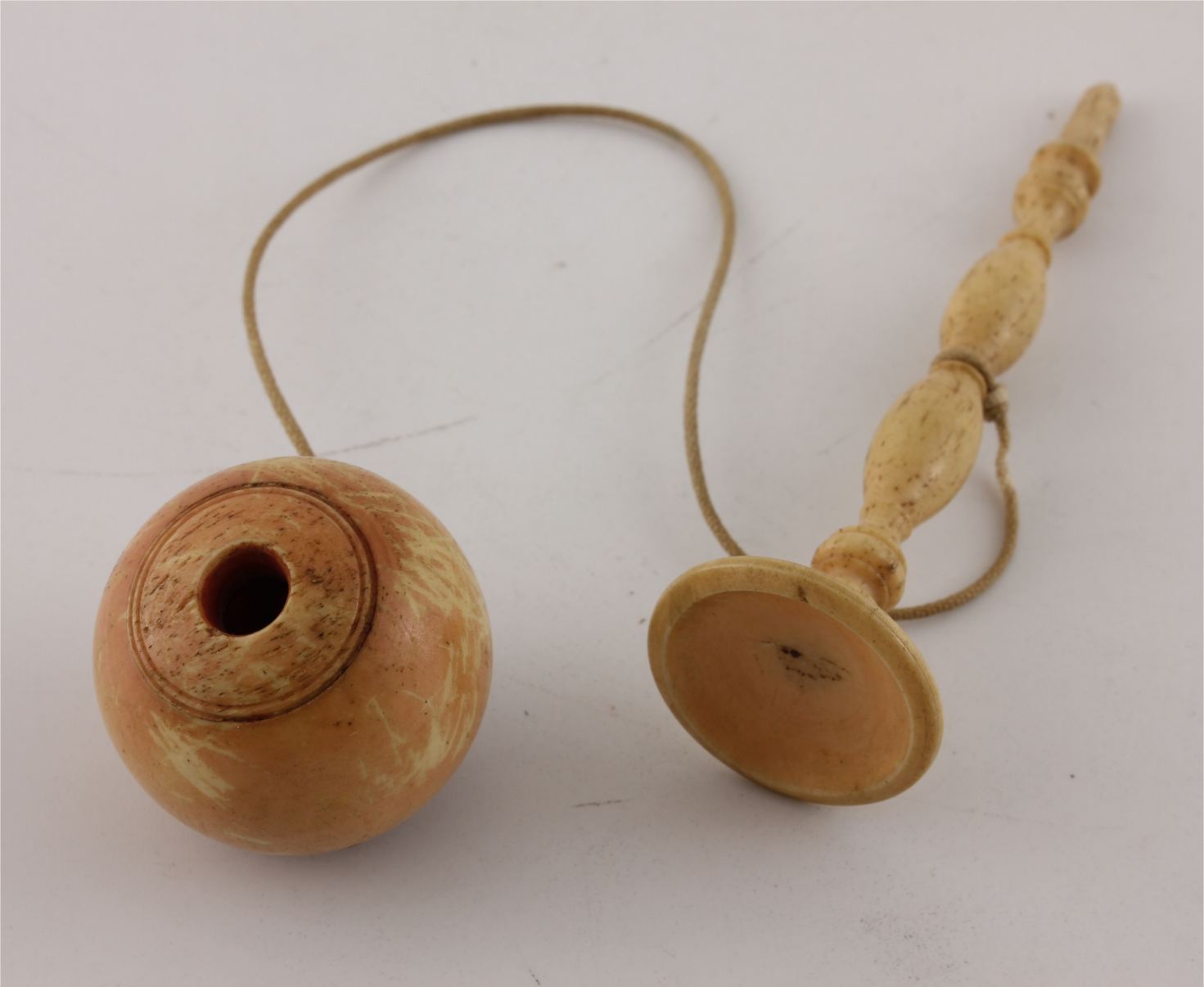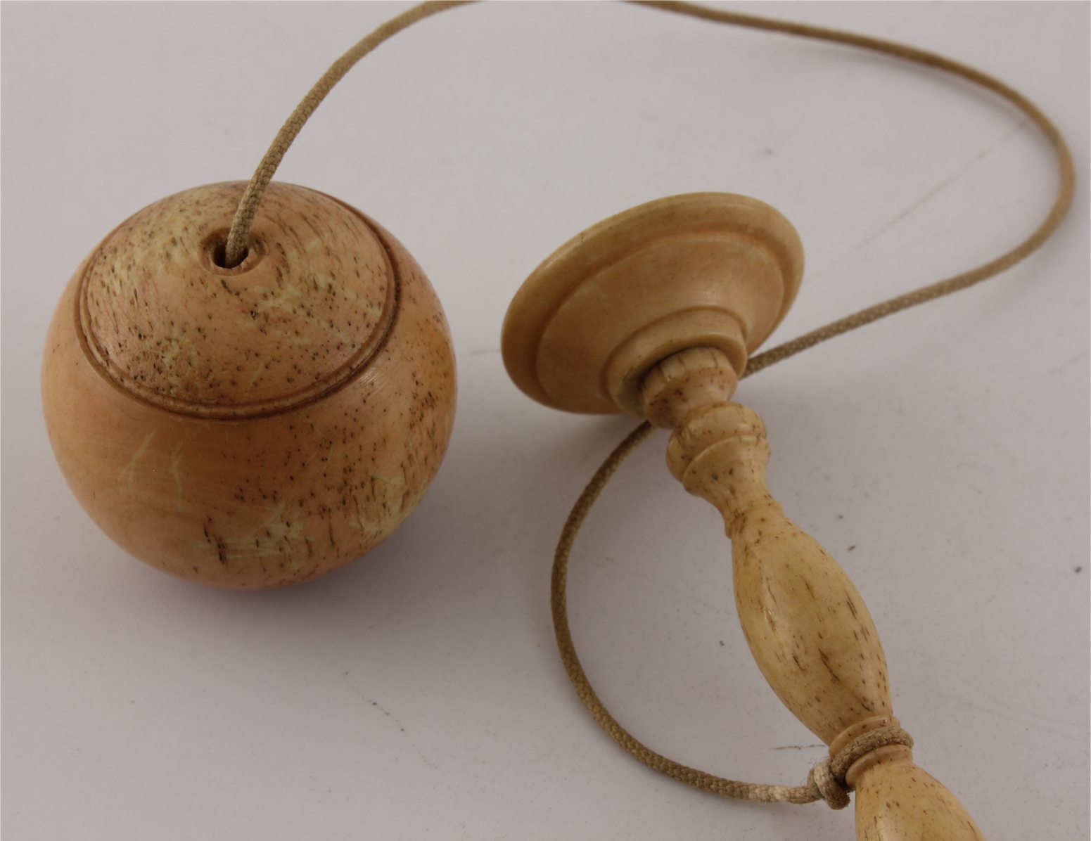 This antique cup and ball game has a carved bone handle with a spike to one end and a shallow cup to the other end. The small carved ball is attached to the centre of the handle by a string. The object of the game being to catch the ball on the spike or alternatively on the cup at the other end.