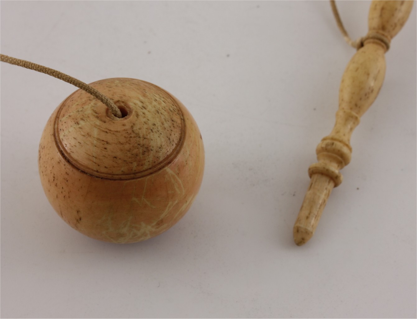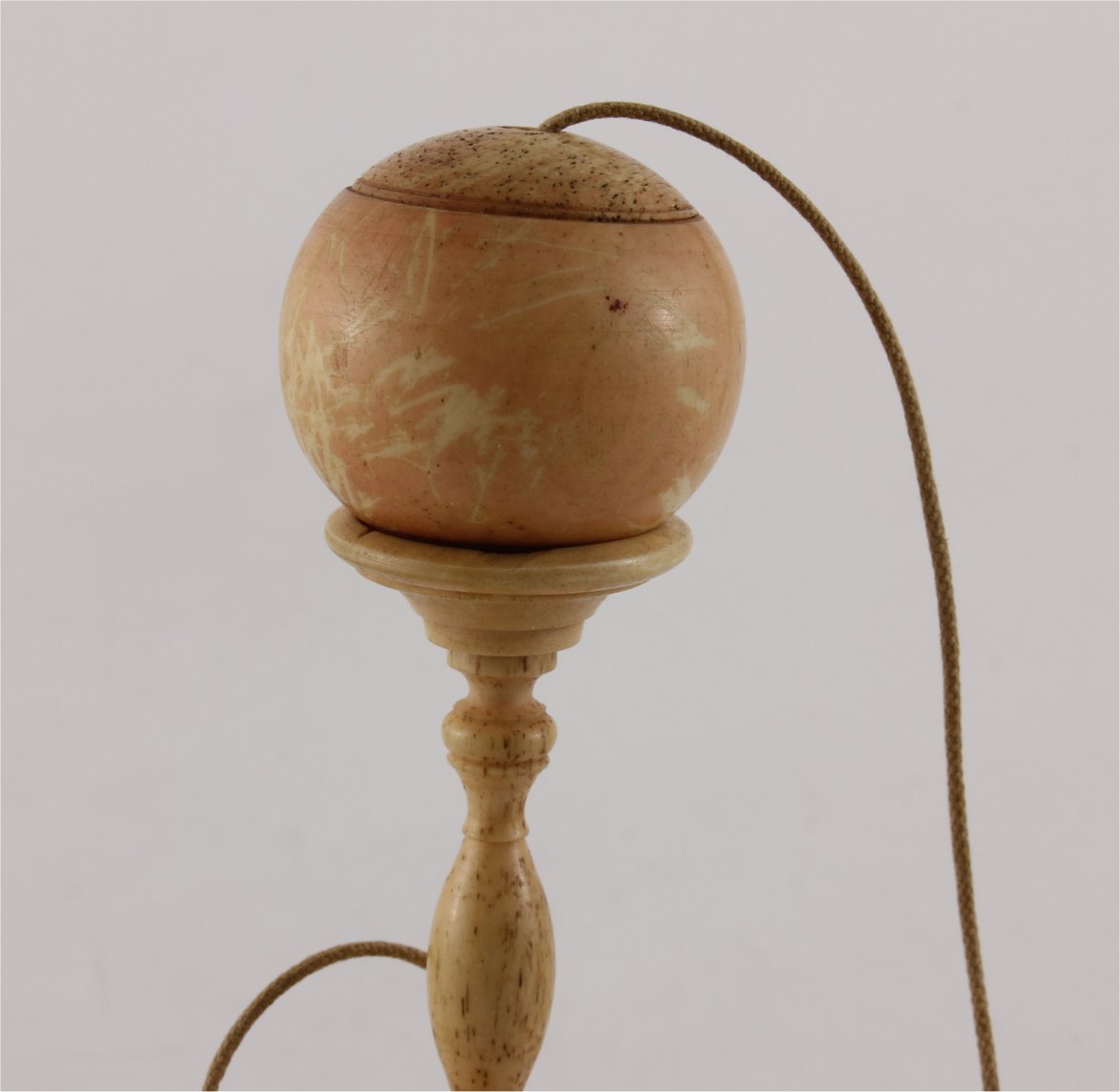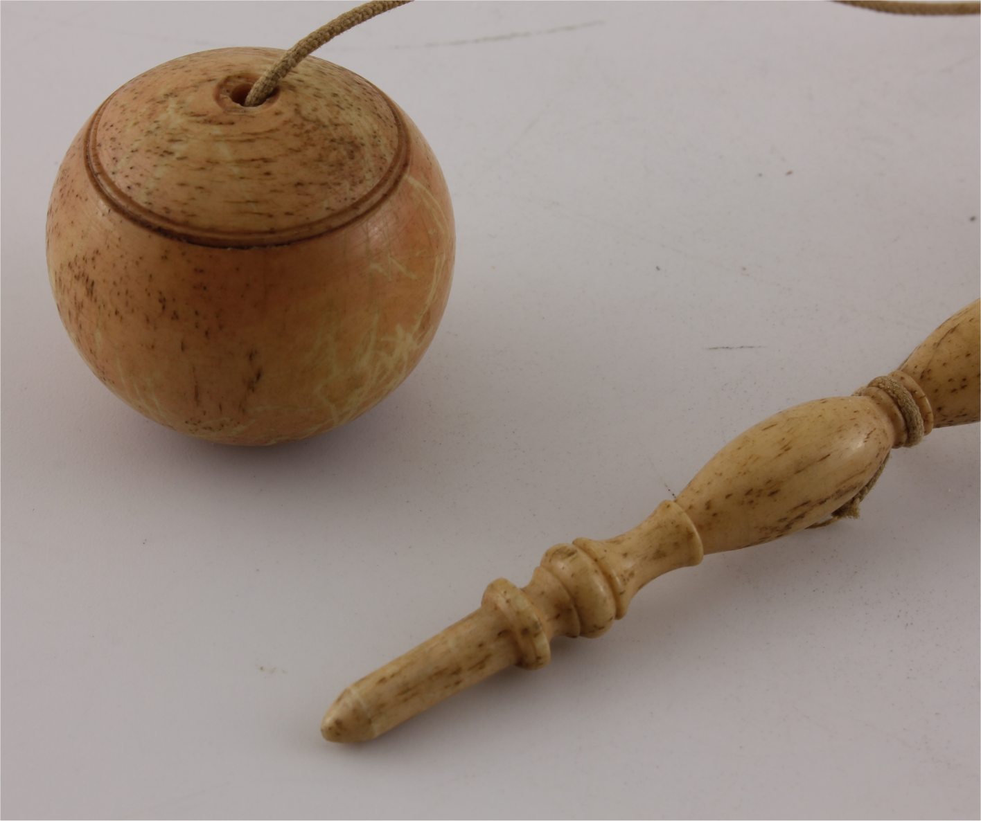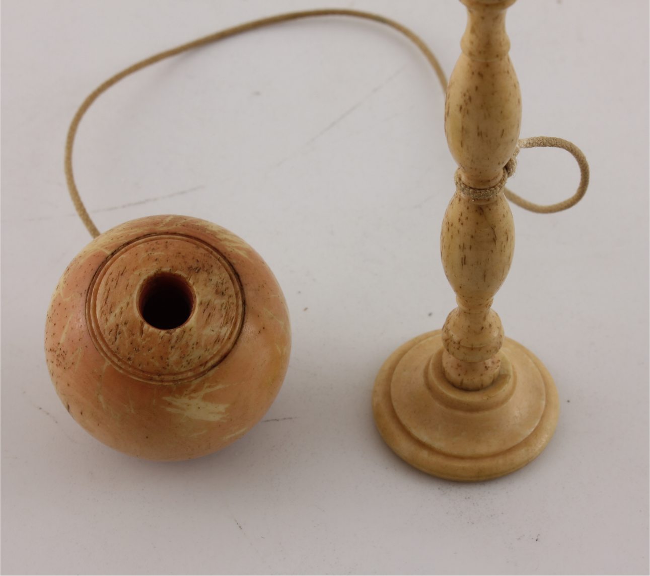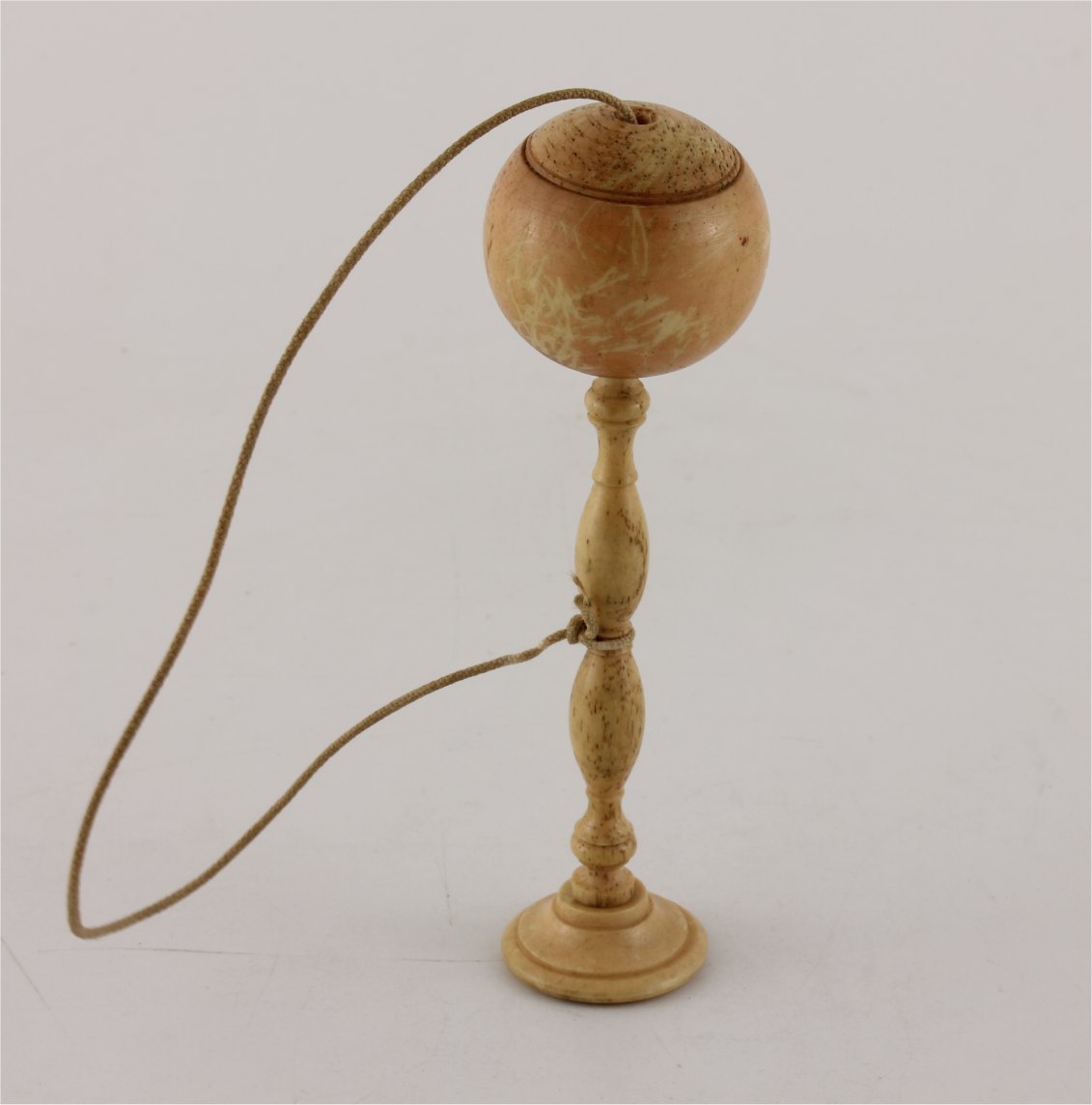This fabulous bilboquet which dates from c1820 would have been made by hand by using materials available to hand like mutton bone and string. Possibly made by a Napoleonic prisoner of war.