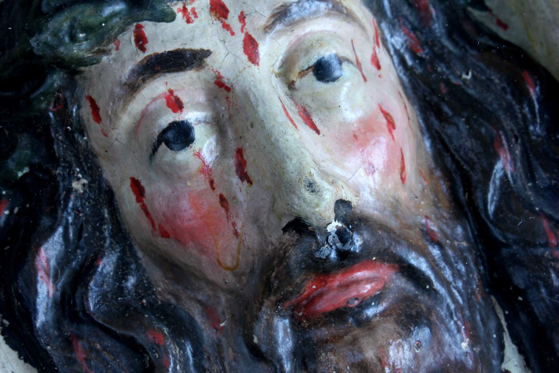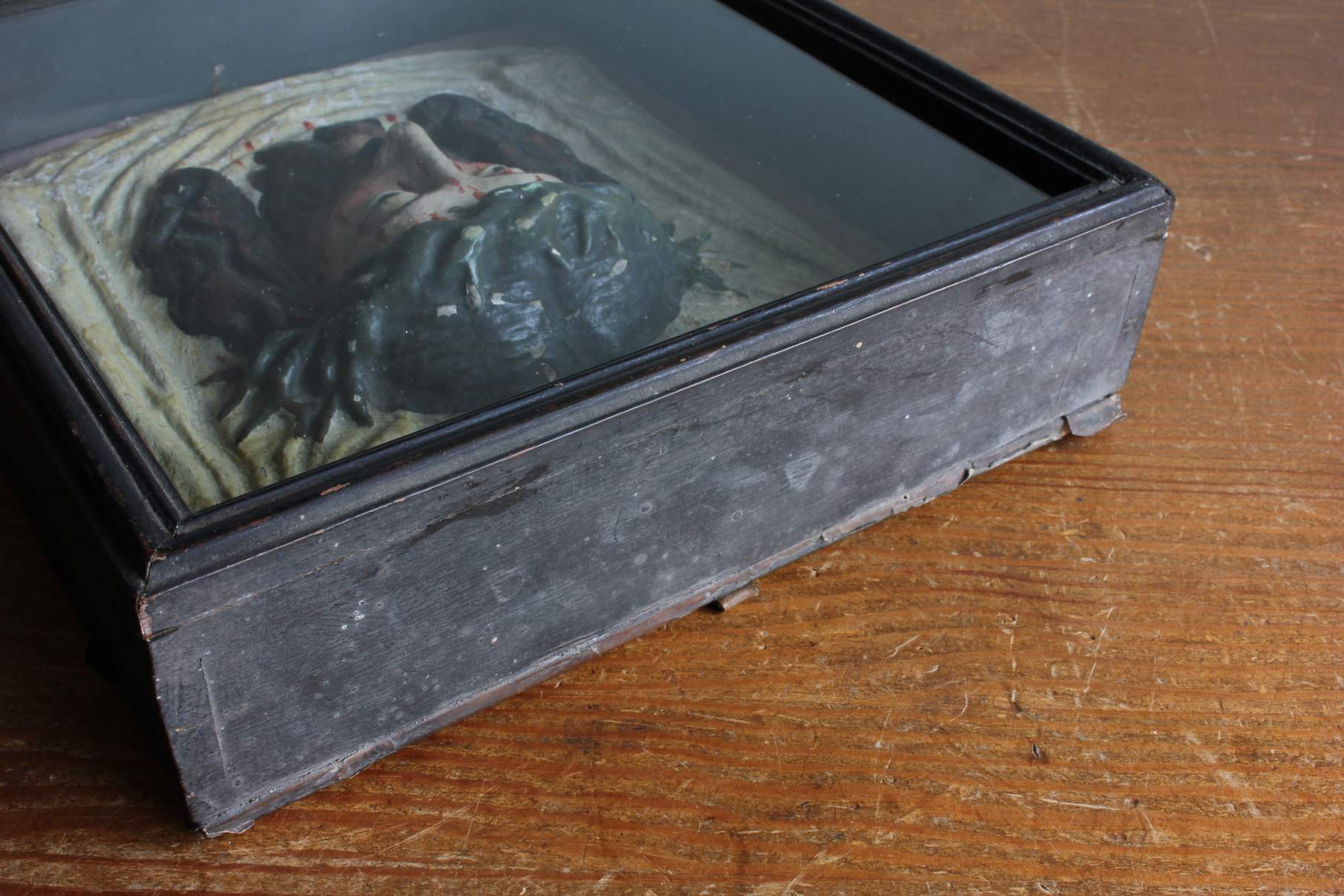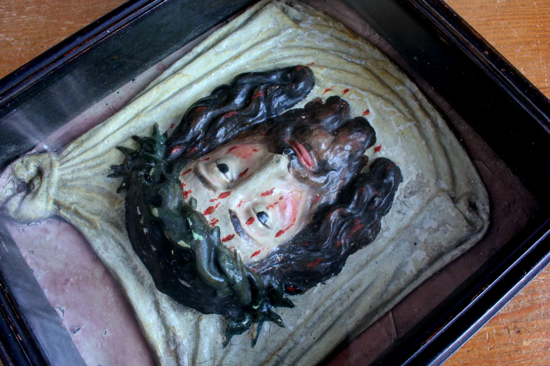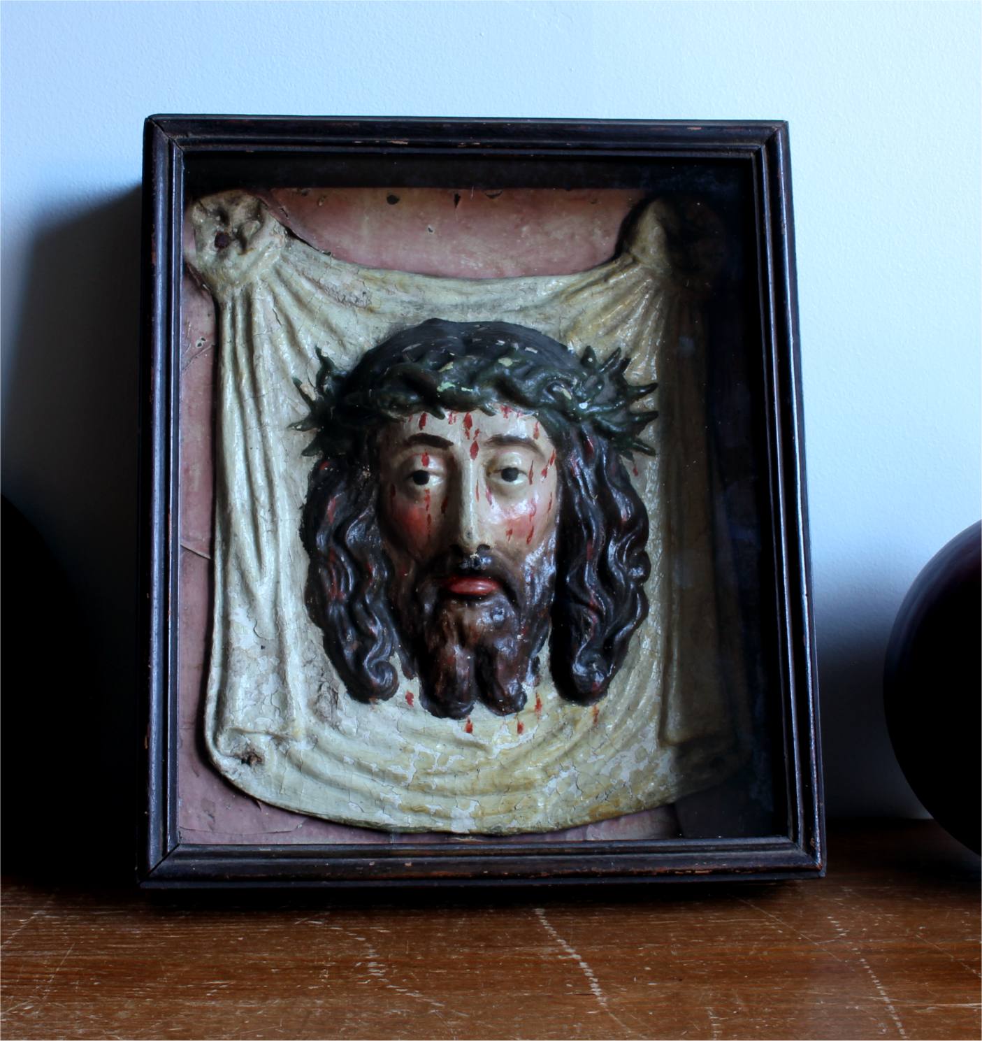This unusual religious antique piece which is made of papier mache is of the Veil of Veronica and has a glazed front.