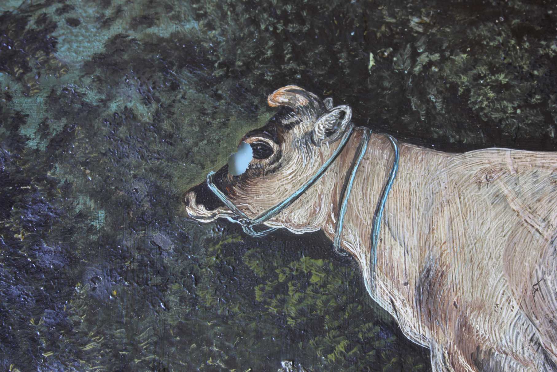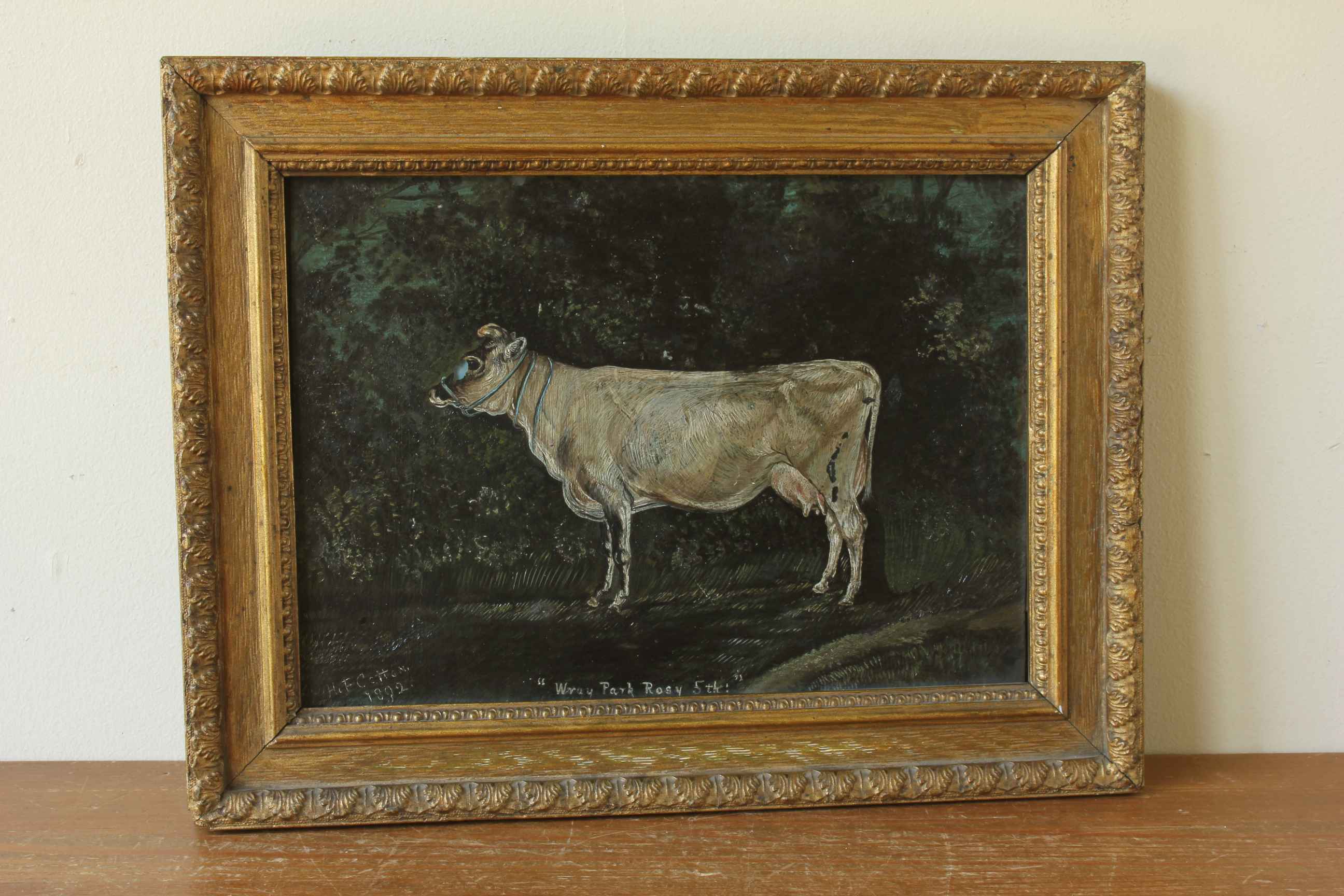 This attractive 19th century cow portrait which was painted using oils on glass dates from 1892 and is mounted in a gold coloured frame.