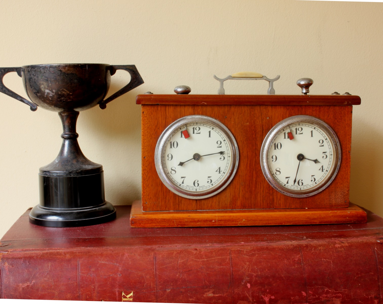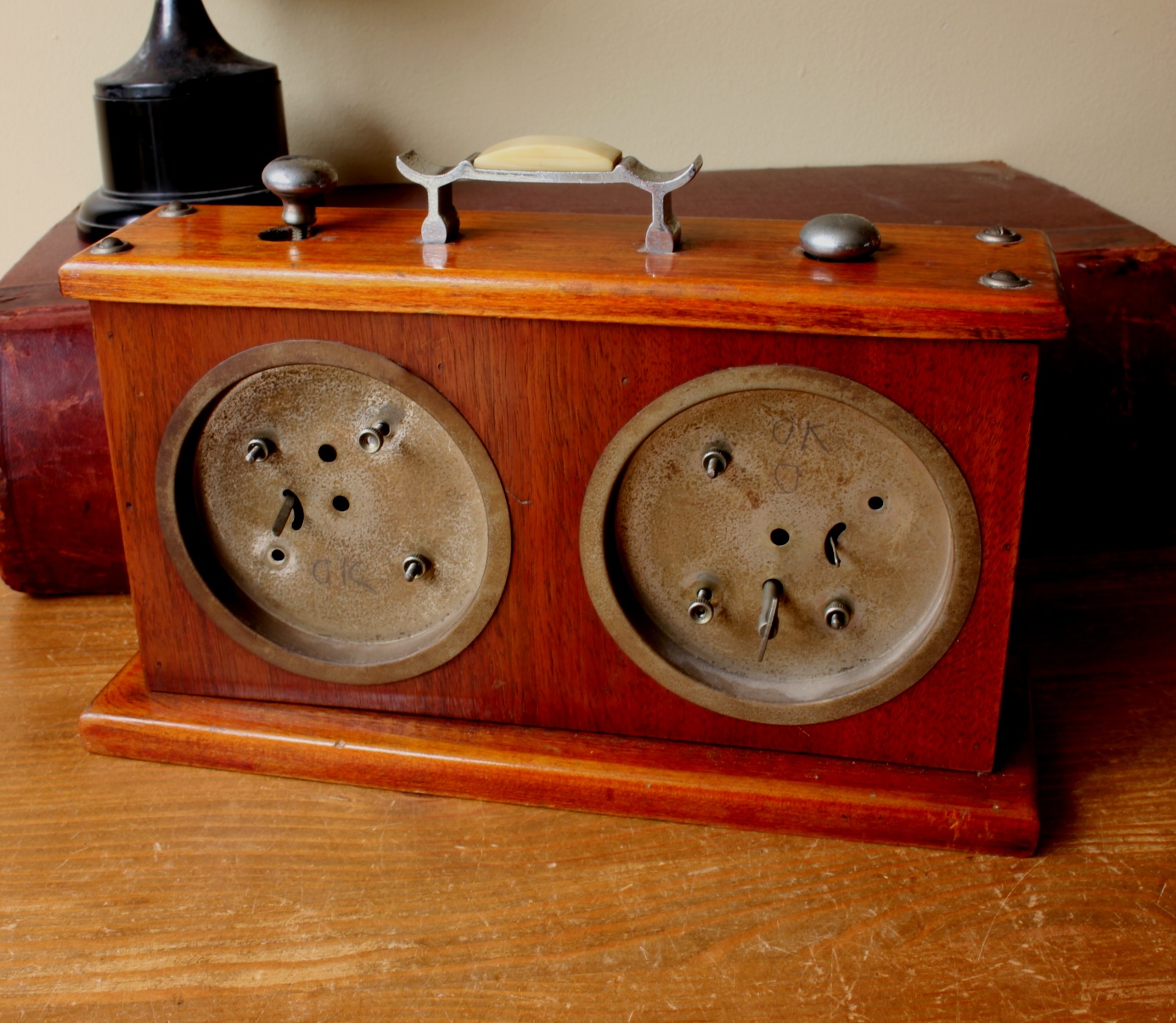 This antique chess clock which is British Made dates from the first half of the 20th century and has a top carry handle.