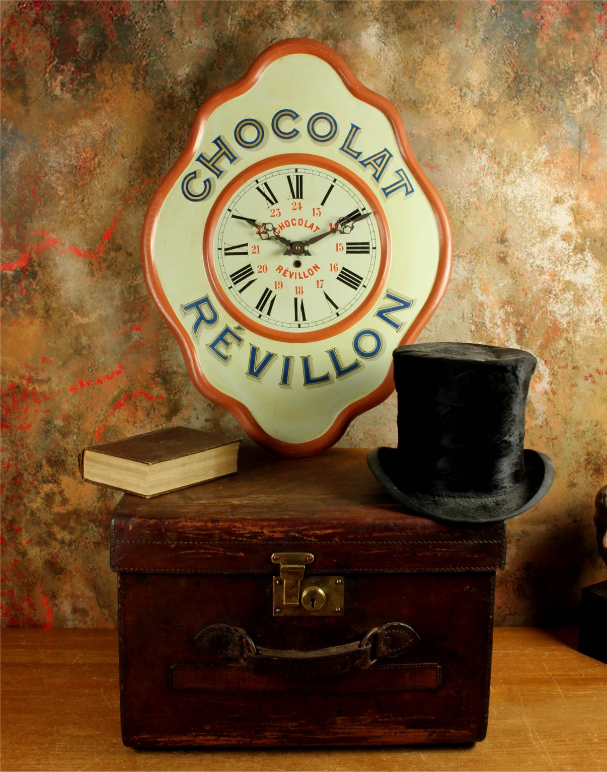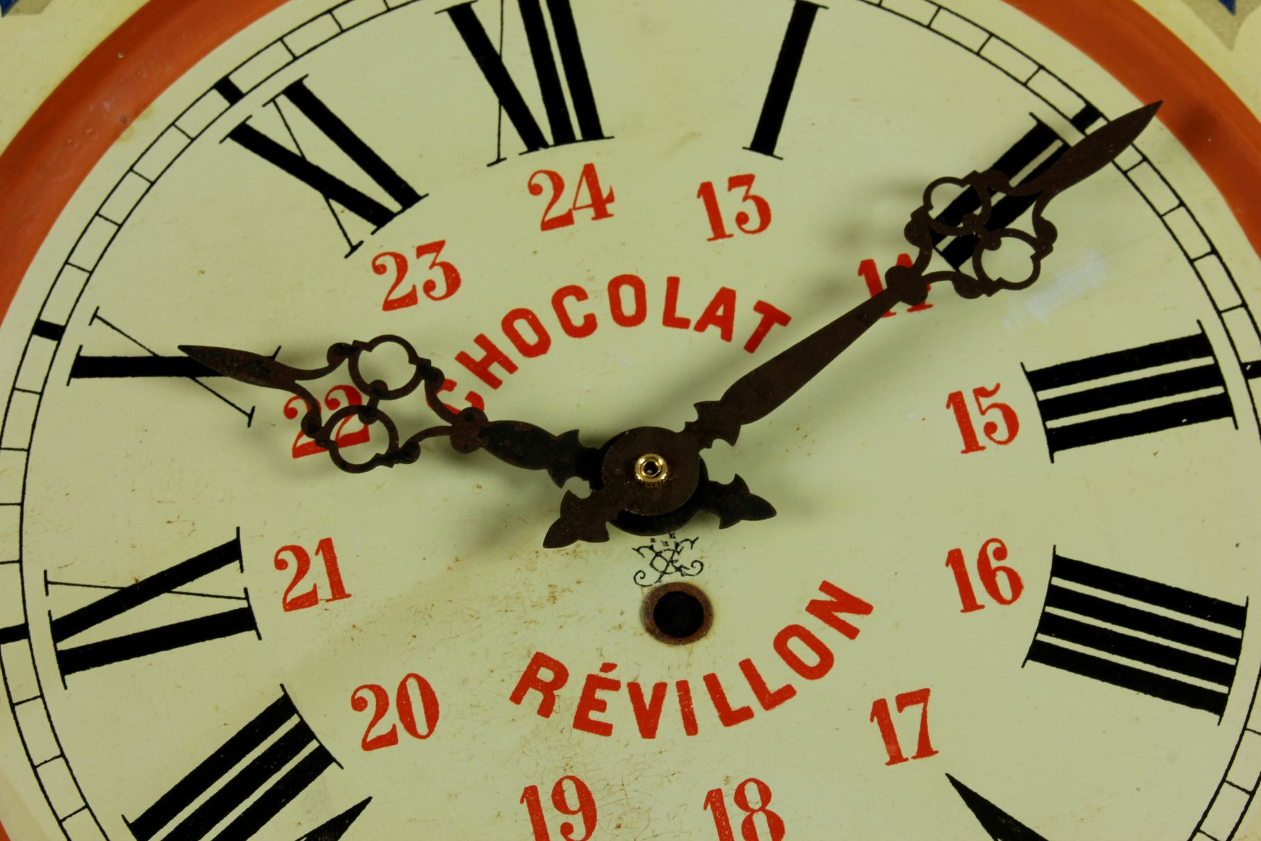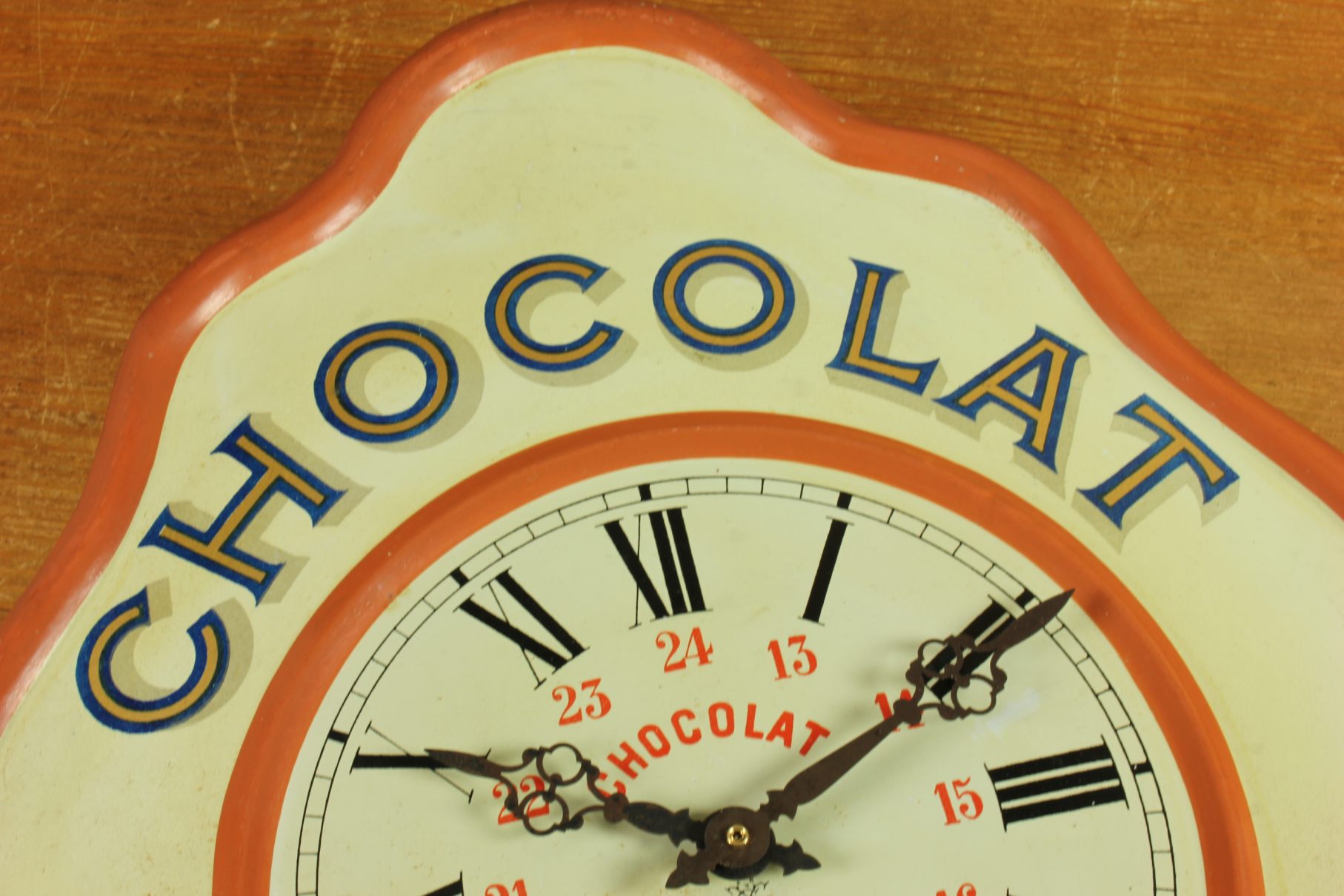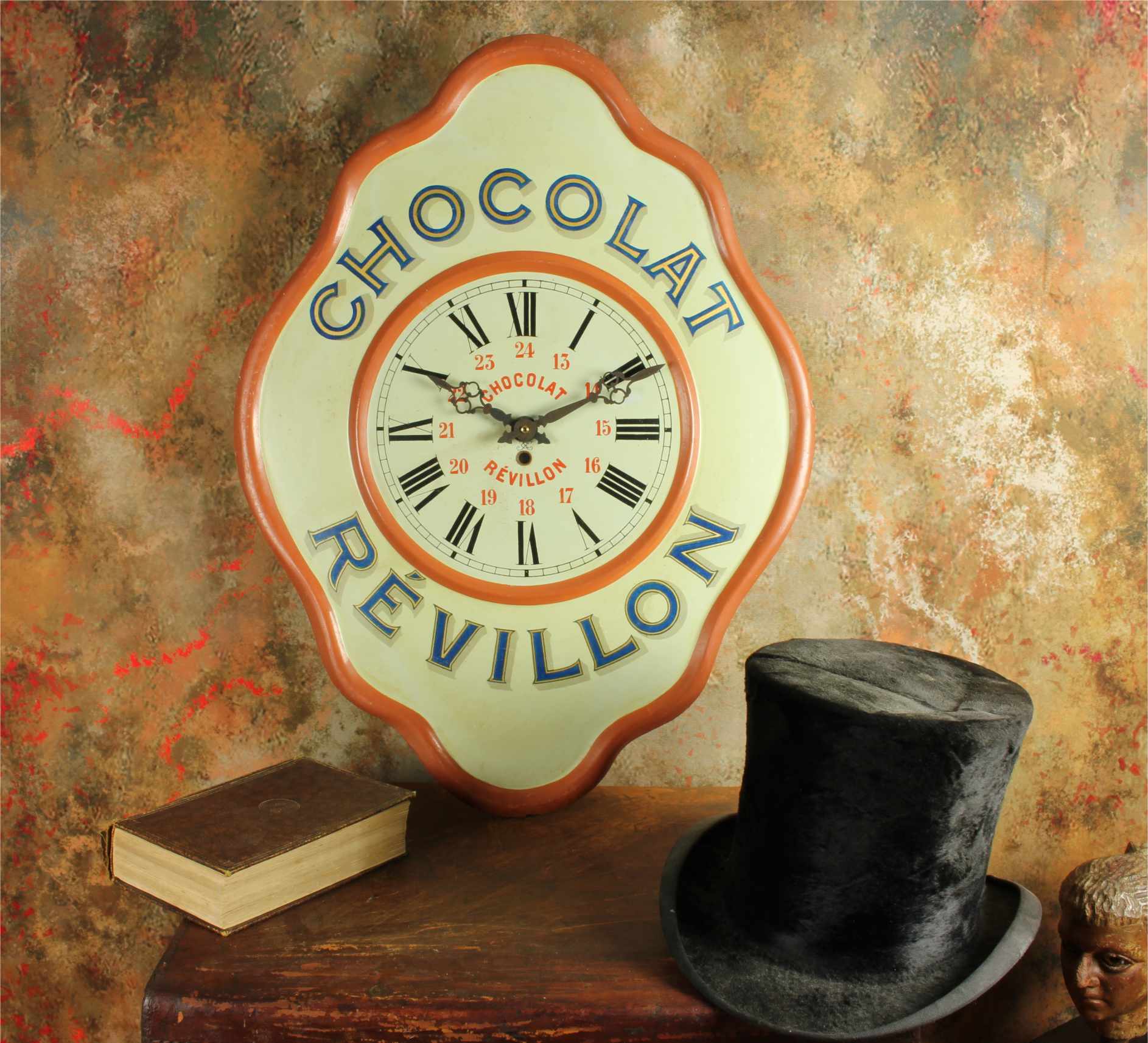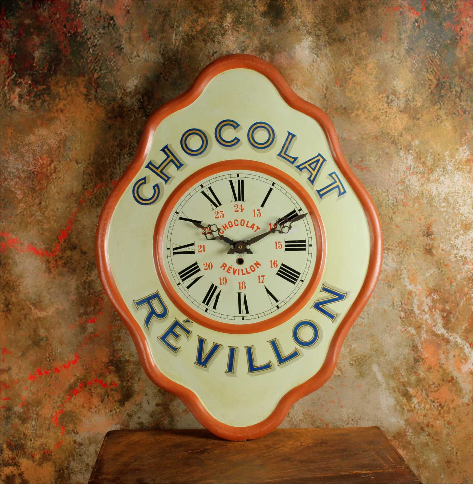 This highly decorative advertising clock would have originally been hung in a French Chocolate shop or cafe to advertise Chocolat Revillon and has lots of charm.