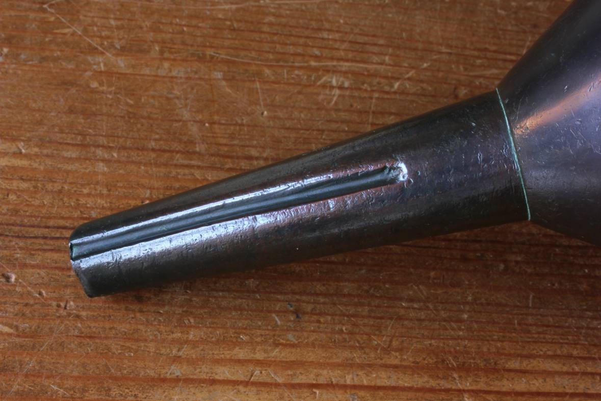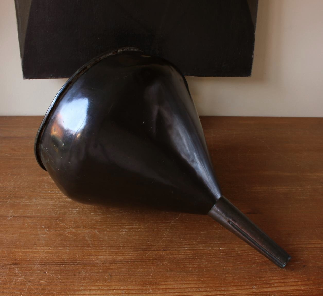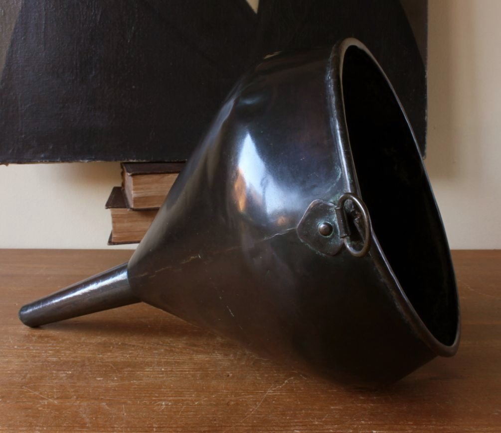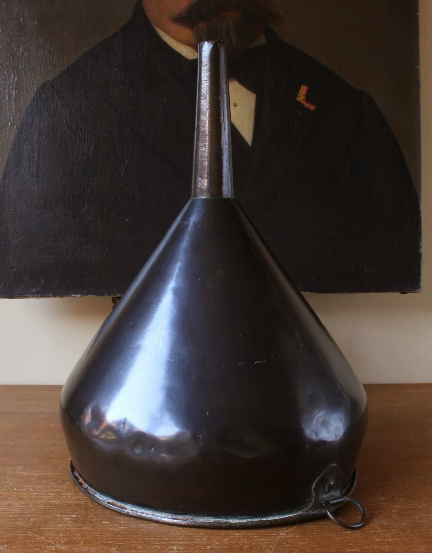 This antique distillery or brewery funnel is an extra large size, has a side seam and has a riveted hanging loop so is easy to display.