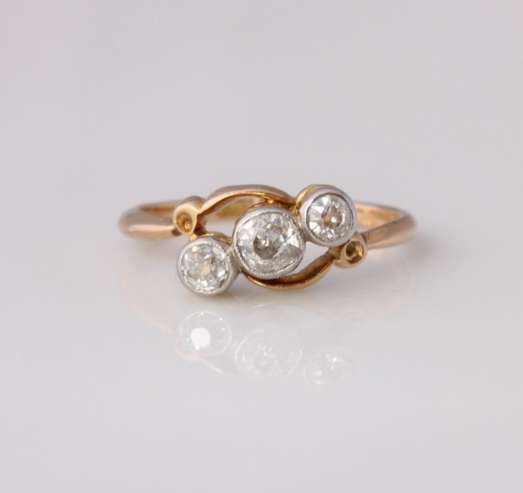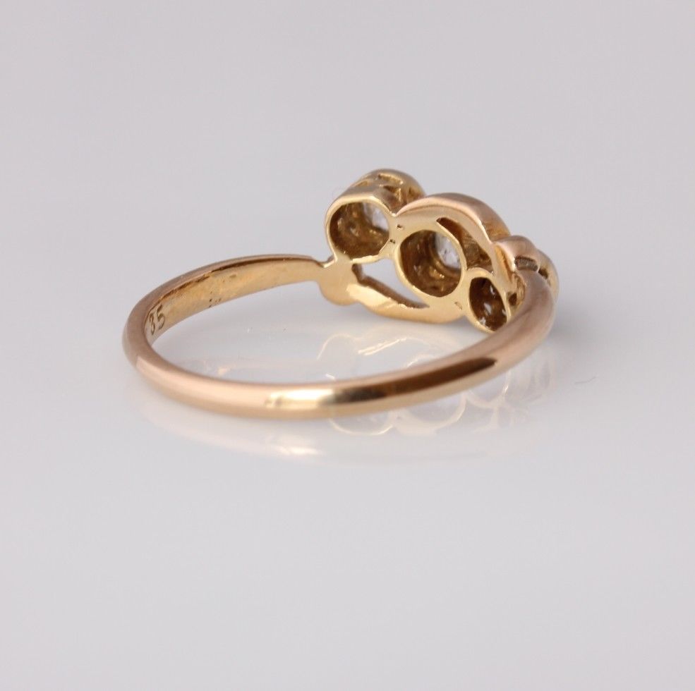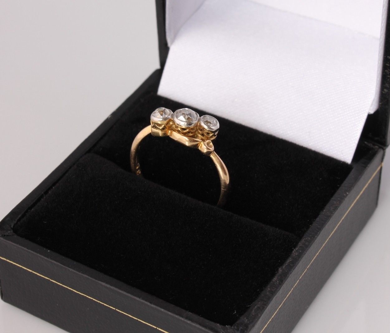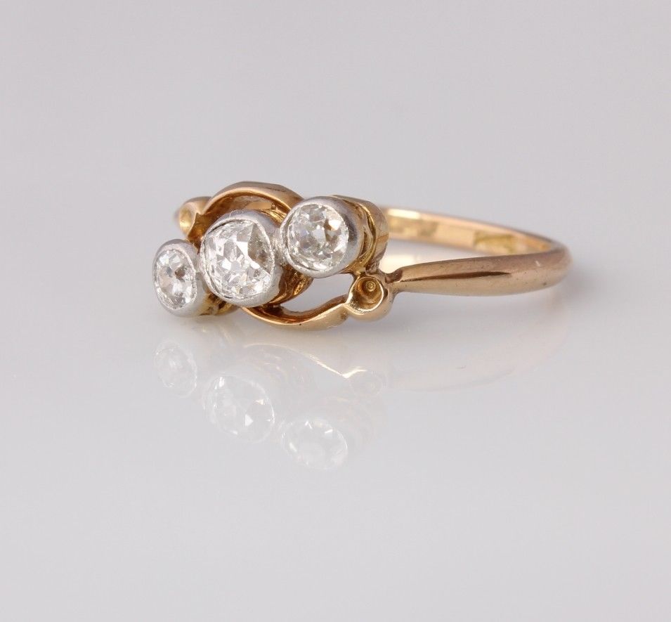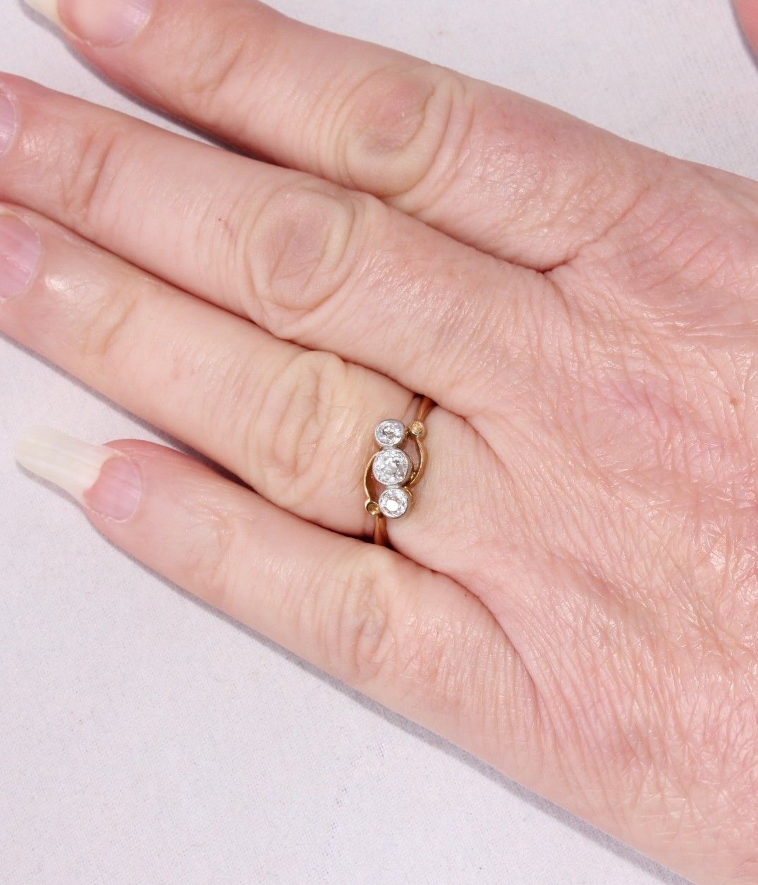 This wonderful antique 18ct yellow gold crossover ring has an off-set line of 3 graduated old cut natural diamonds totalling 0.35ct which are sparkly, bright and lively. This antique ring would make a really lovely gift.