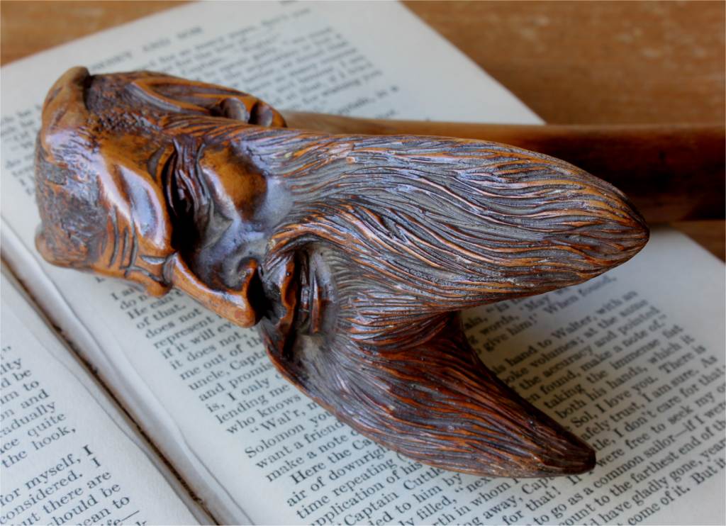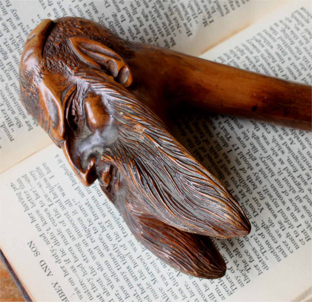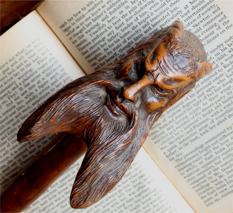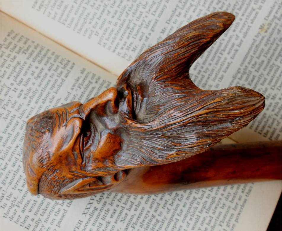 This handle has fine detail to the carving showing the devil's horns, pointed ears, teeth and long beard.