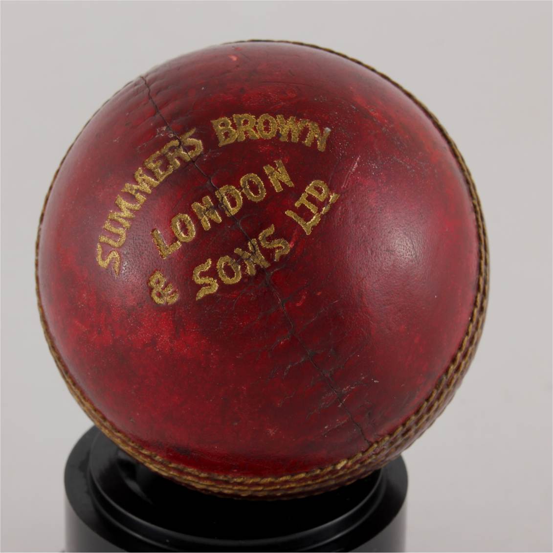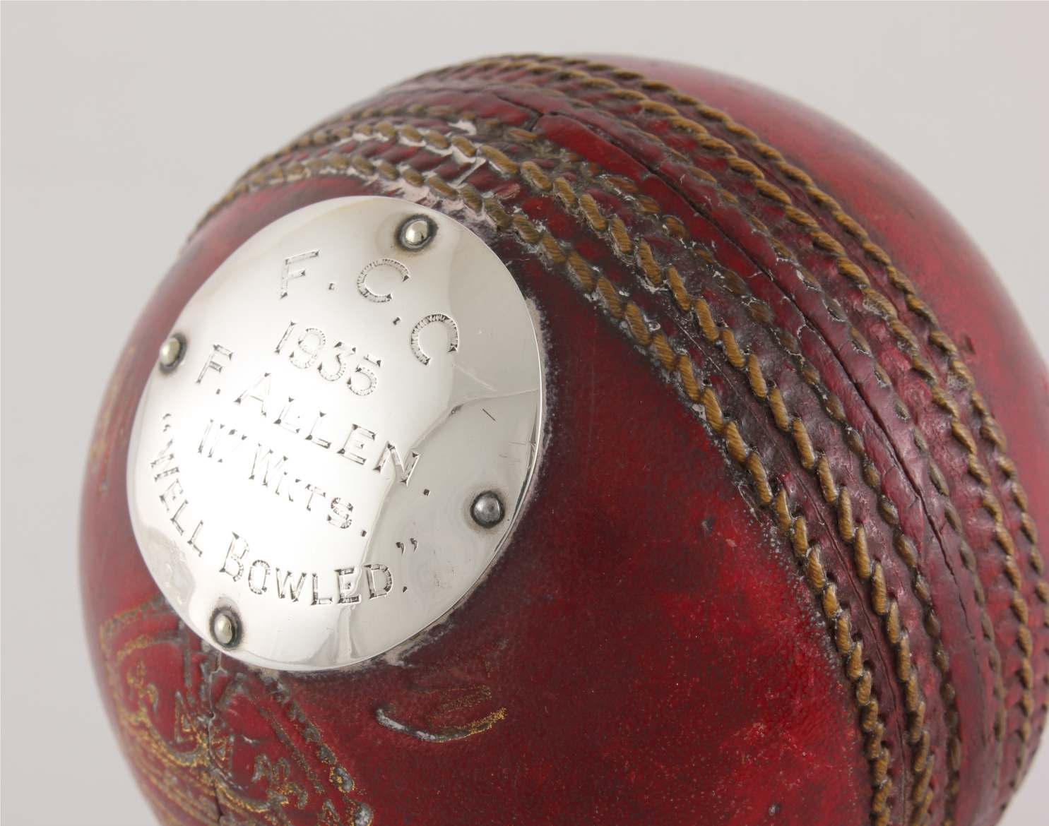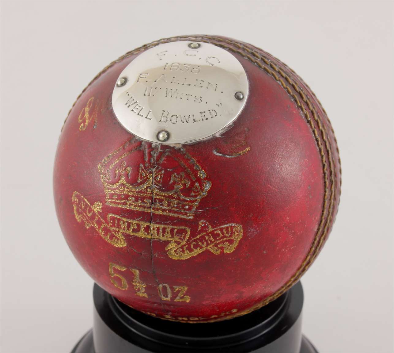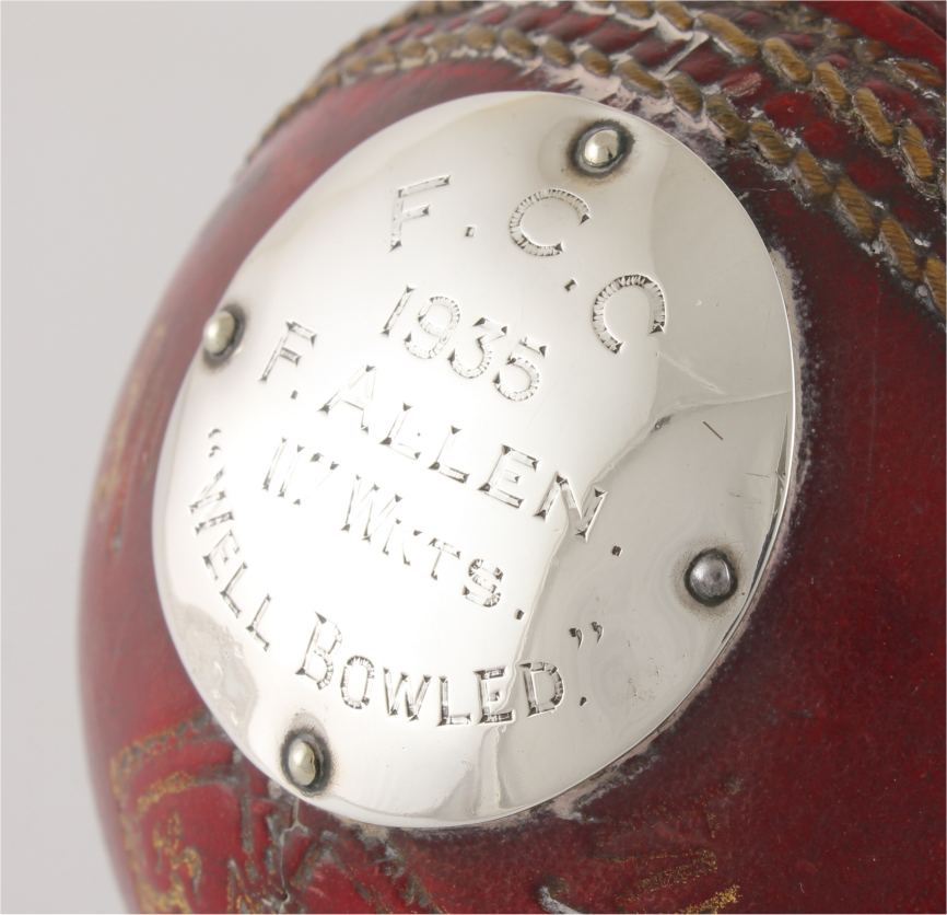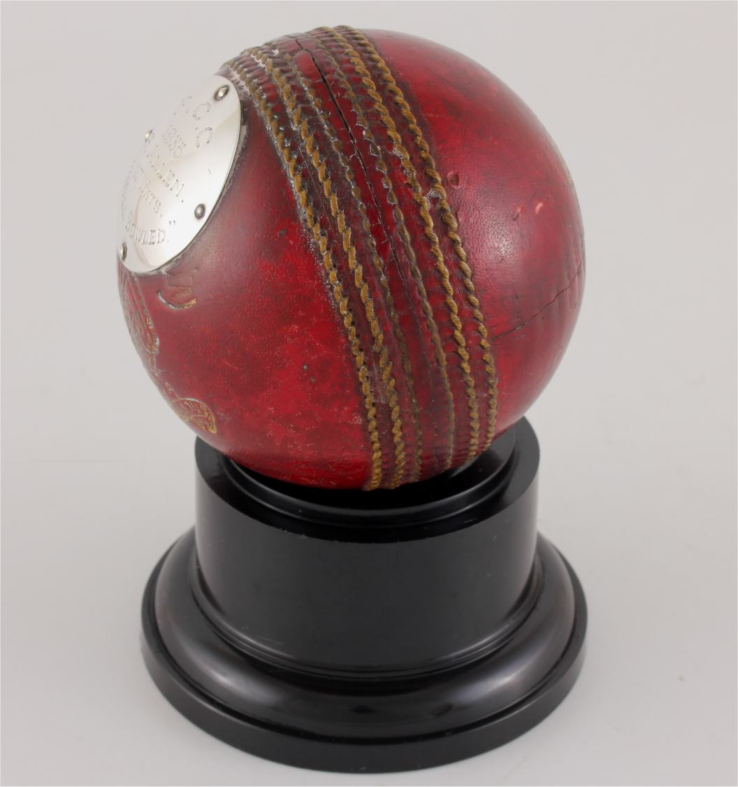 This cricket ball trophy which was made using the original Summers Brown & Sons Ltd cricket ball from the F.C.C match played in 1935 features a silver metal engraved plaque to the front that reads