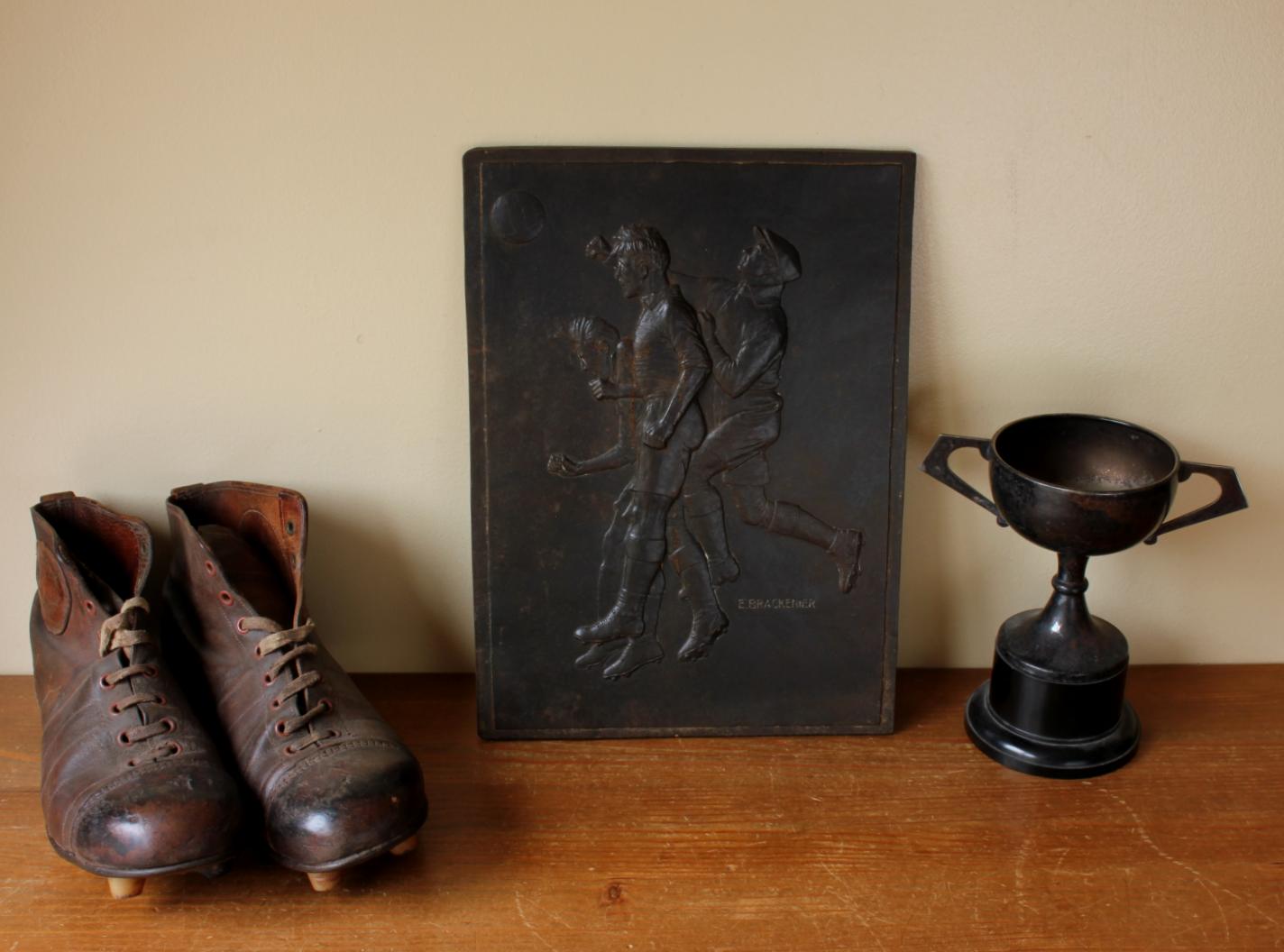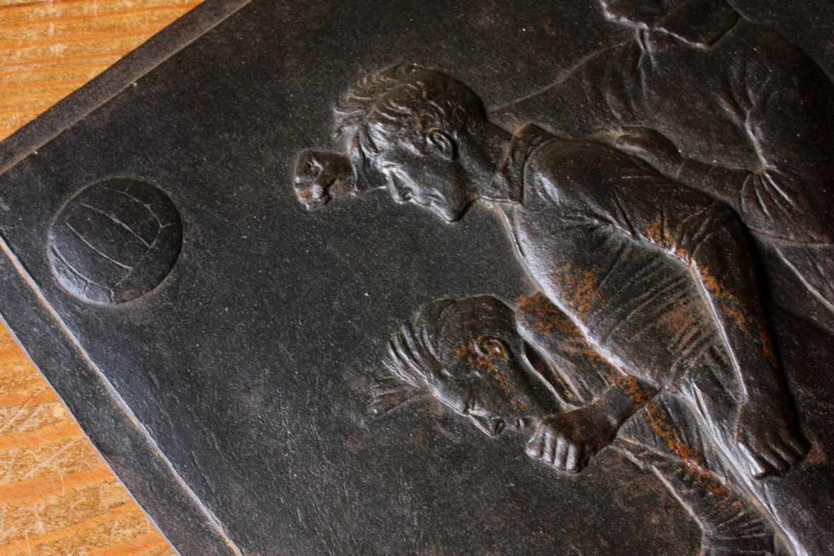 This interesting Belgian football plaque which is made of heavy cast metal shows 3 footballers playing a game of football with one heading the ball.