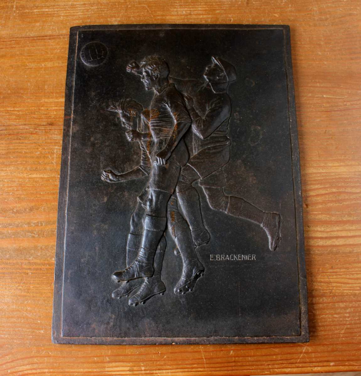 This unusual plaque dates from the middle of the 20th century, is a heavy weight, is of good quality with lots of good detail and is signed E. Brackenier. It could have possibly been given as an award plaque but is also a nice decorative piece.