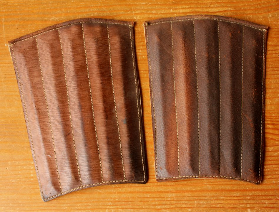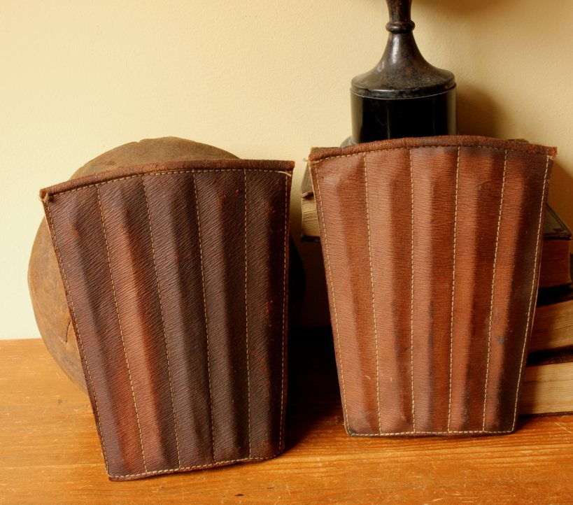 This pair of antique / vintage shinpads which date from the first half of the 20th century are made of brown leather, have canvas backs and cane tube stiffeners inside.