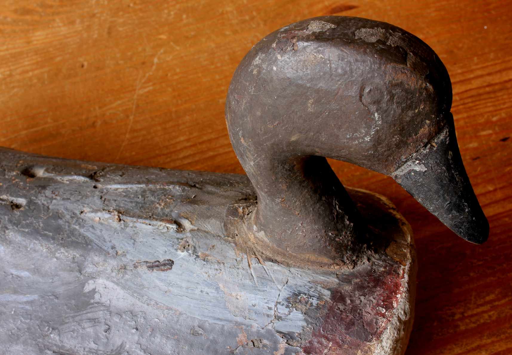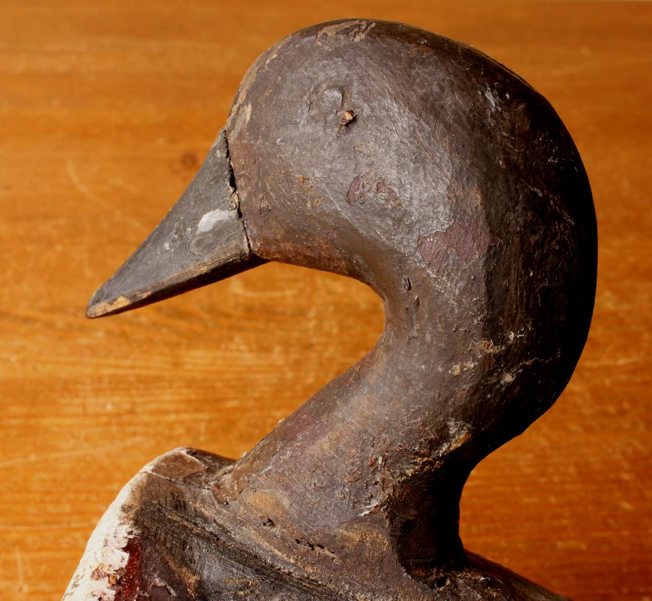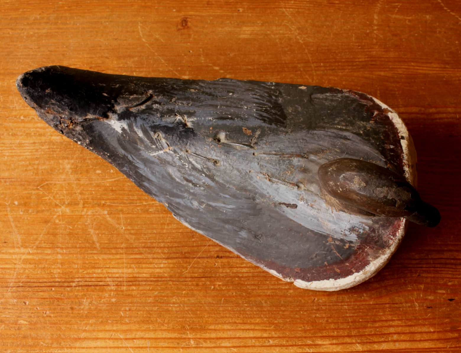 This wonderful and original antique decoy duck which is made of cork has a wooden beak, is painted black and white with red markings to the underside and has metal wire fixings to the underside.