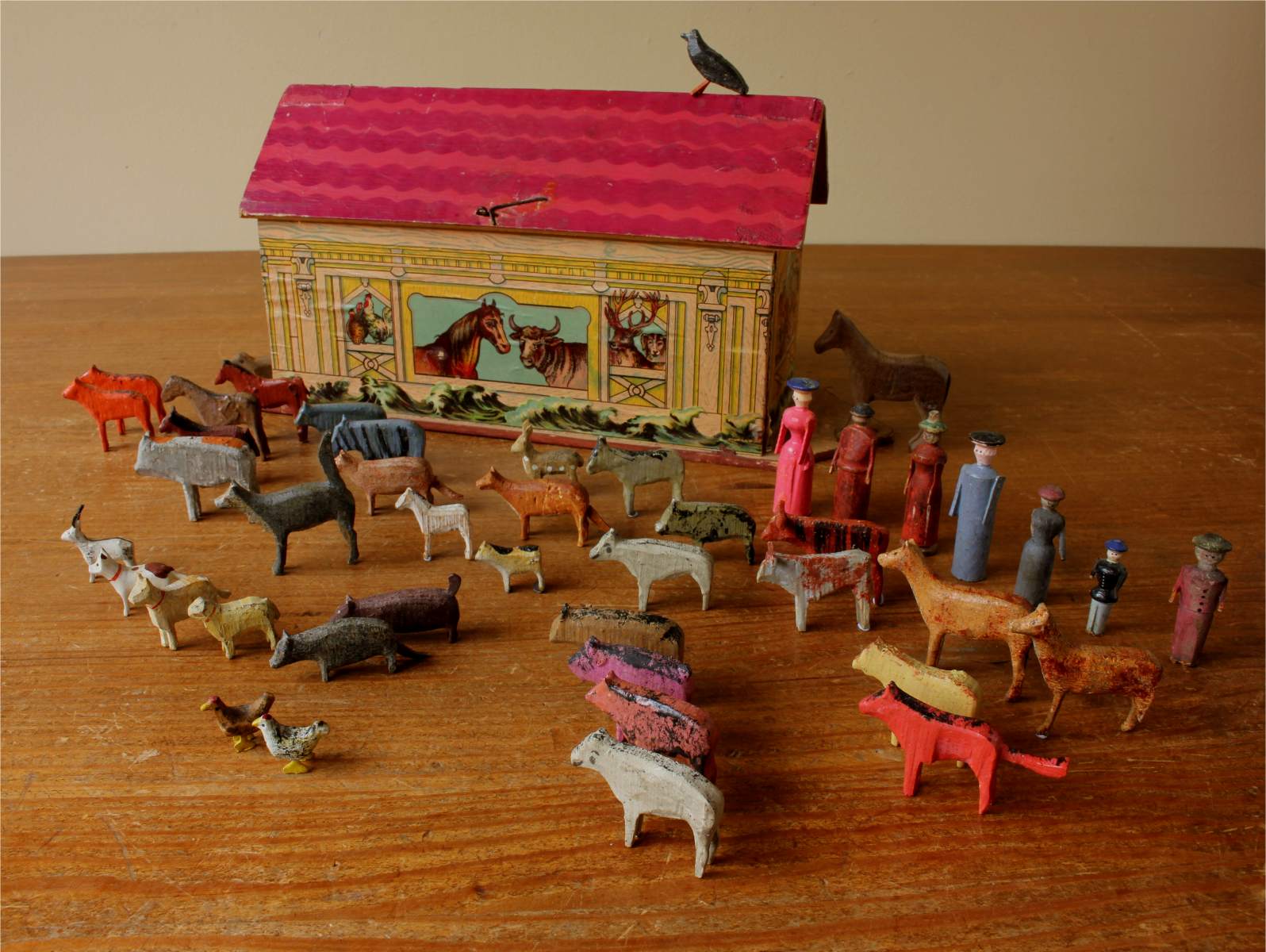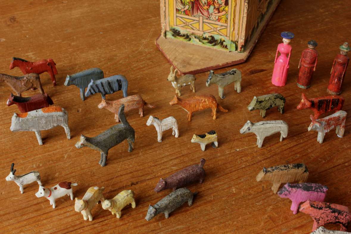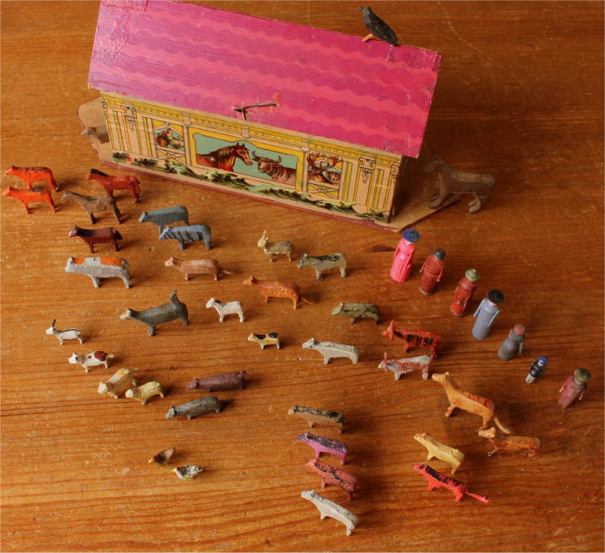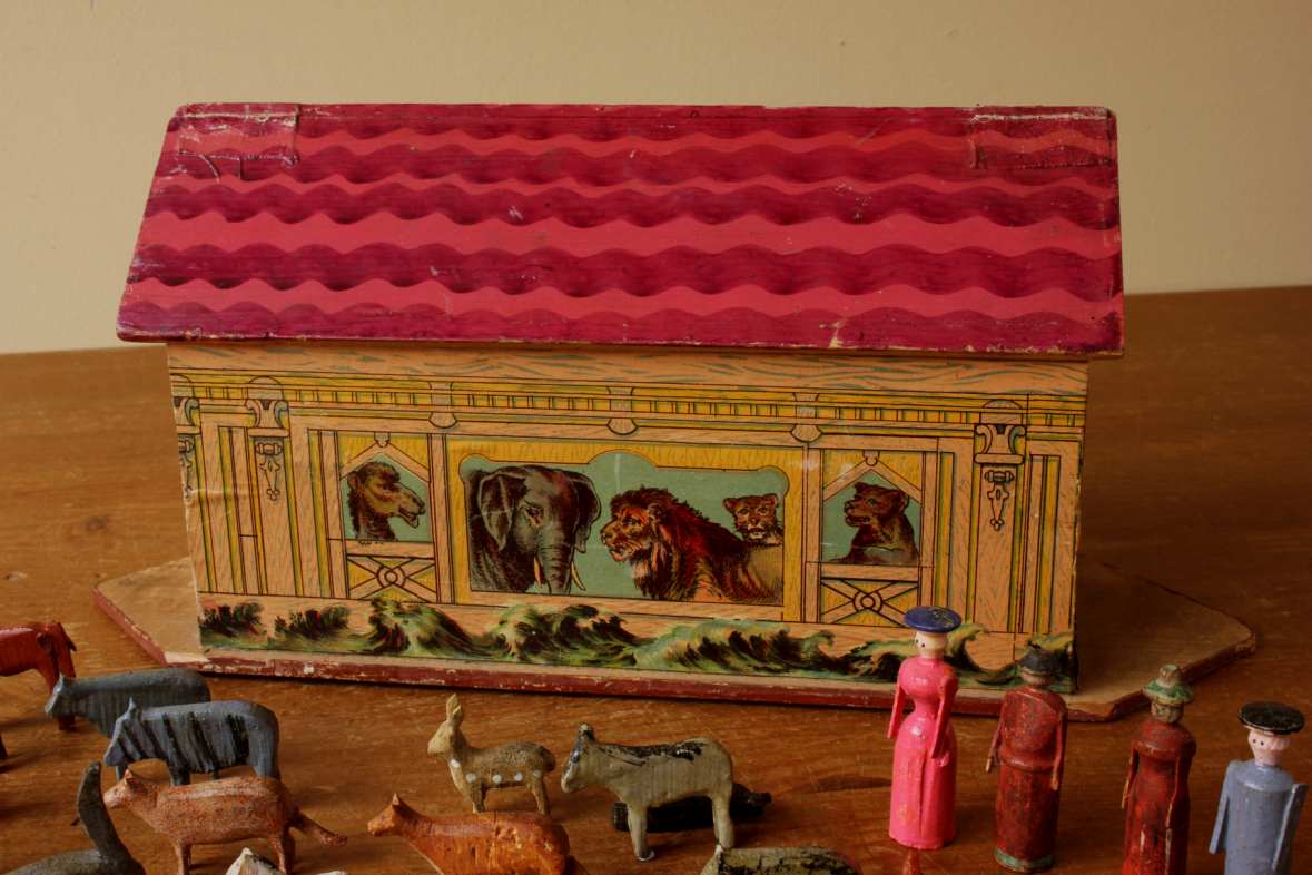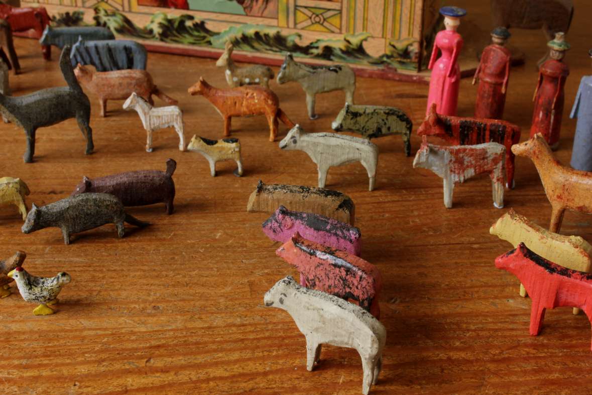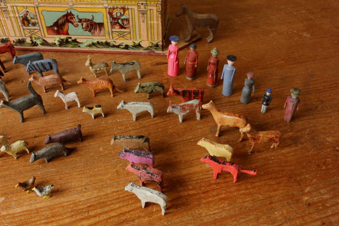 This flat bottomed ark which has a lithograph covering has a hinged lid which can be lifted to store away the figures (Mr & Mrs Noah and 5 other figures) and the 36 animals which are hand painted and hand carved of wood. There is a mixture of animals with most being farm animals and birds (plus 2 additional animals are also included which did not originally belong to the set but came with it).