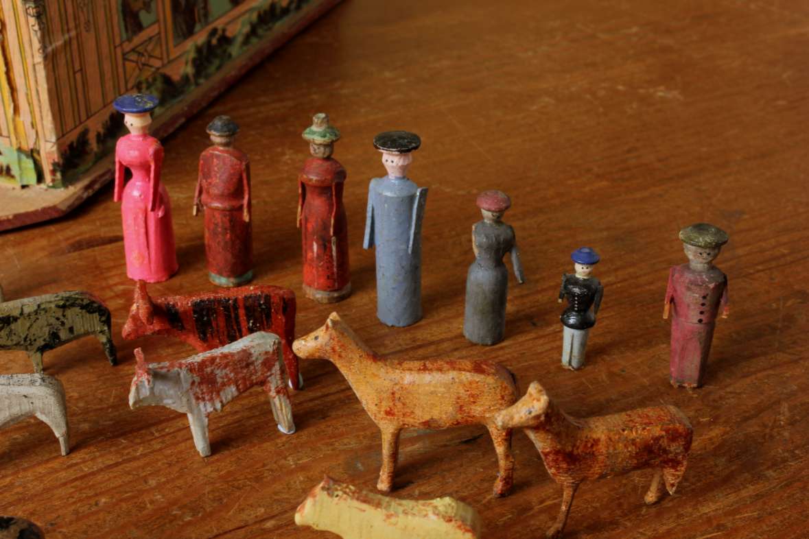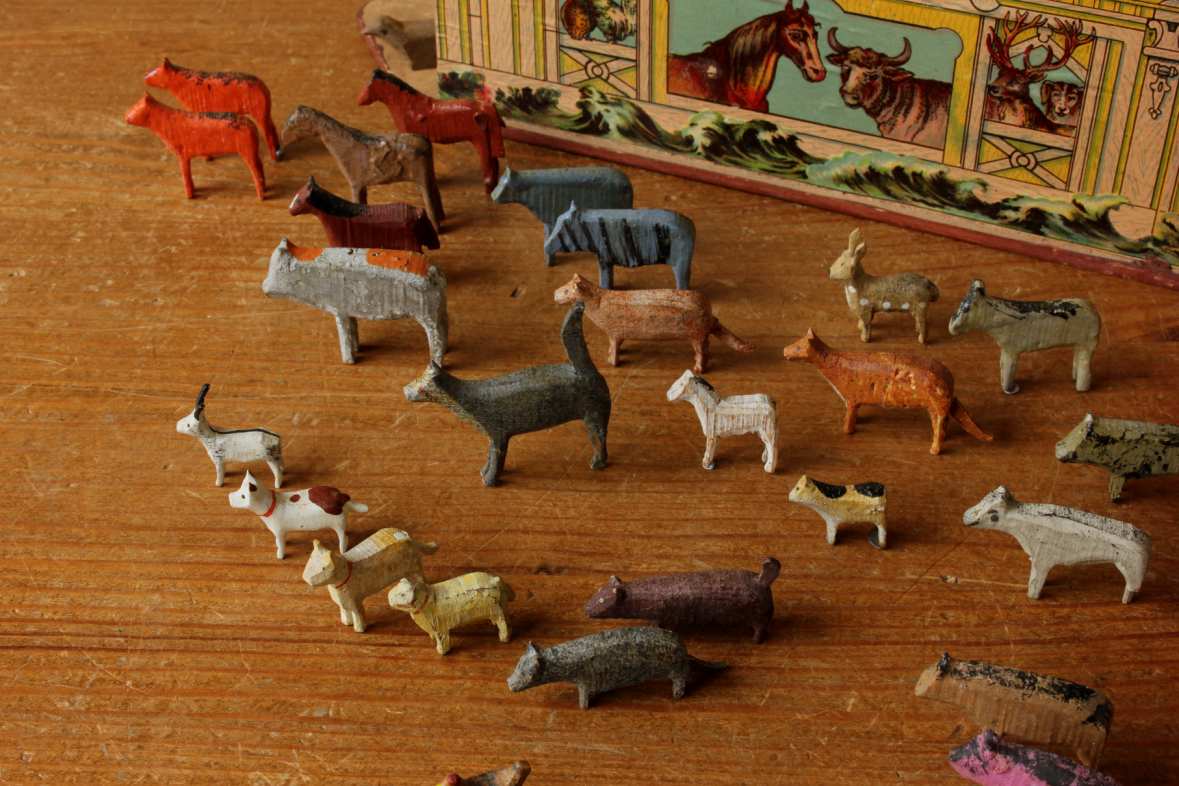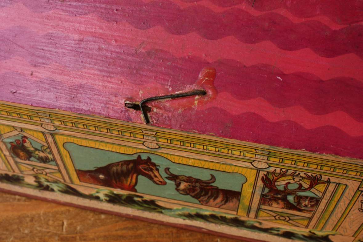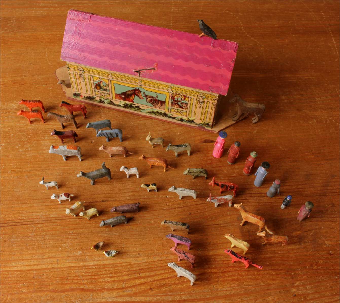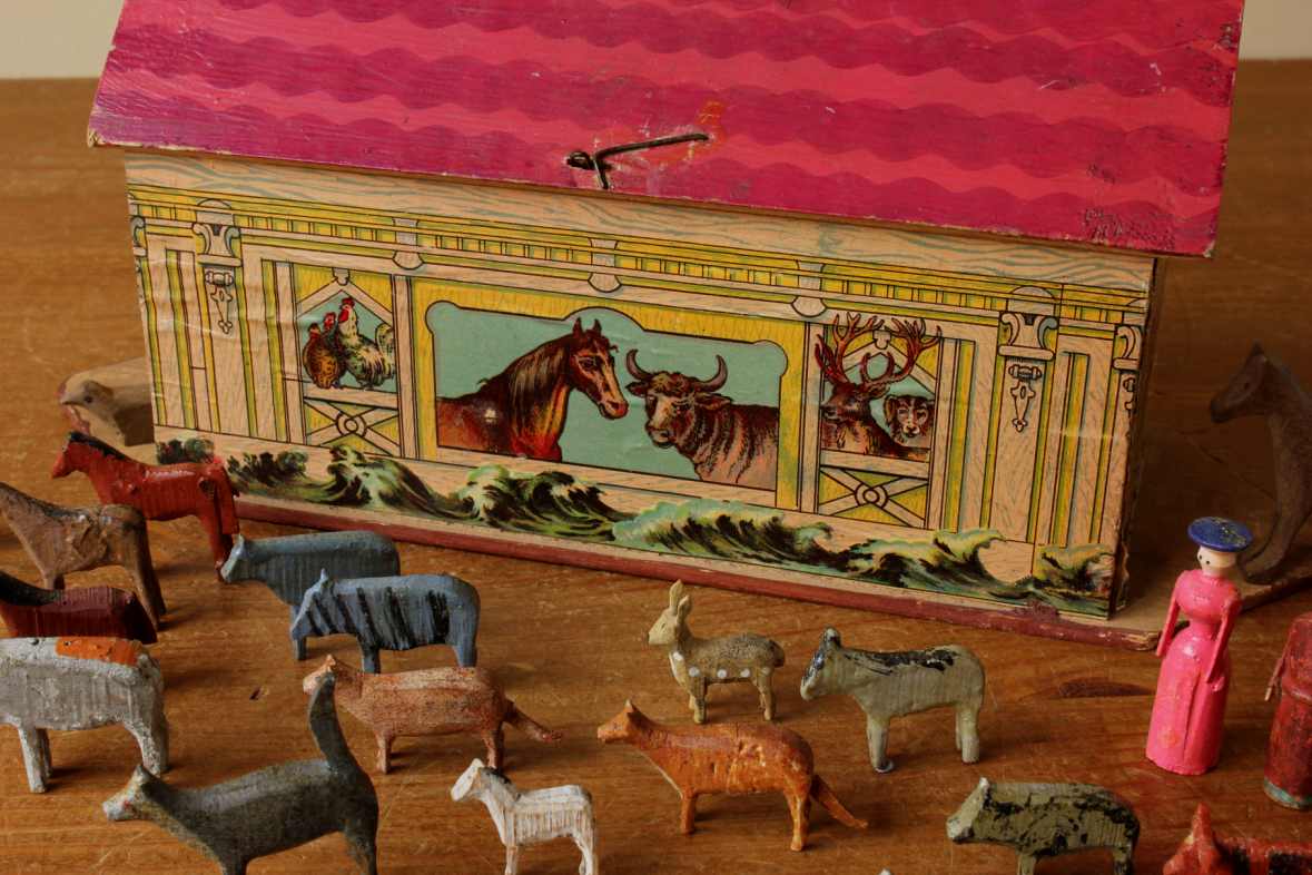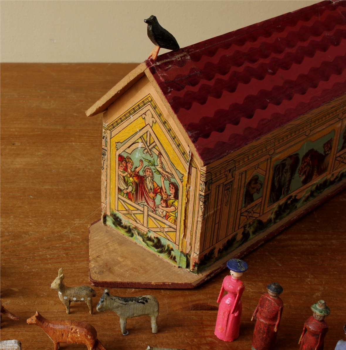 This flat bottomed ark which has a lithograph covering has a hinged lid which can be lifted to store away the figures (Mr & Mrs Noah and 5 other figures) and the 36 animals which are hand painted and hand carved of wood. There is a mixture of animals with most being farm animals and birds (plus 2 additional animals are also included which did not originally belong to the set but came with it).