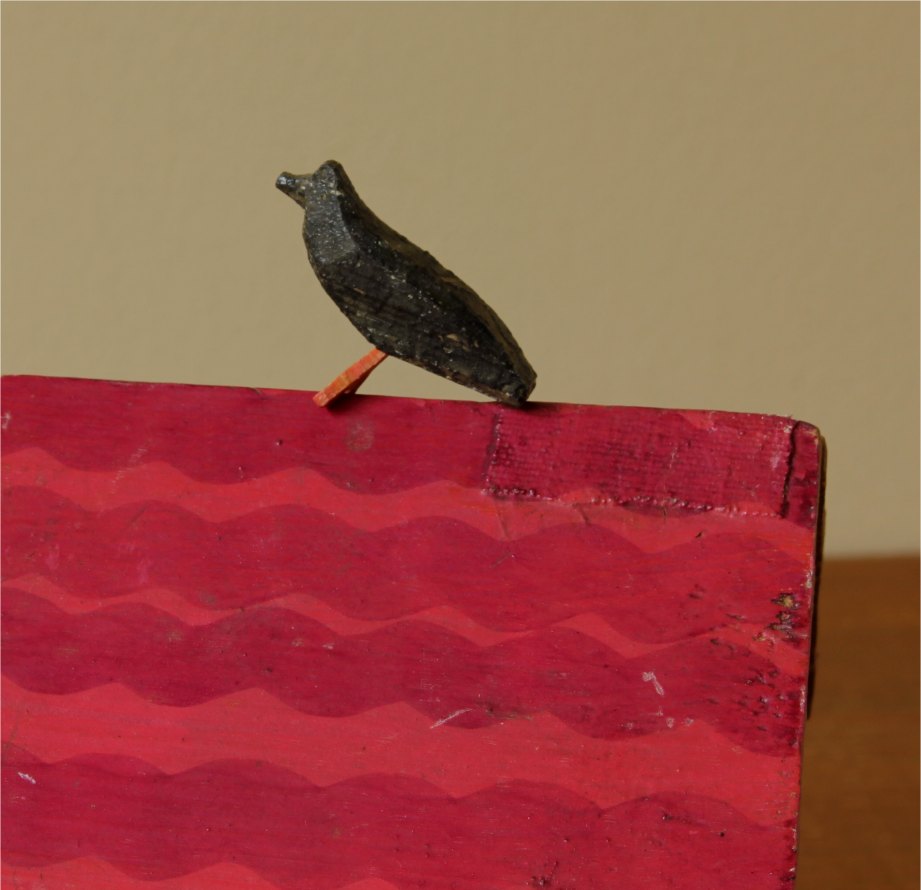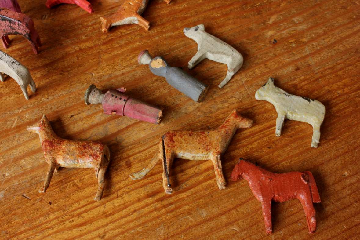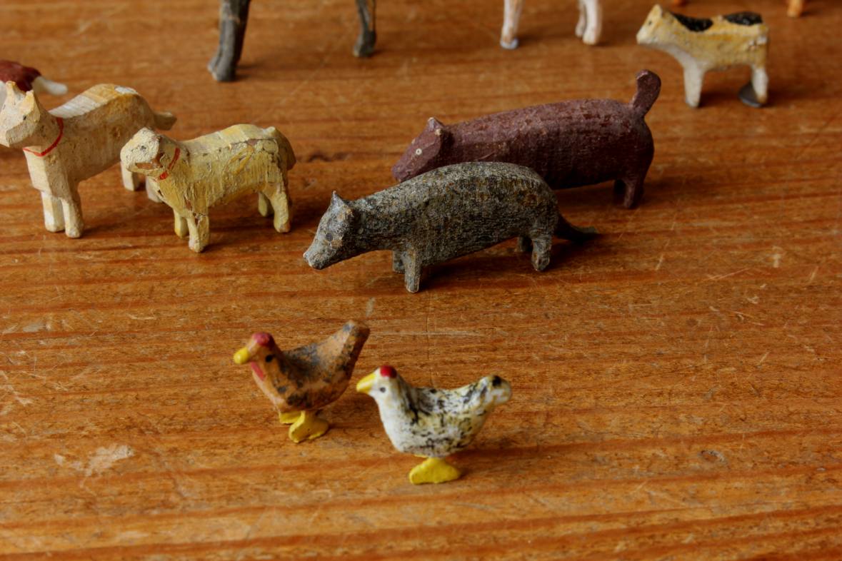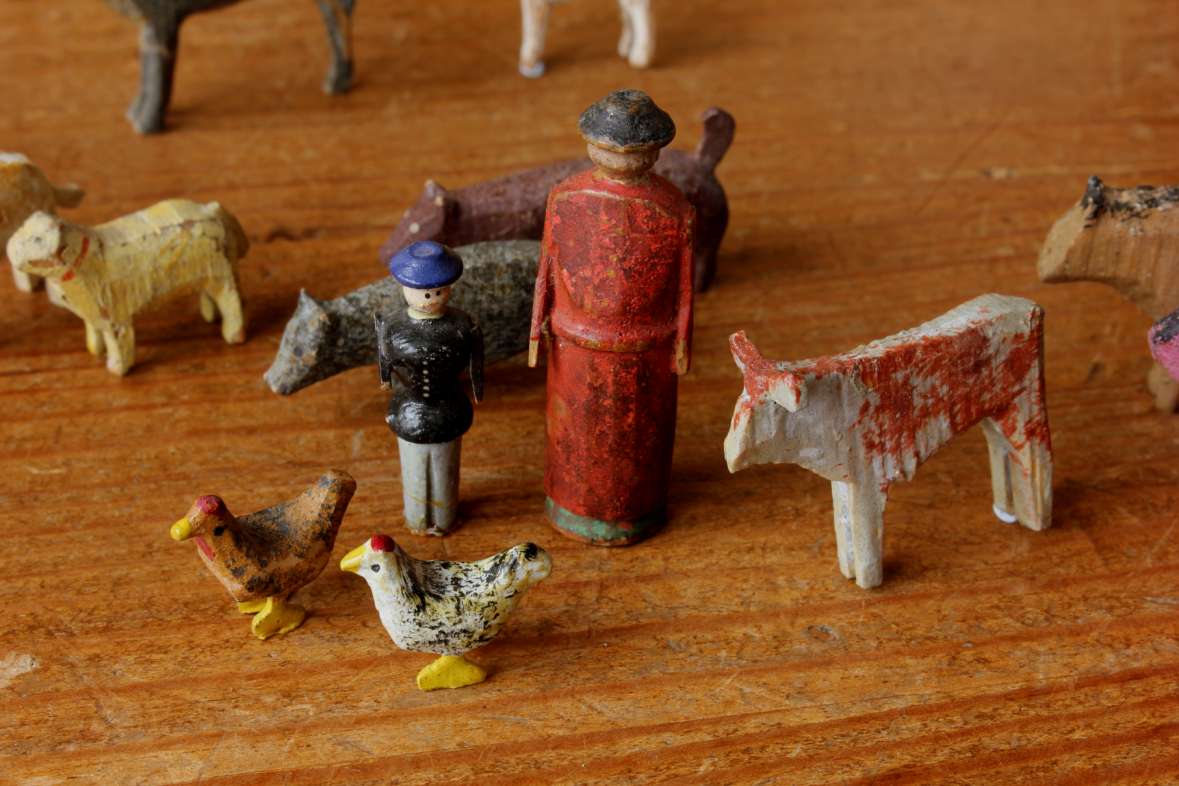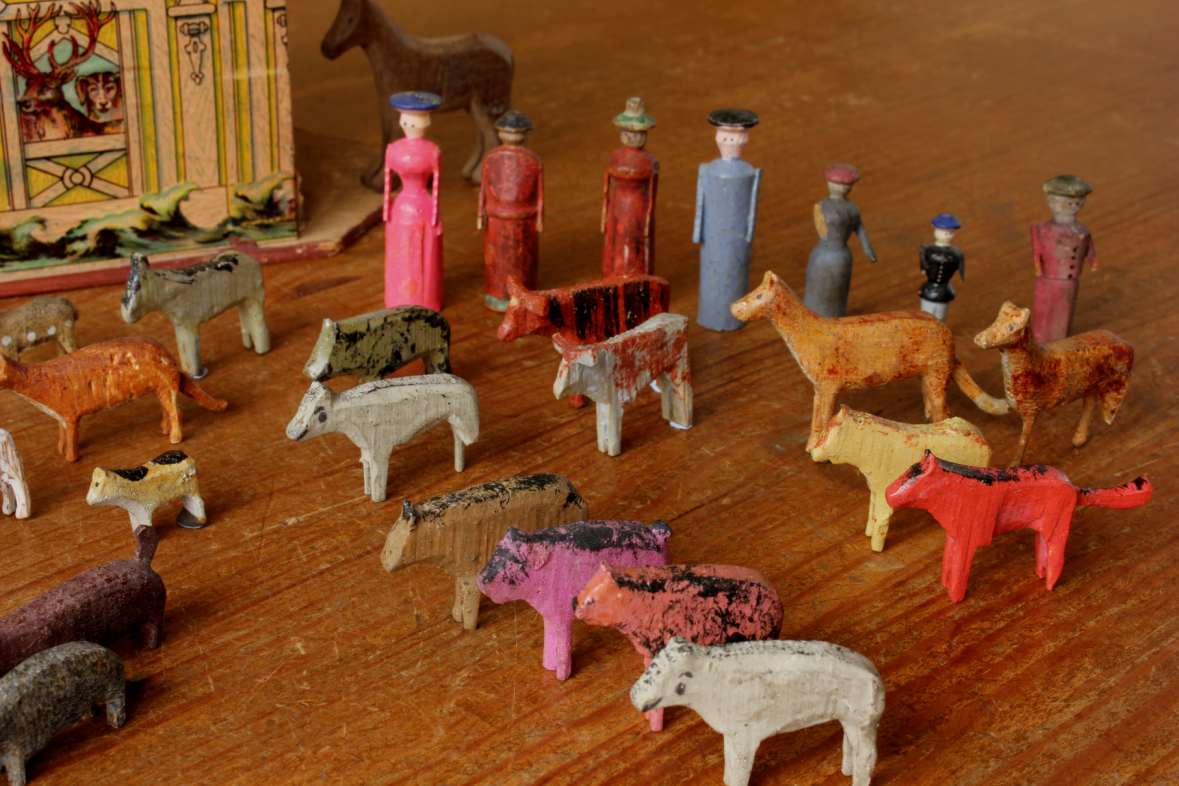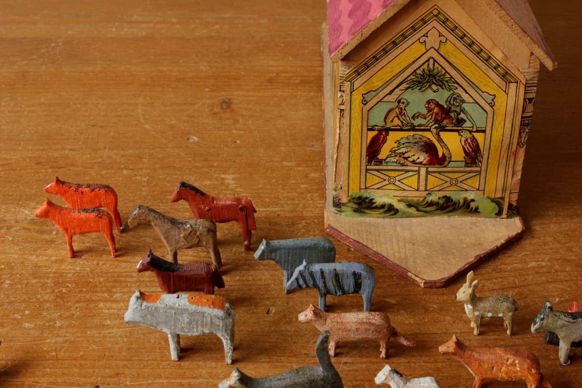 This flat bottomed ark which has a lithograph covering has a hinged lid which can be lifted to store away the figures (Mr & Mrs Noah and 5 other figures) and the 36 animals which are hand painted and hand carved of wood. There is a mixture of animals with most being farm animals and birds (plus 2 additional animals are also included which did not originally belong to the set but came with it).
