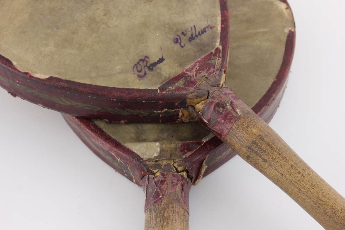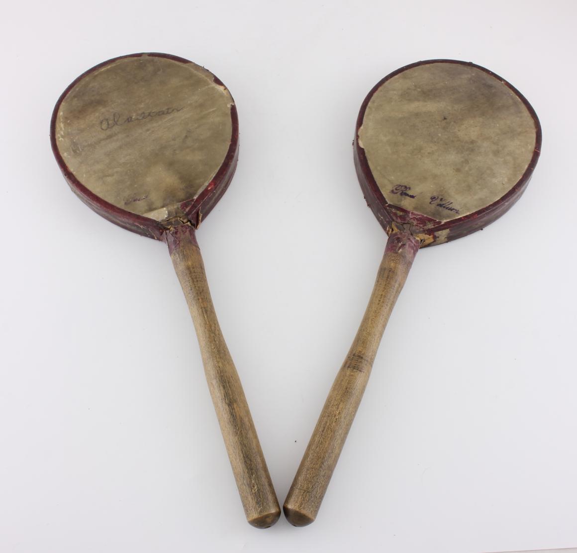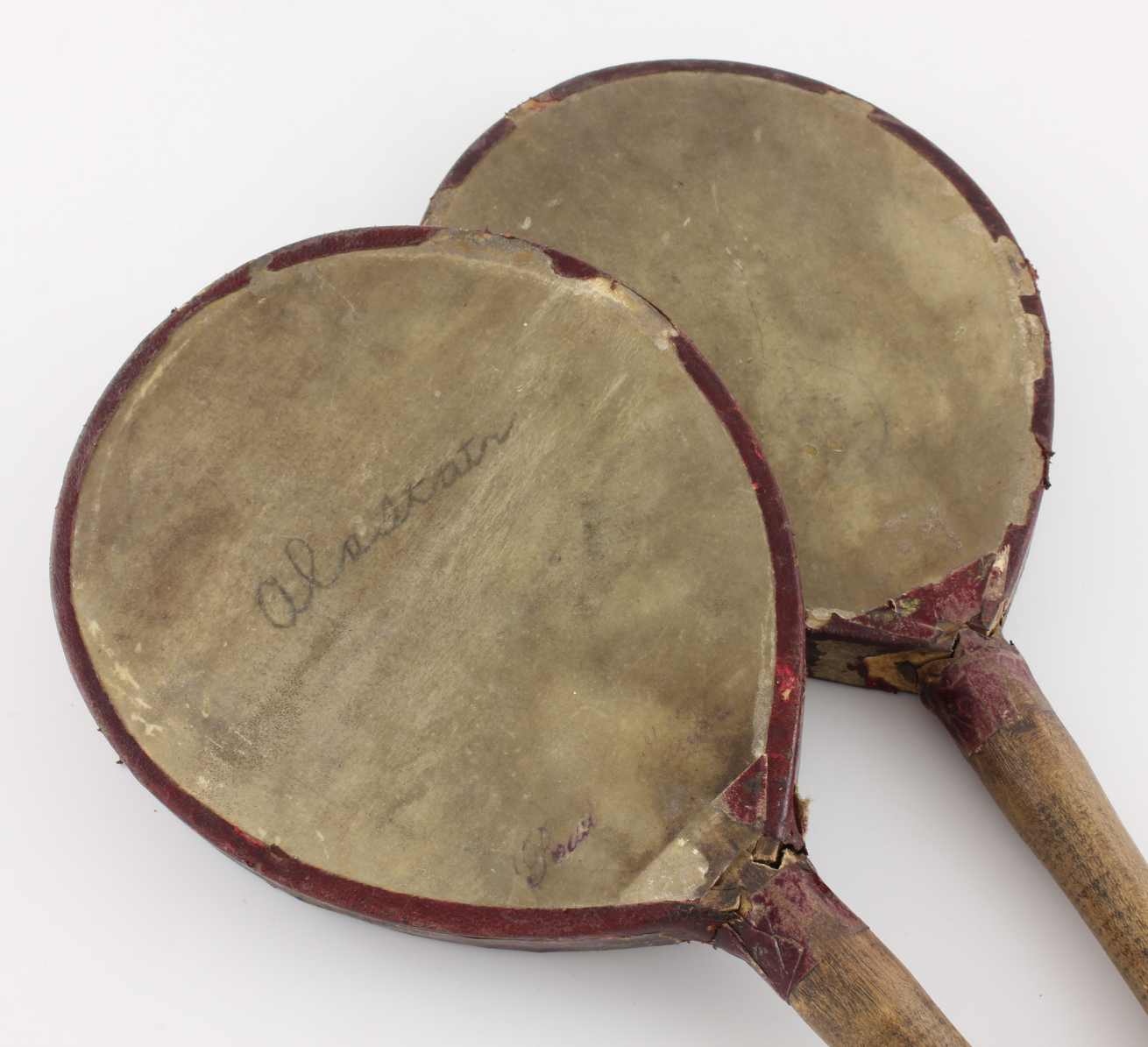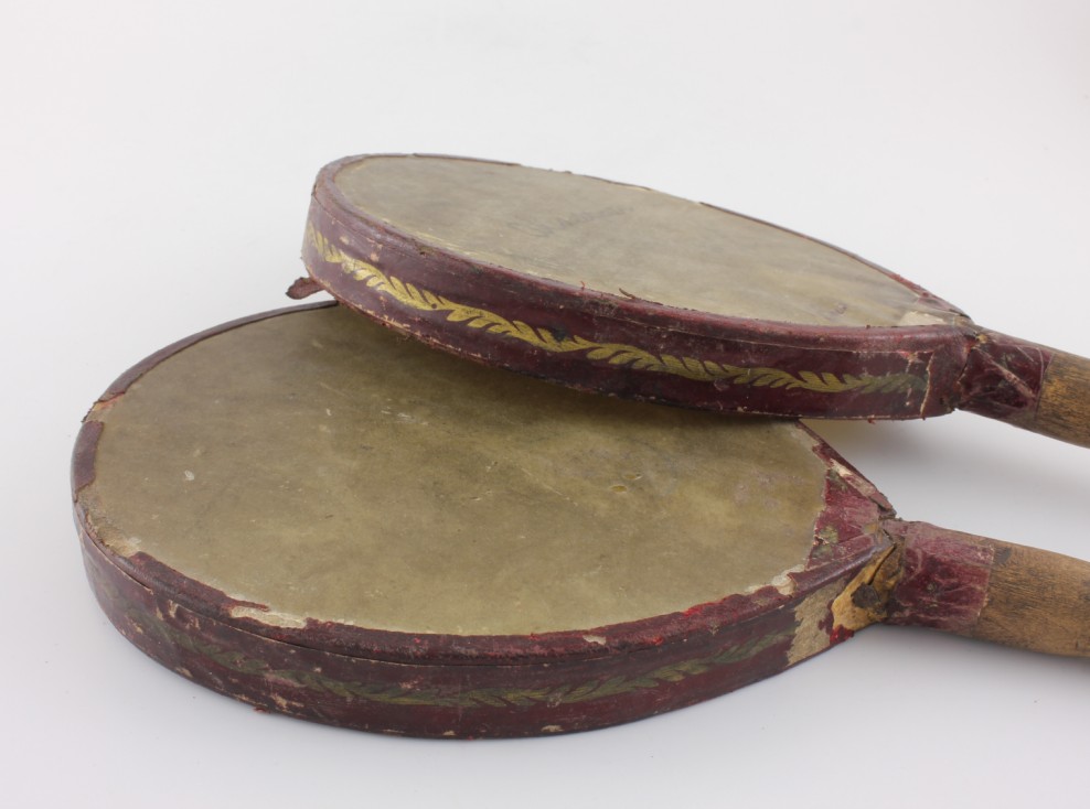This antique pair of ping pong bats which are made of wood are covered in vellum, have purple brown with gold decoration paper bindings to the edges and date from c1900.
