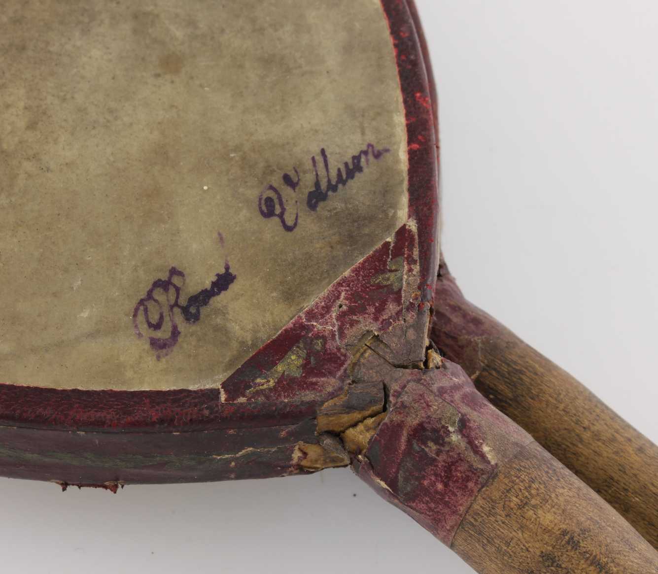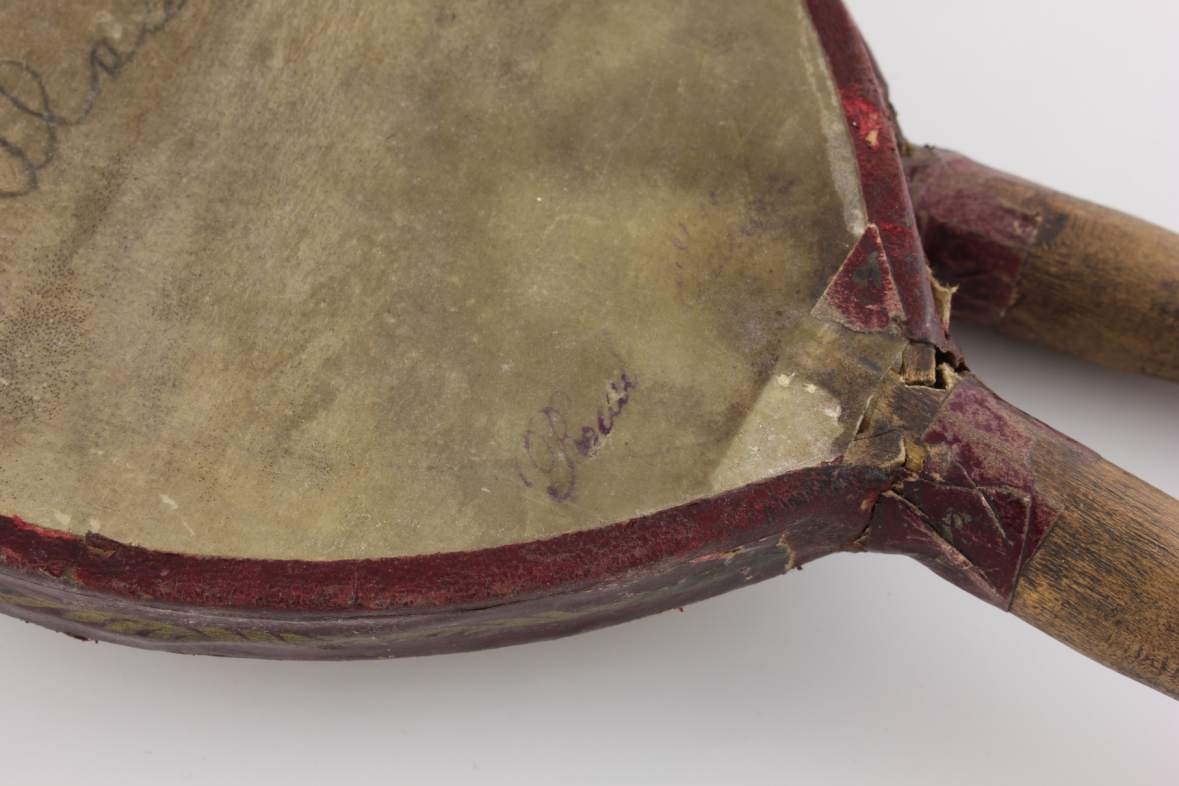 Condition: Good used antique condition with some age related wear. Some staining to vellum. Some cracking and losses to the binding in places. One of the handles is a little loose where it connects to the paddle section. Please see pictures.