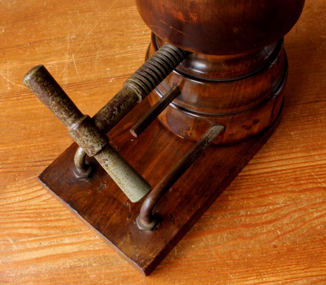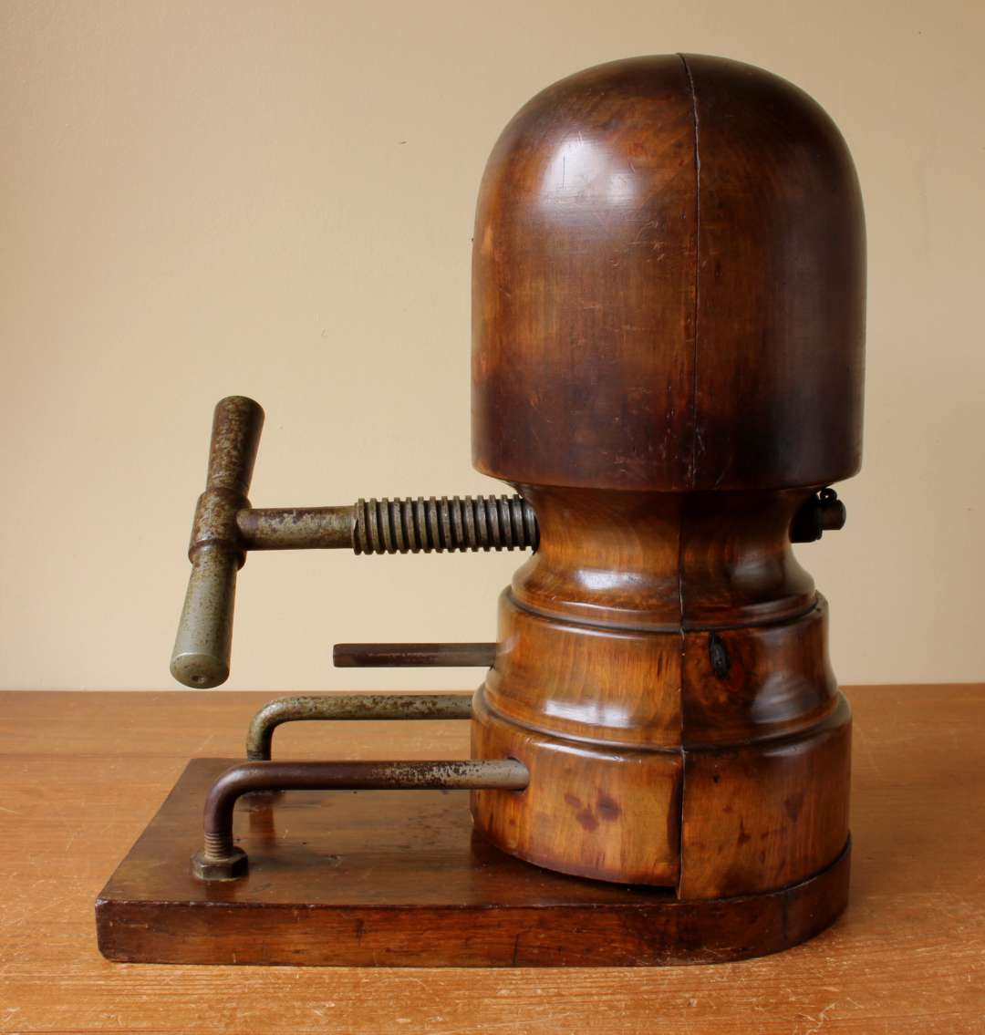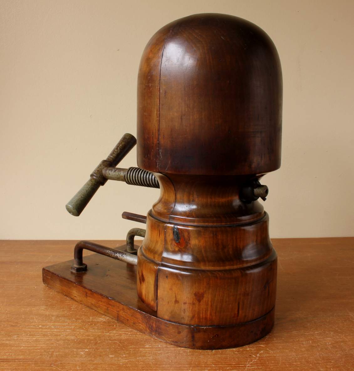 This antique mechanical French Milliner's hat stretcher which dates from c1900 sits on it's wooden base, is a good size and has an amazing rich dark brown patina so looks fantastic on display.