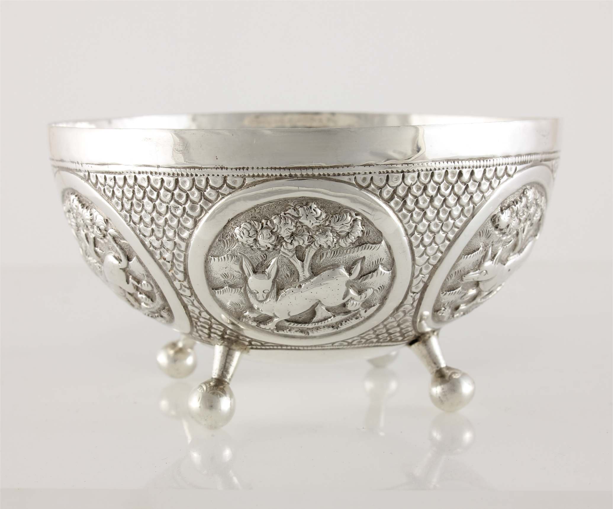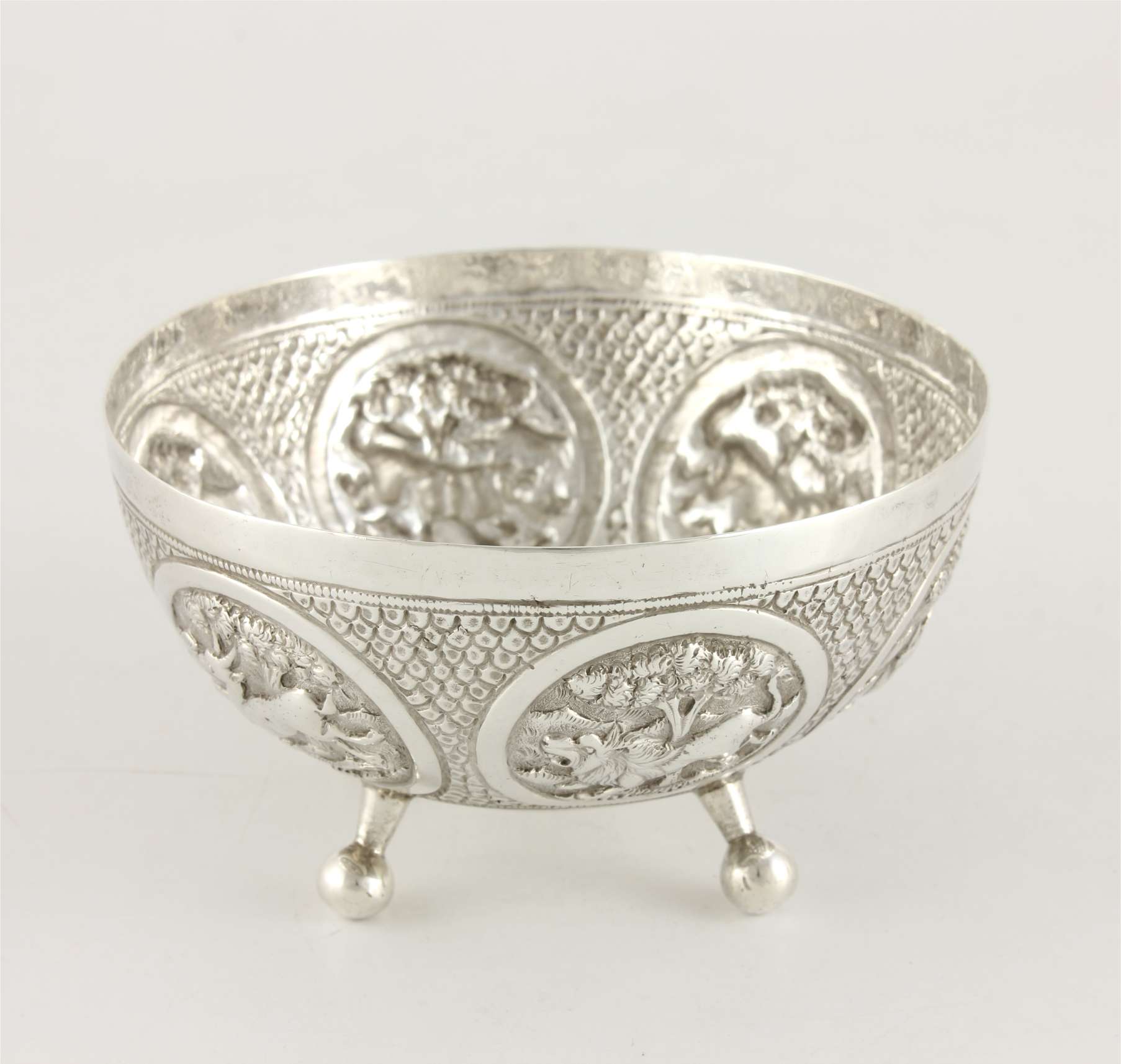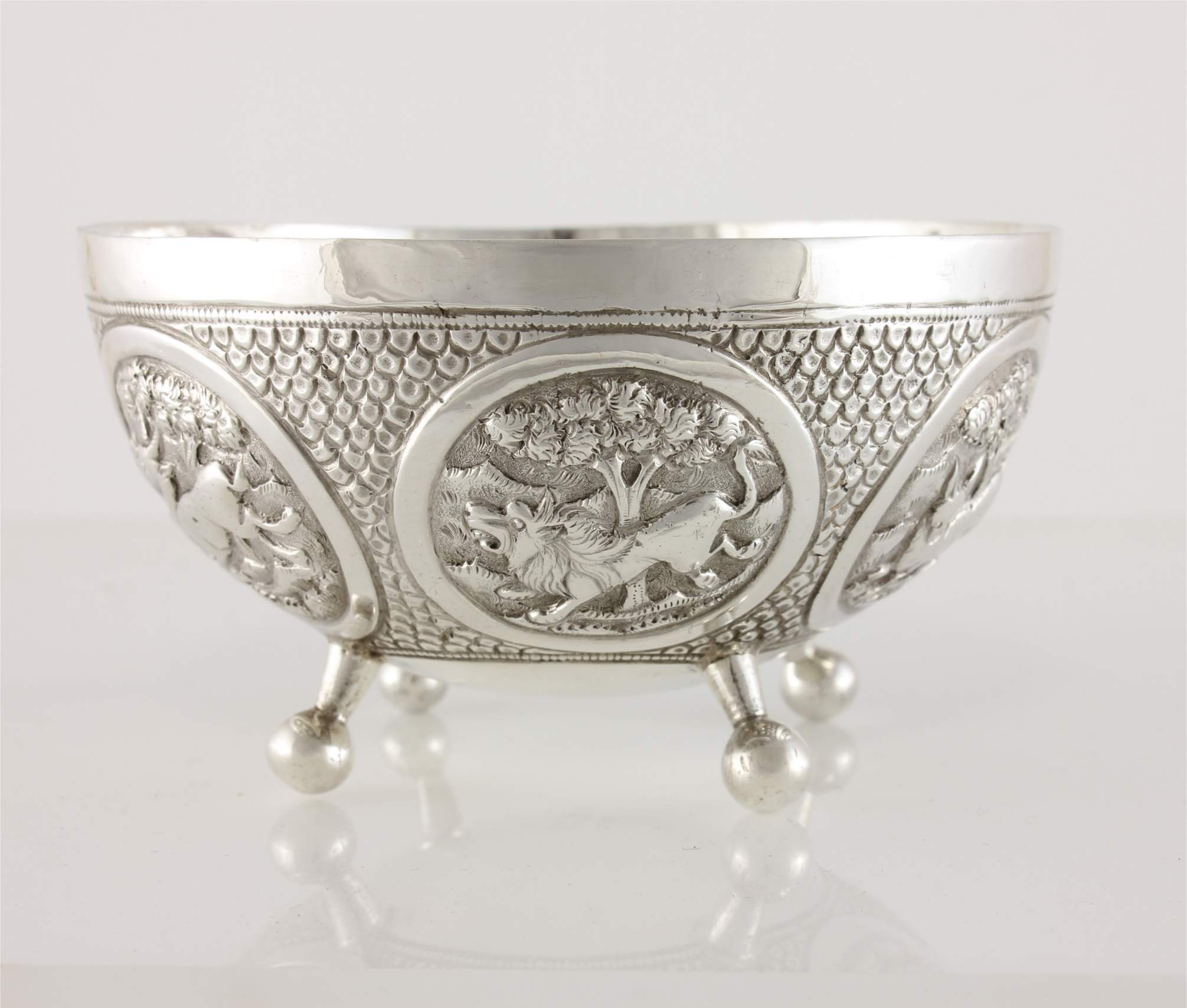 This quality Indian silver bowl which dates from the late 19th / early 20th century is beautifully decorated with hand chased detail and has an embossed wild animal design with lions, wild boar, antelope and other Indian animals around the bowl.