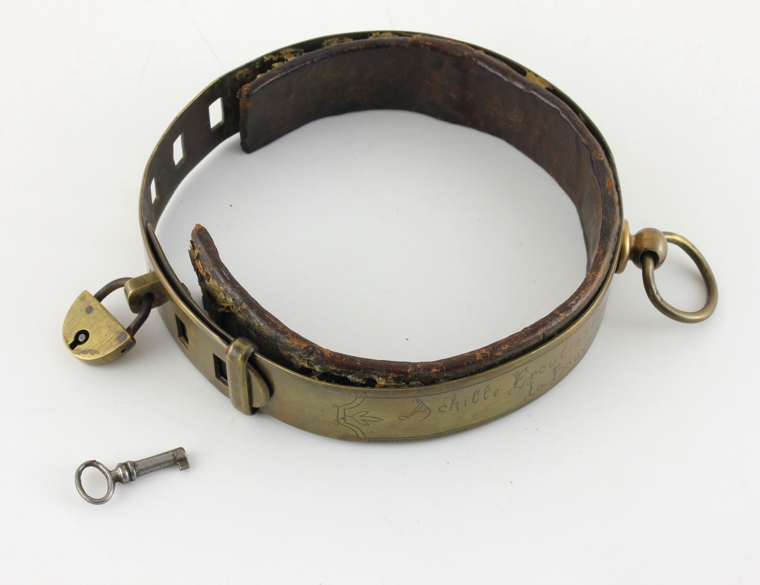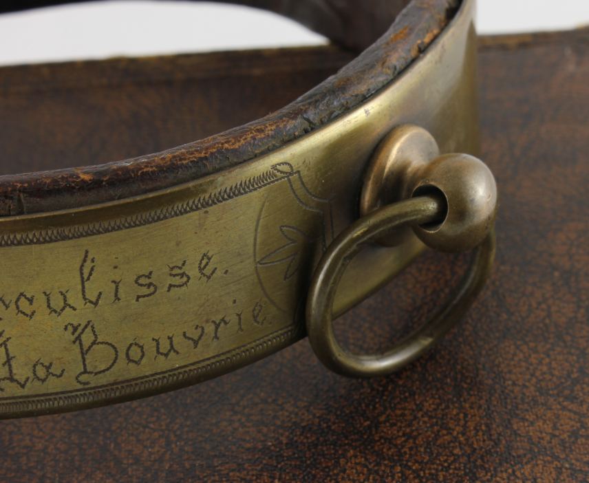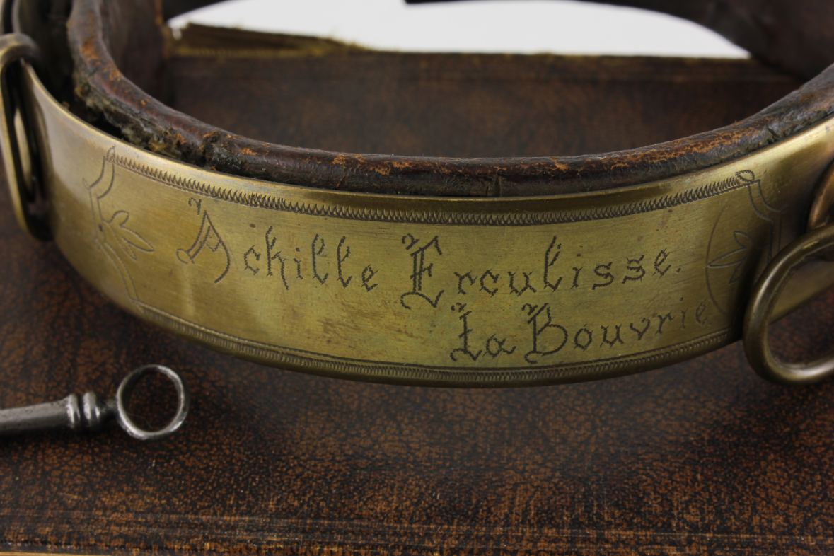 This handsome collar has a leather lining which is in very good condition, a padlock, ring and an engraving that reads Achille Erculisse. La Bouvrie.