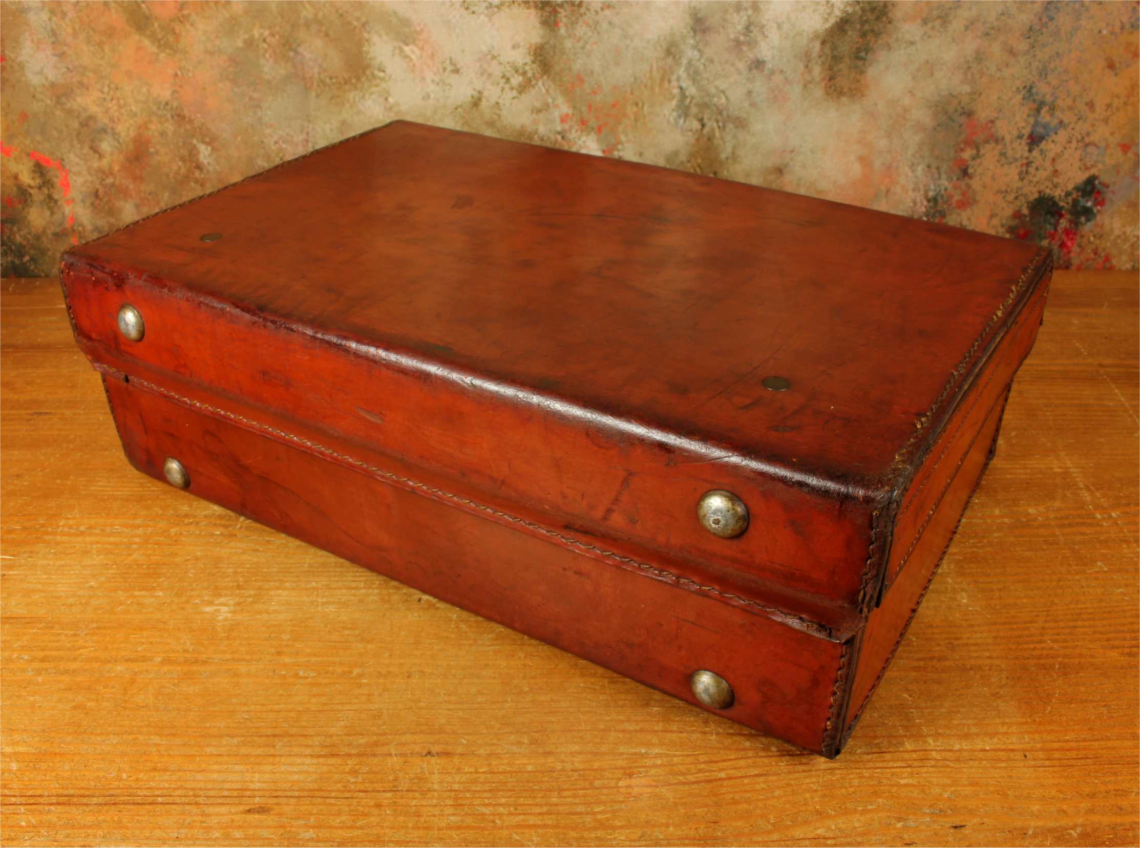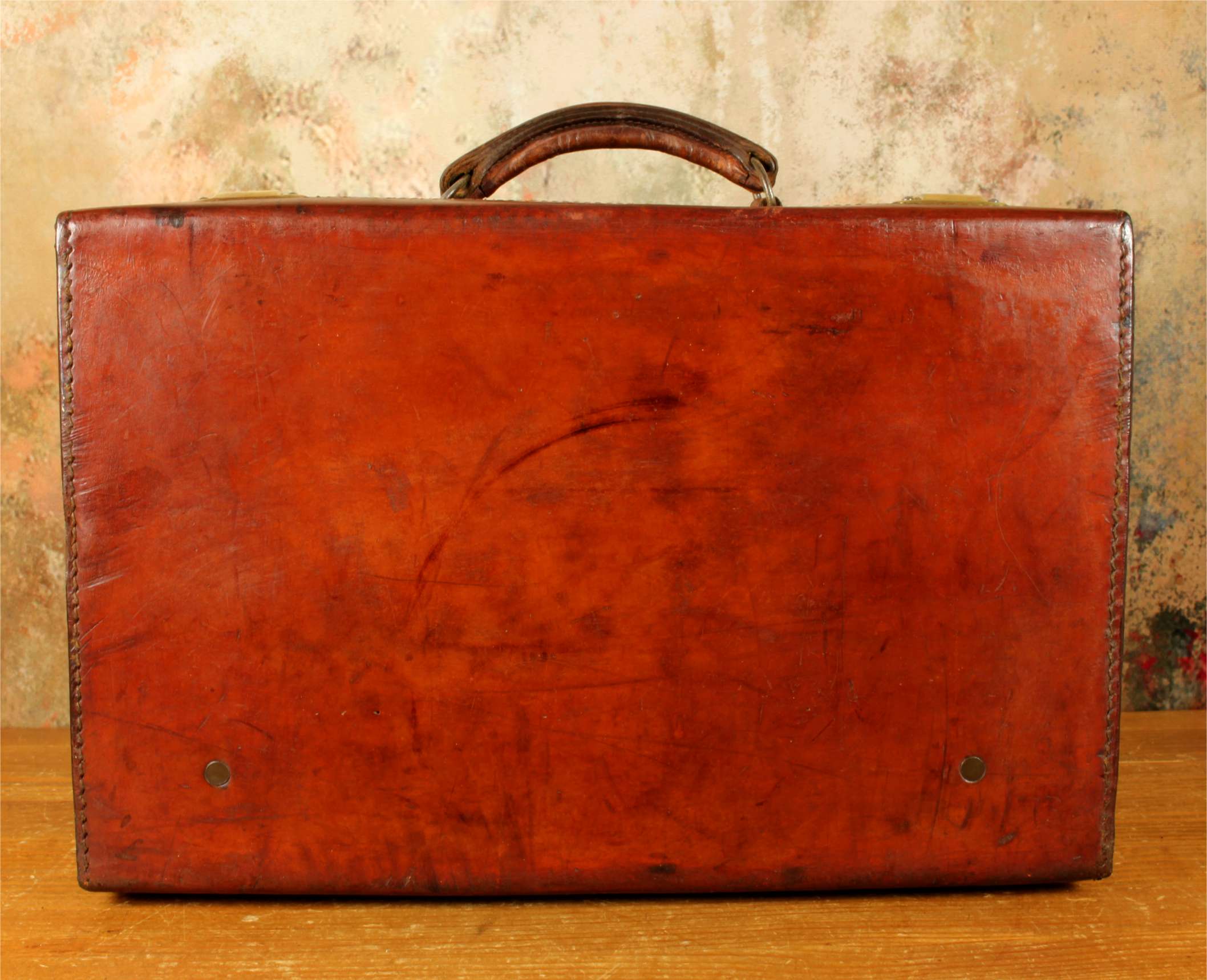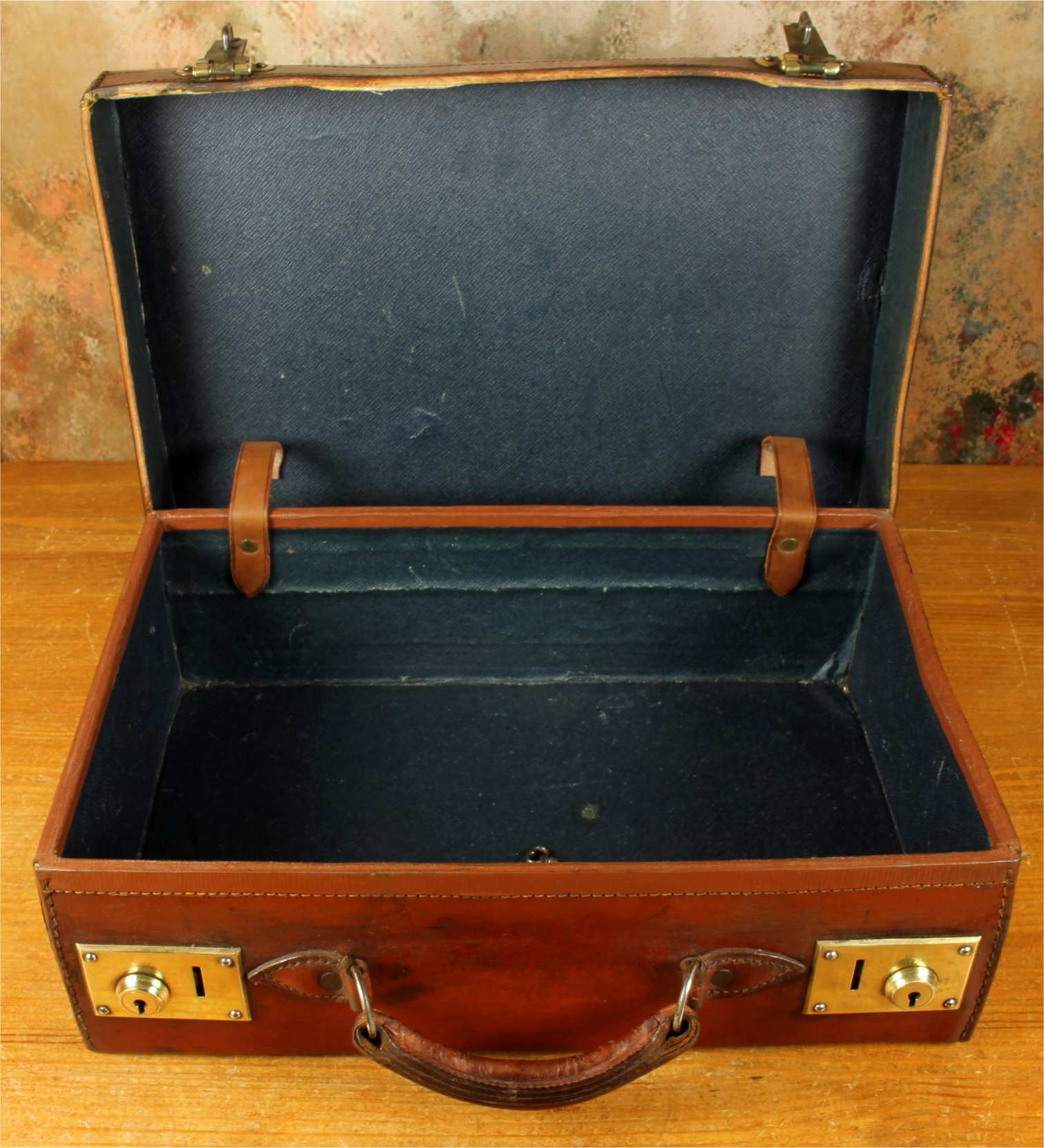 Condition: Excellent used antique condition with signs of use in keeping with age. Some age related wear and nice patina. The case is very sound and usable with good stitching, strong handle and corners. Locks work and we have the key. A few marks to inside. Please see pictures.
