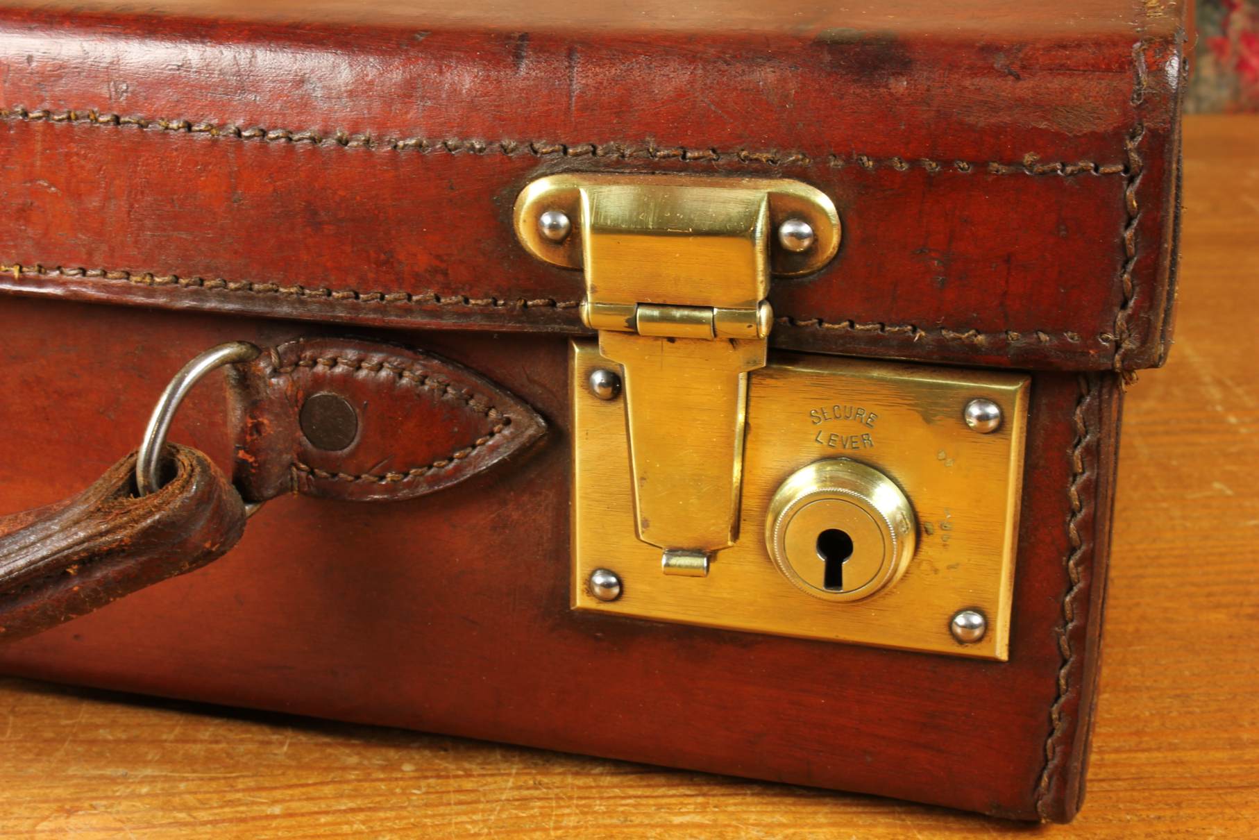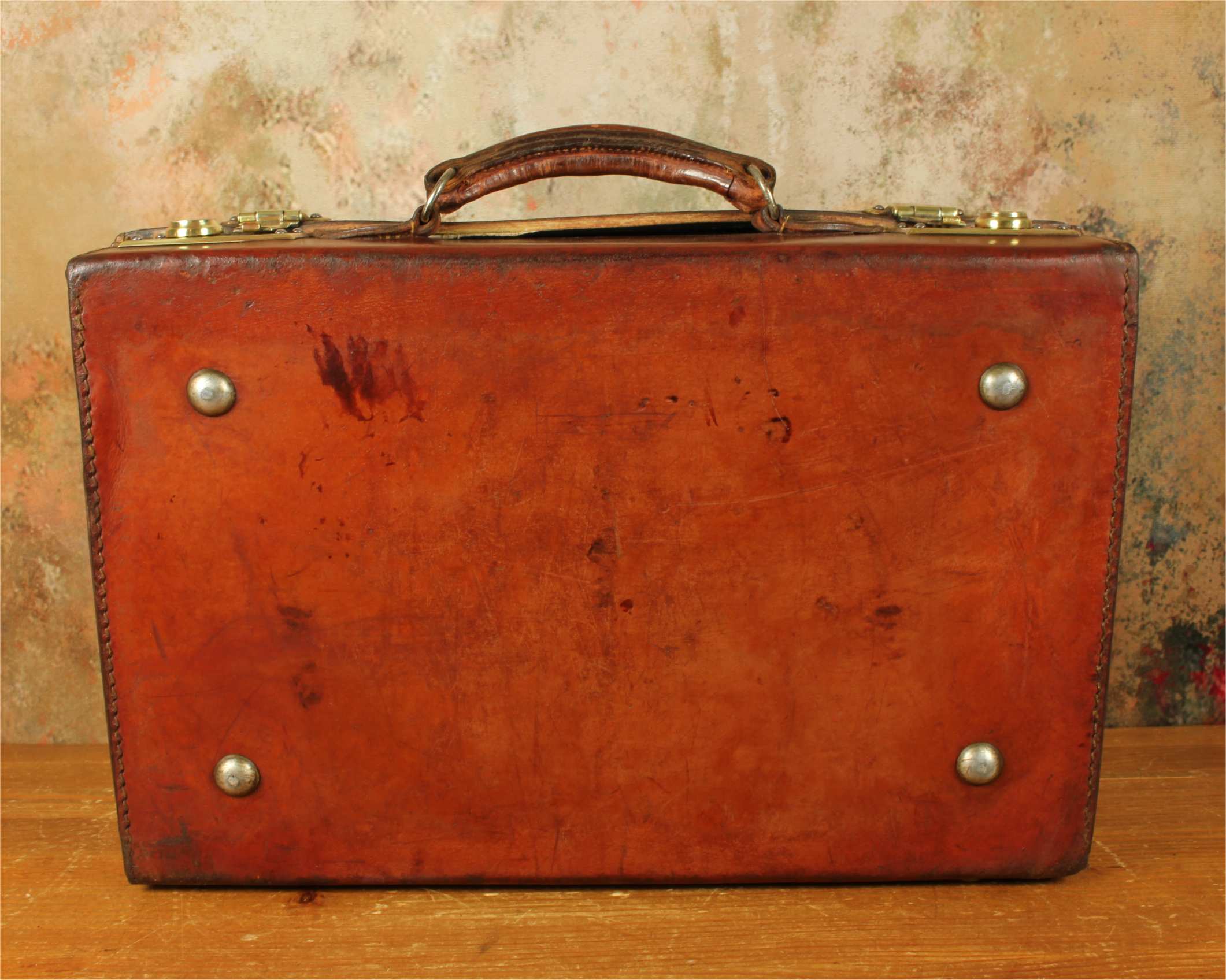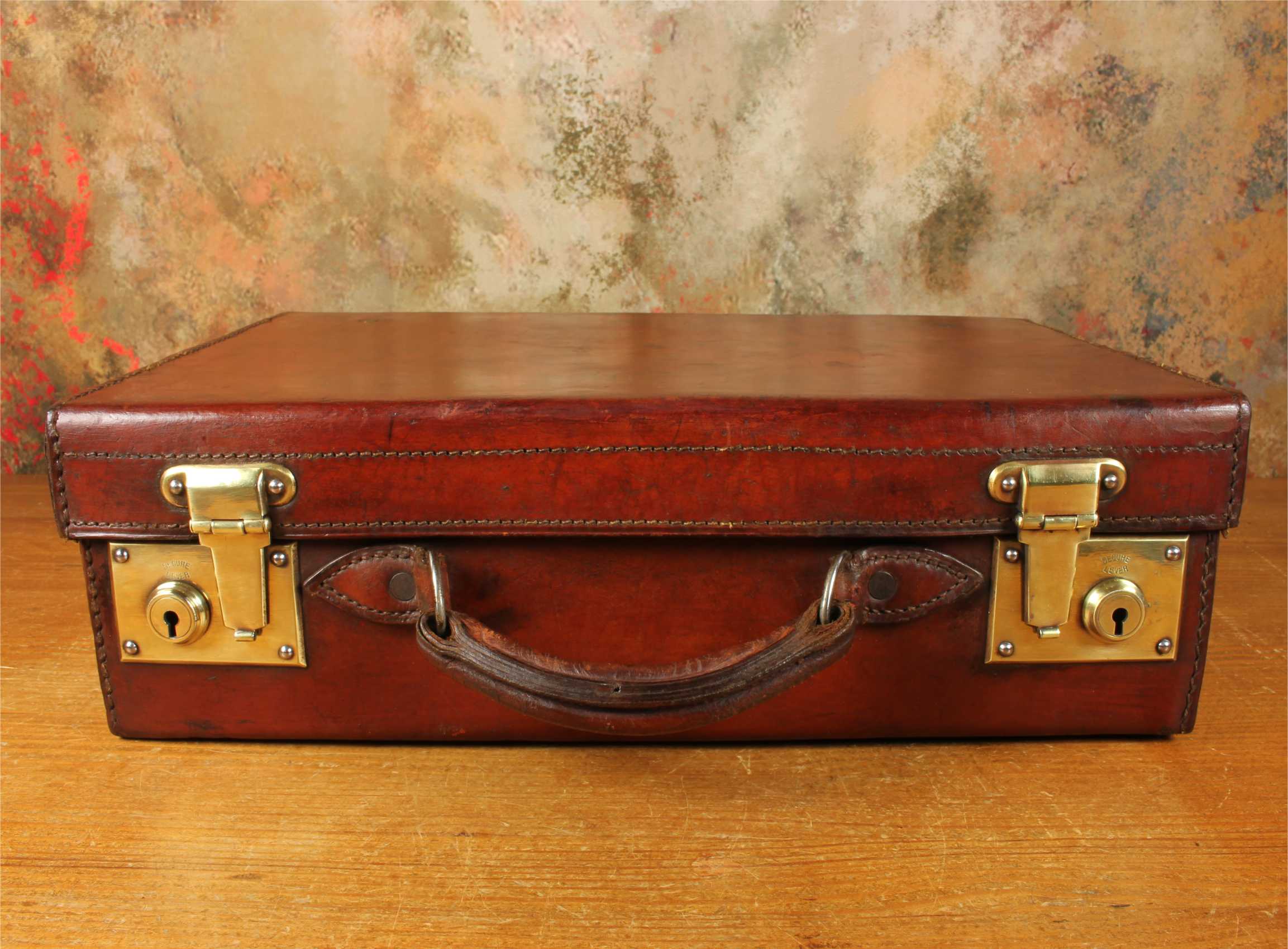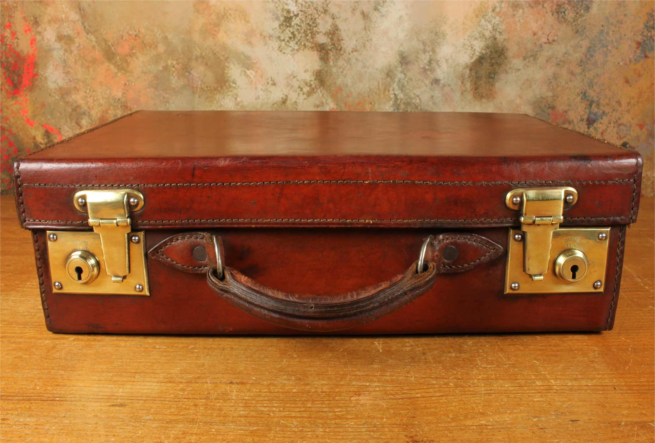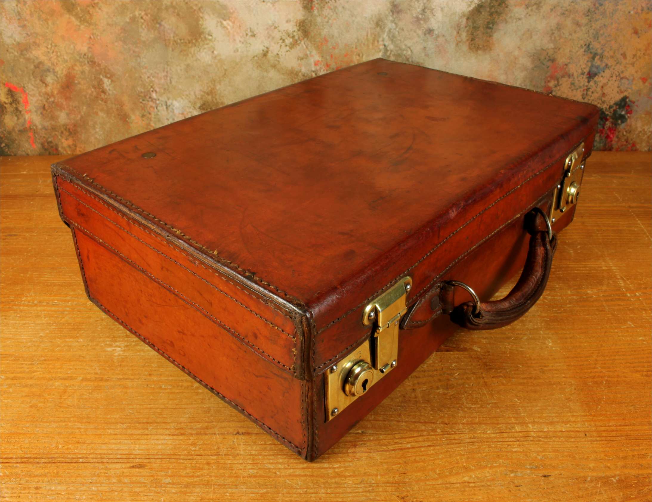 This handsome antique leather small size case which would make an excellent briefcase is made from high quality leather, has a stitched leather handle with sturdy brass fittings, two brass locks/clasps and locks with the key.